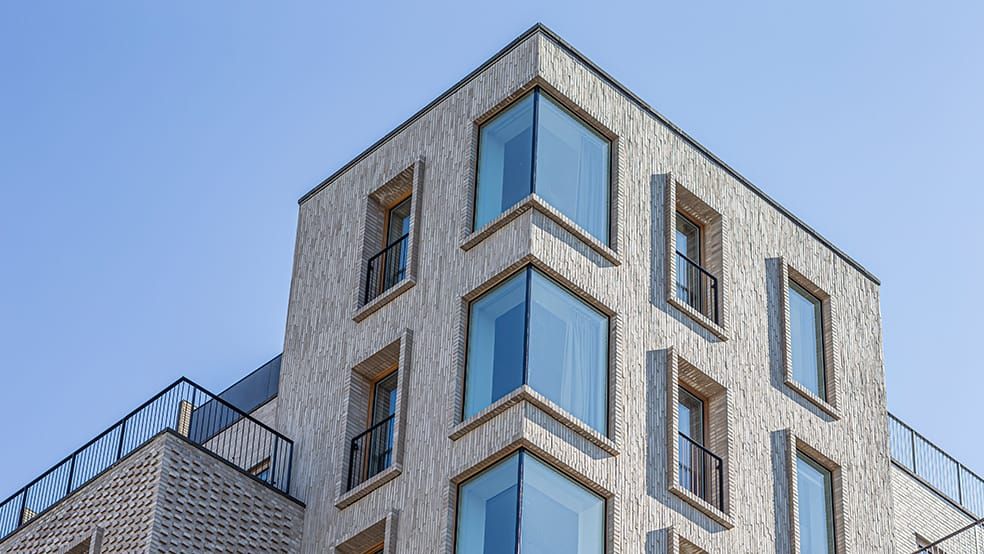 "Vi lät specialtillverka tegelskal och använde dem som vädersköld. På den högsta byggnaden skar vi tegelskal baserat på de standardtegel vi använde i hela projektet. Vi limmade sedan fast dessa på en ljus och luftig fasad för att reducera byggnadens vikt. Där vi inte kunde lägga tegelstenar använde vi murskalen, detta för att få hela byggnaden att framstå som en enda sammanhängande helhet och inte en som är uppbruten, så att säga, som ett resultat av användning av andra byggmaterial... Kostnaderna var desamma som de skulle ha varit om vi byggt en struktur med tung tegelfasad."