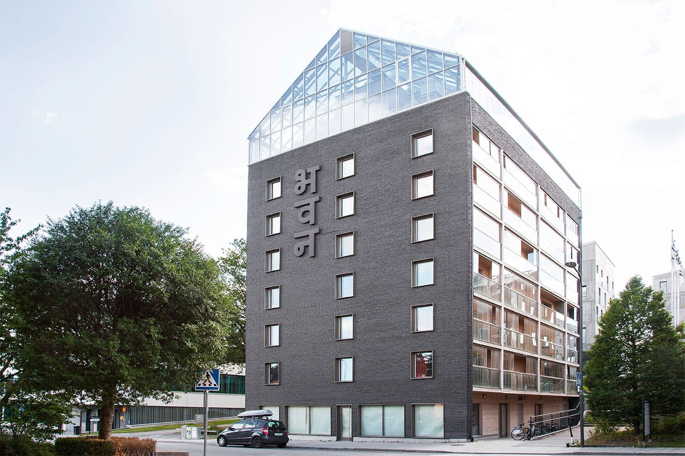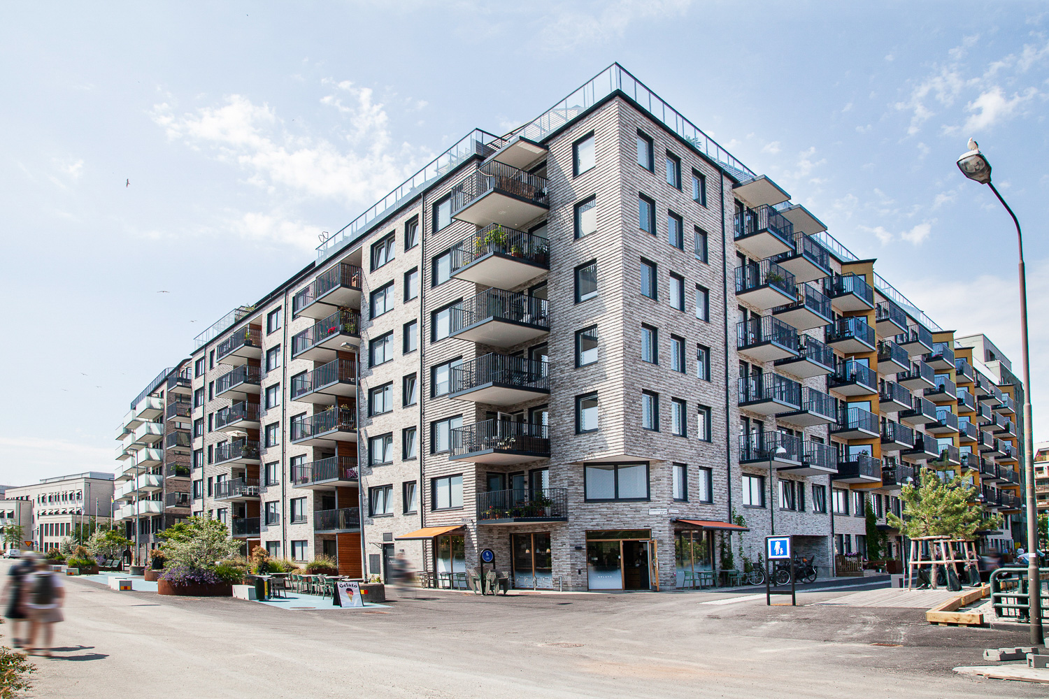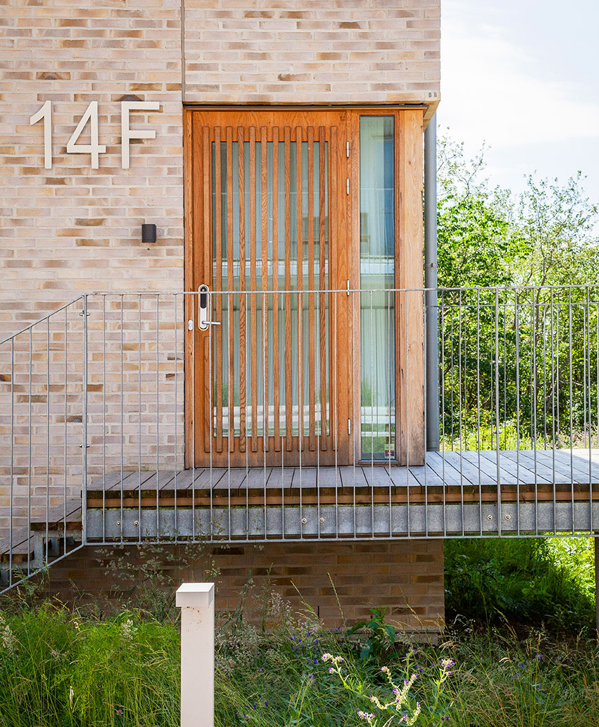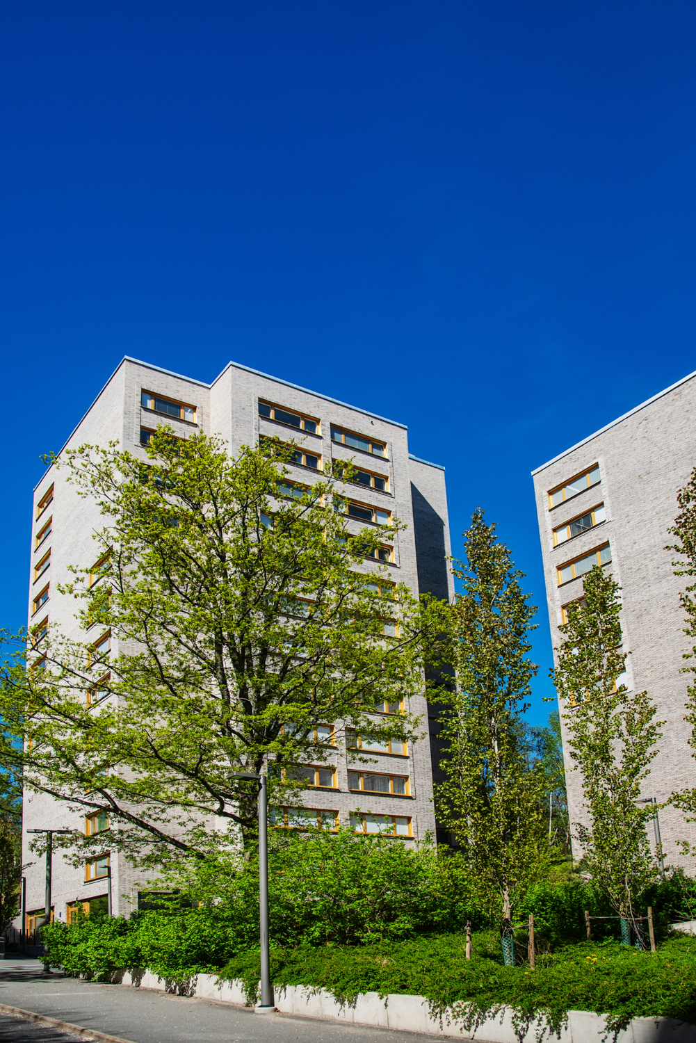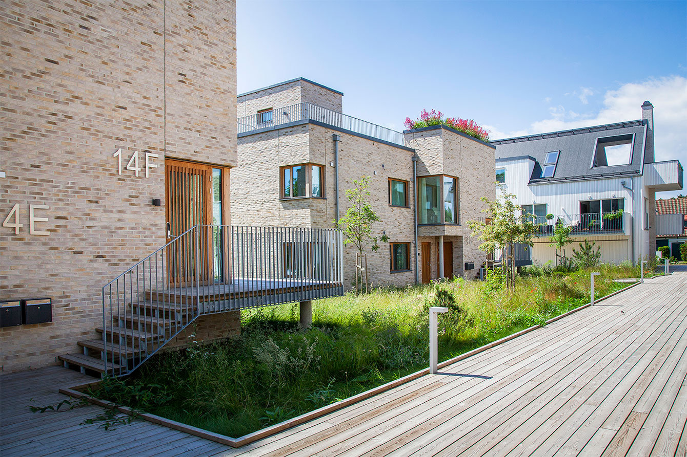 A lovely apartment house that dwells together in harmony with the surrounding greens and common gardens. Bright yellow brick colours, beautiful wooden details and roof gardens create an appealing and relaxing atmosphere.