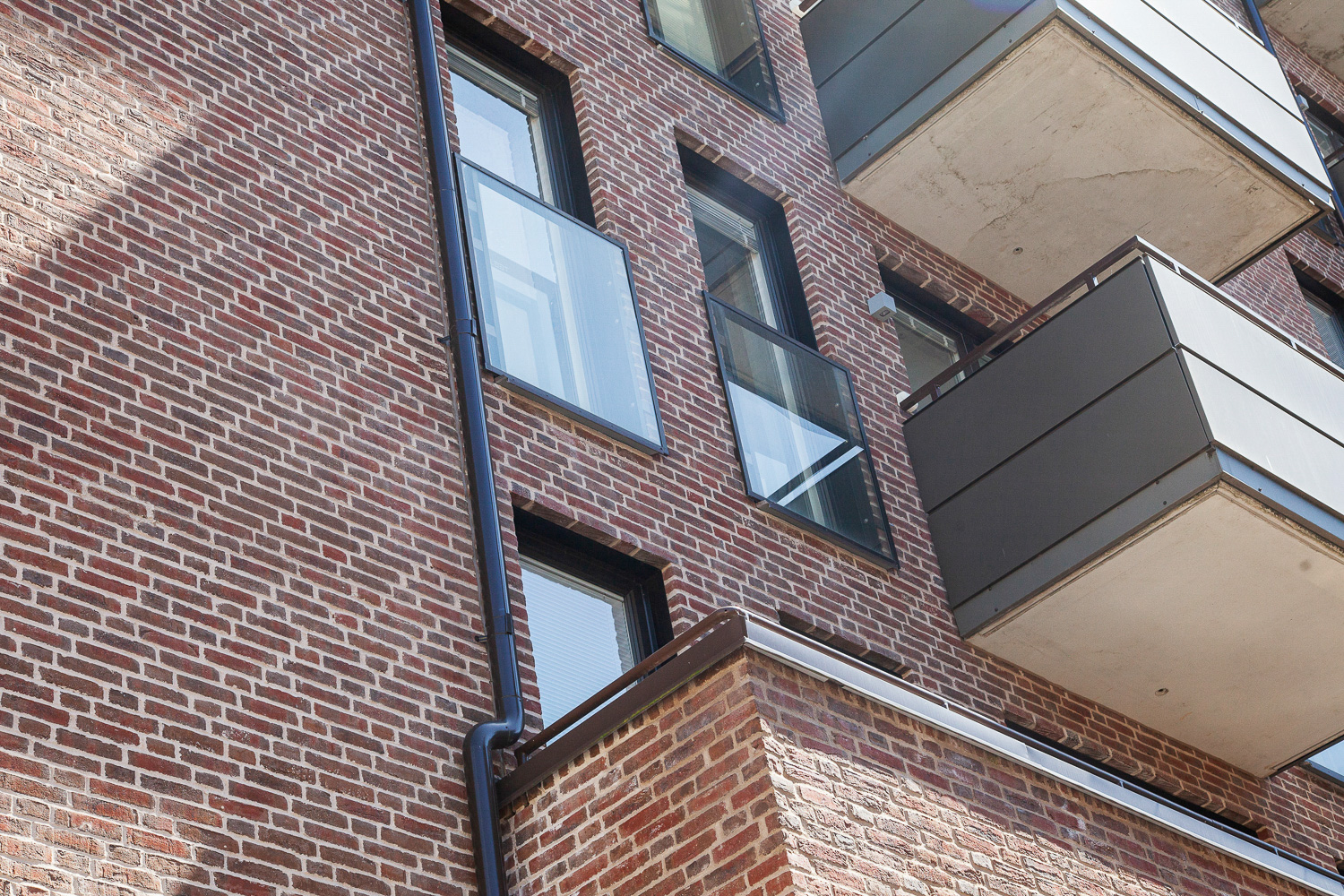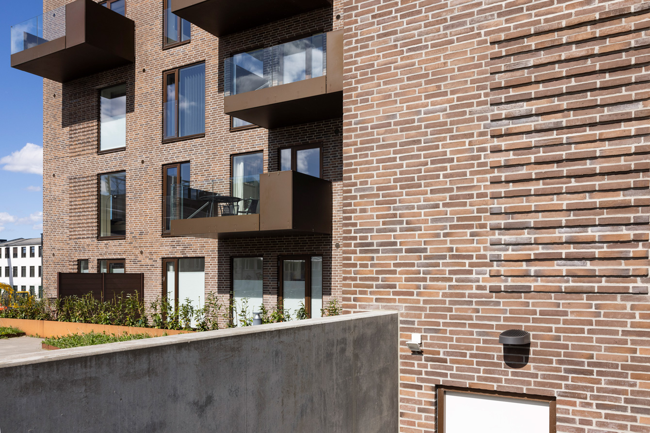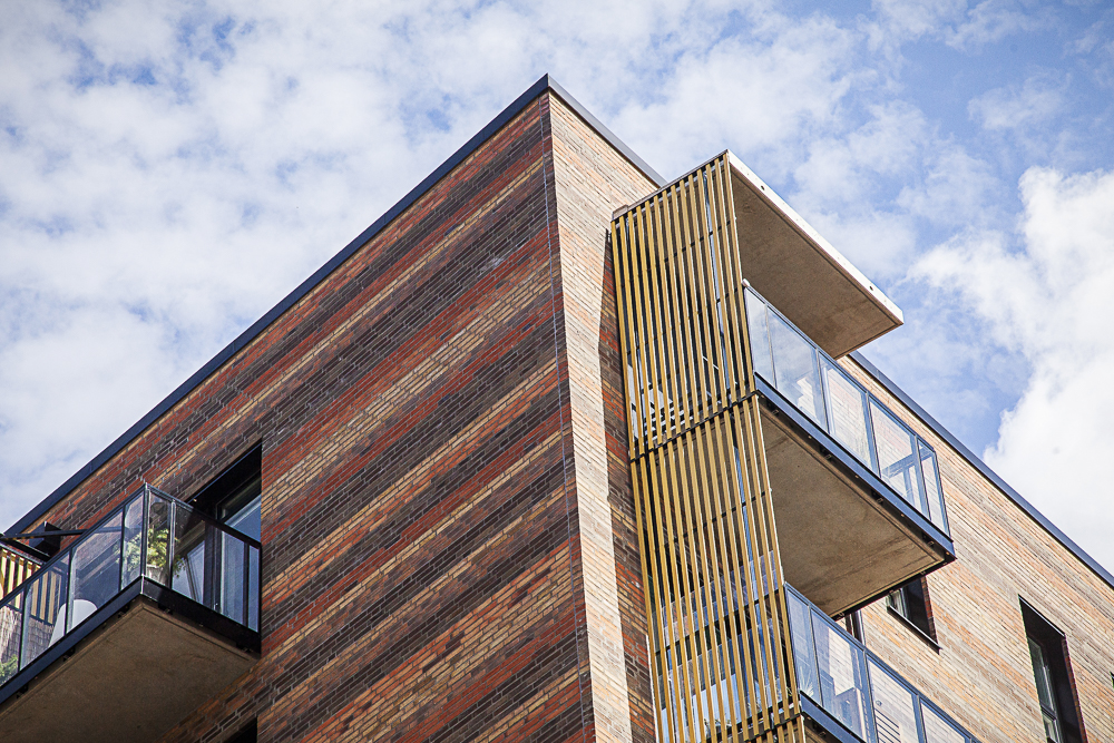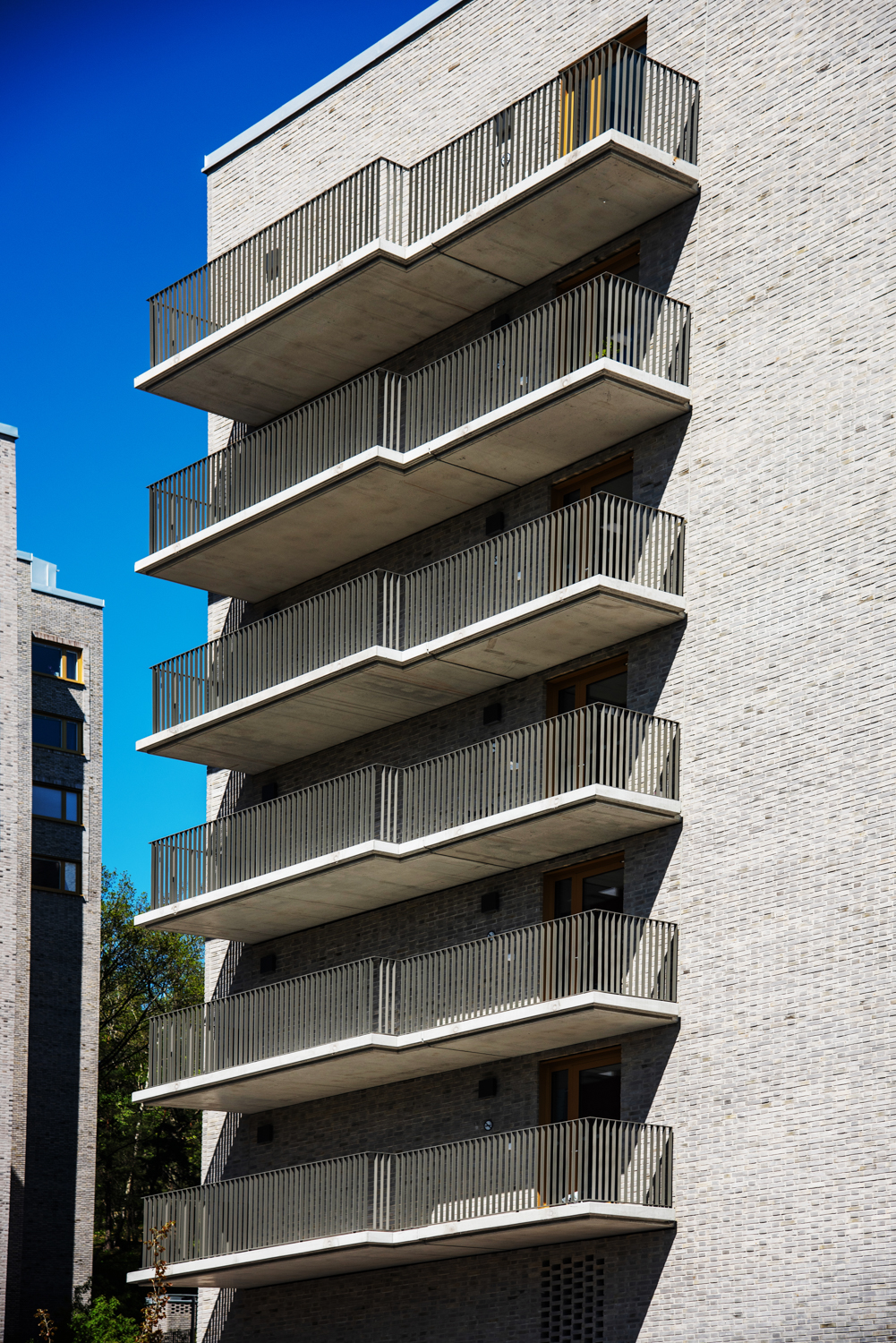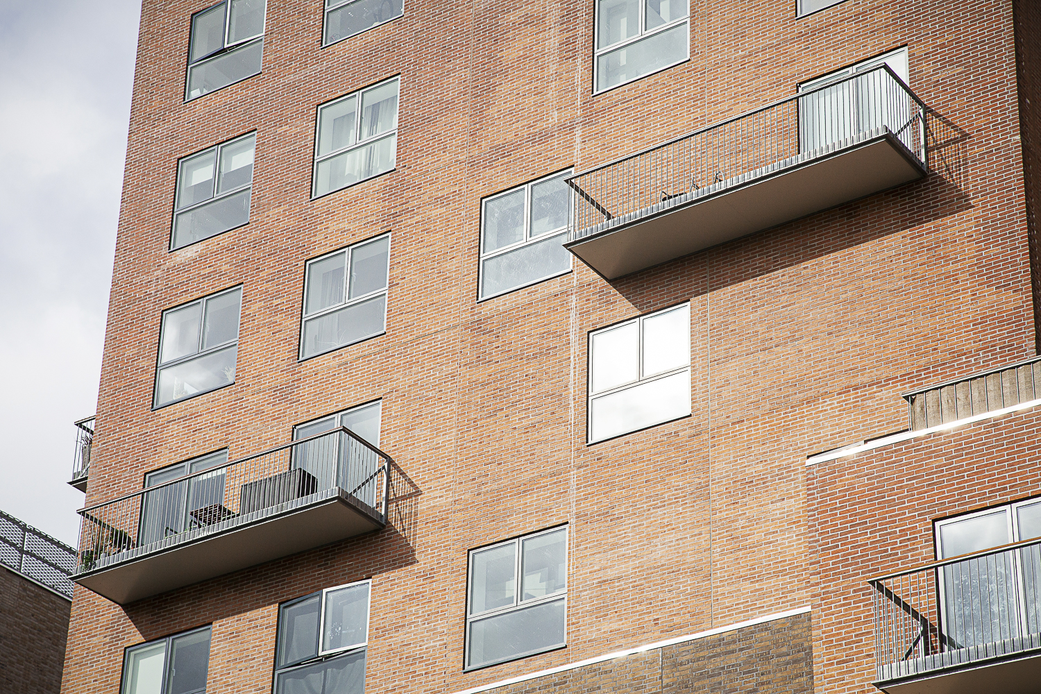 Balkongerna utgör en naturlig del av byggnadens karaktäristiska form. Med ett starkt formspråk skapar teglet en robusthet i omgivningarna.