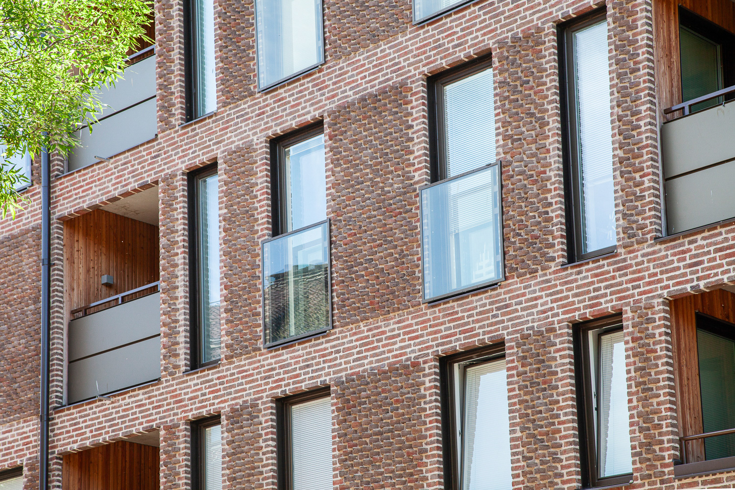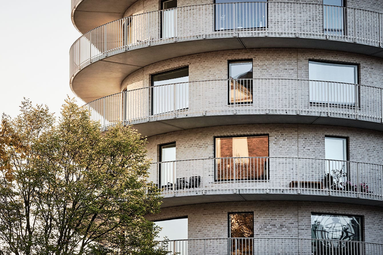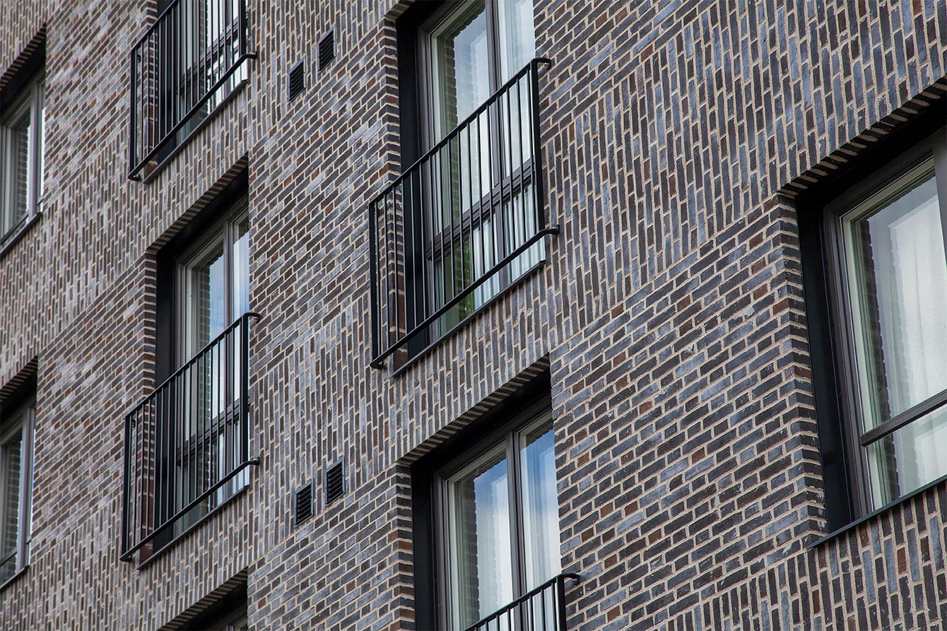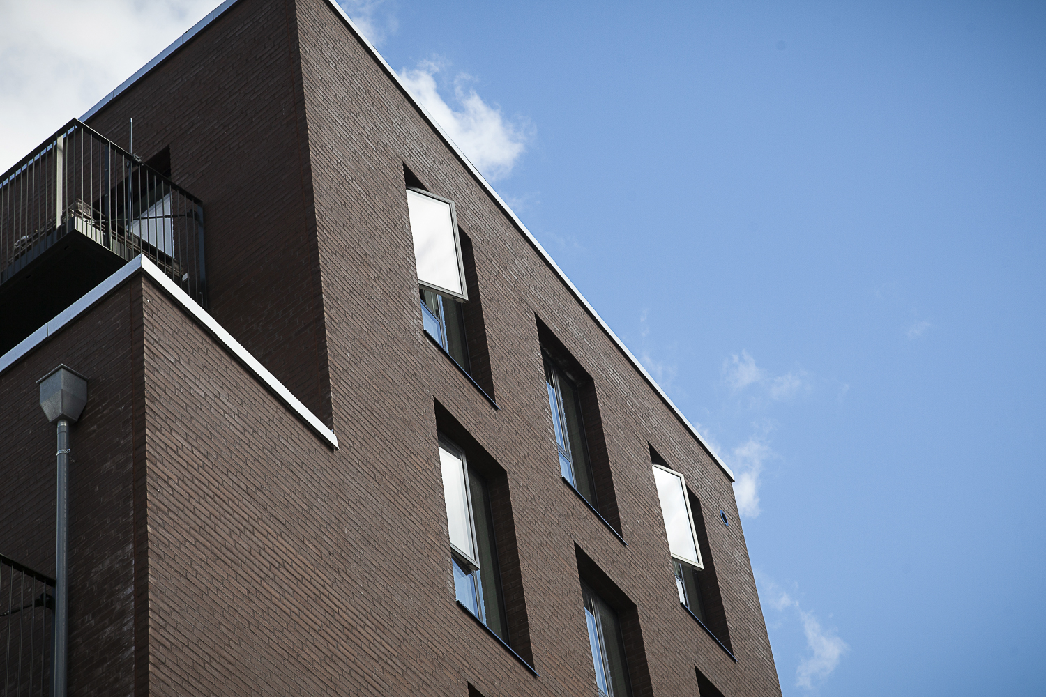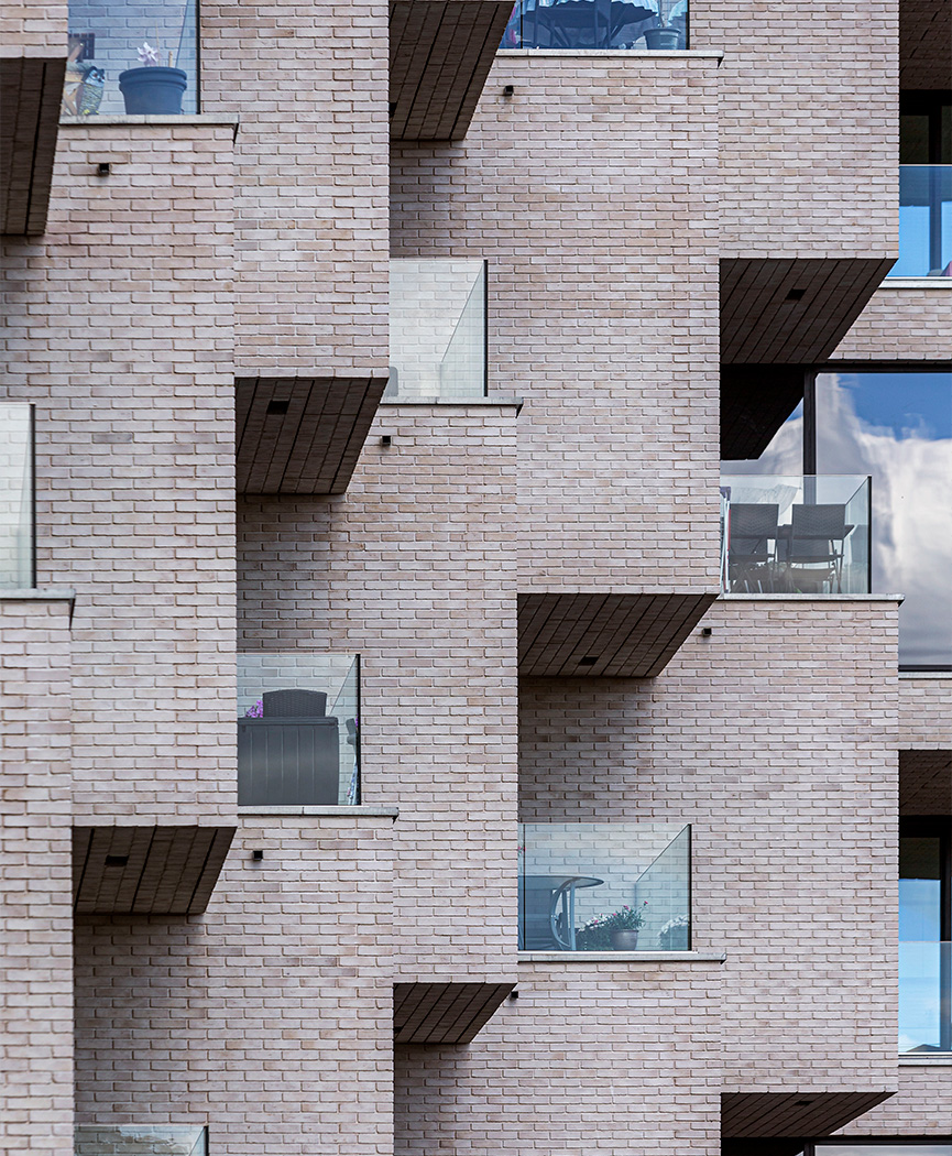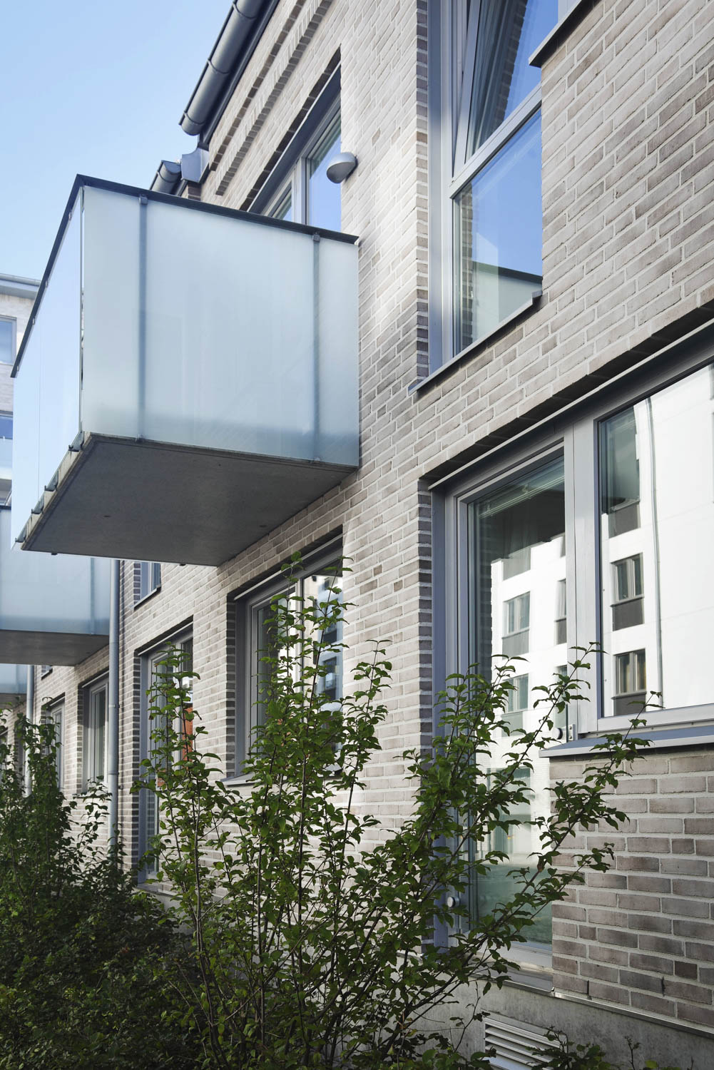 Balkongerna utgör en naturlig del av byggnadens karaktäristiska form. Med ett starkt formspråk skapar teglet en robusthet i omgivningarna.