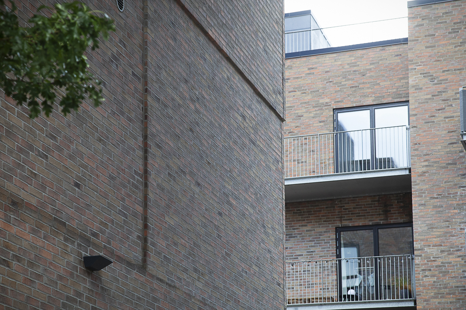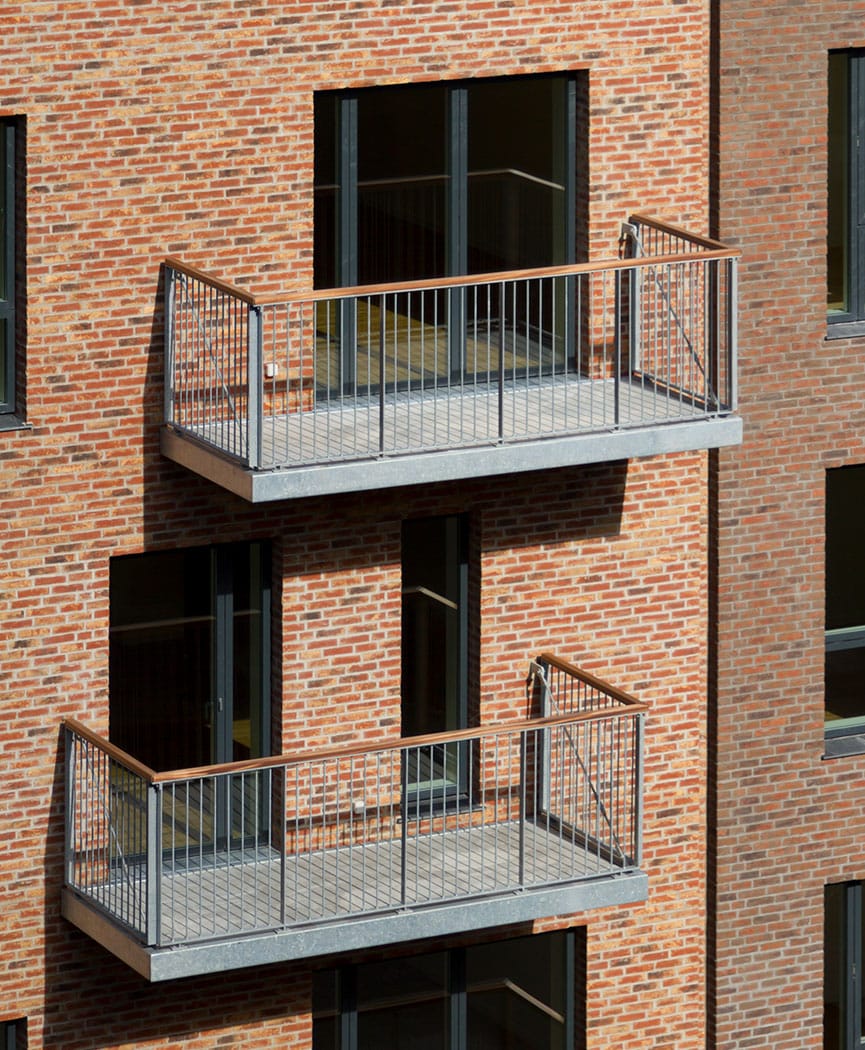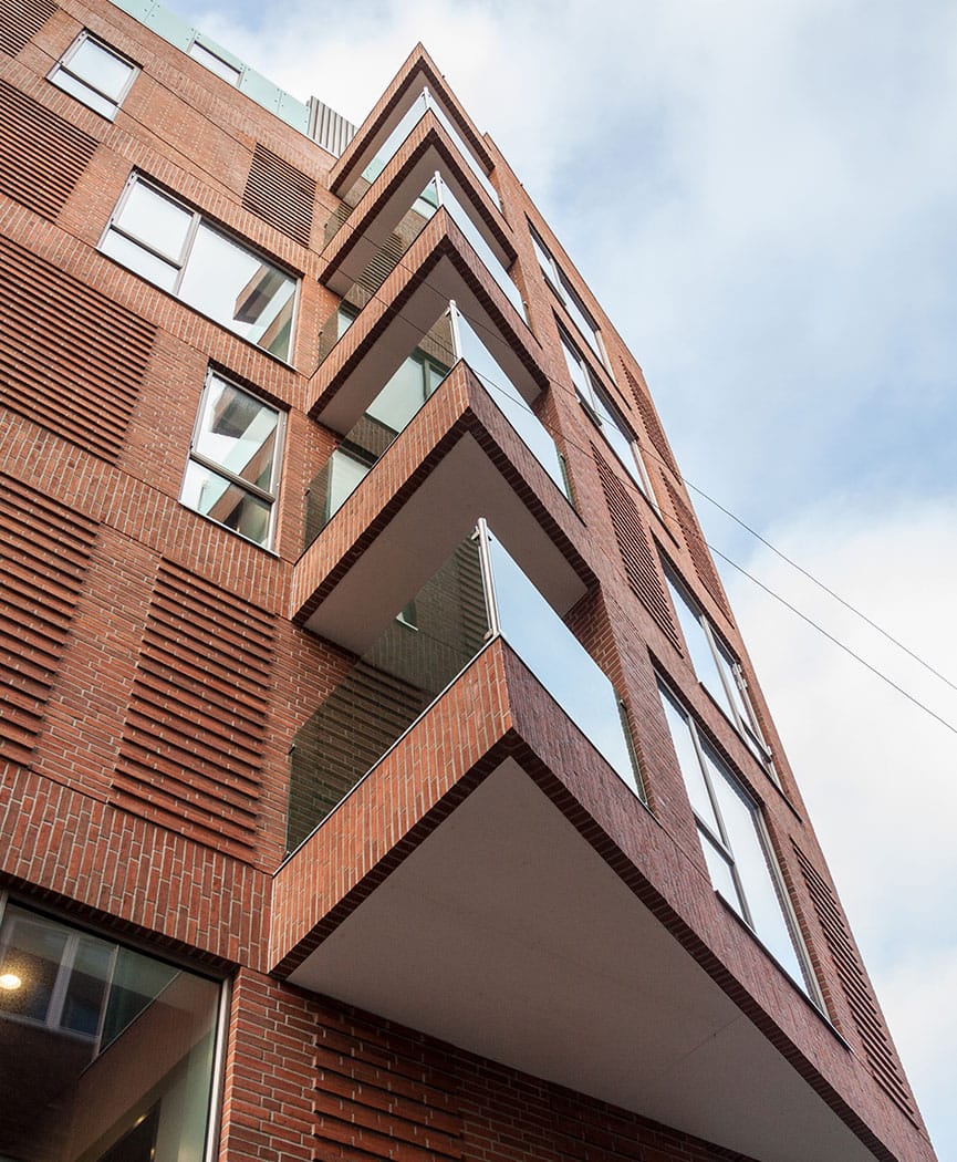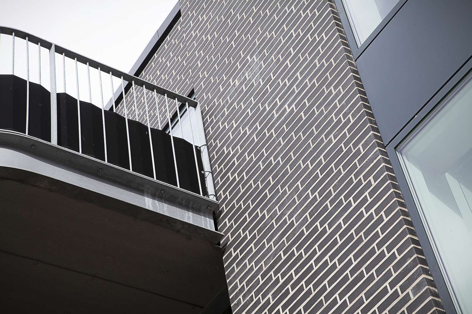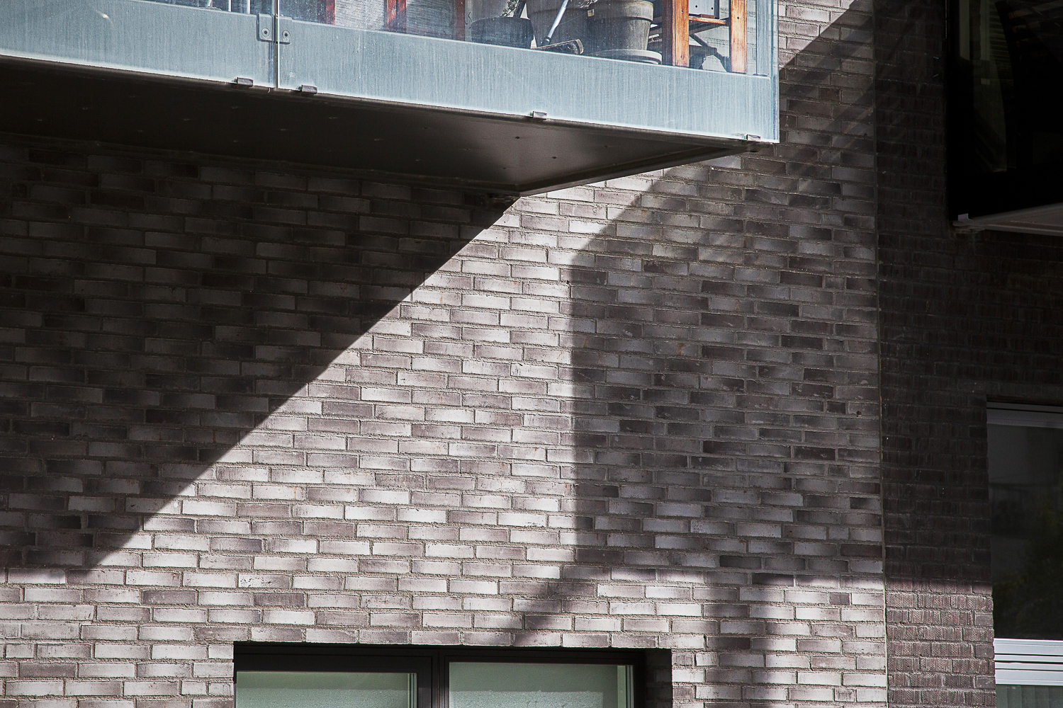 Balkongerna utgör en naturlig del av byggnadens karaktäristiska form. Med ett starkt formspråk skapar teglet en robusthet i omgivningarna.