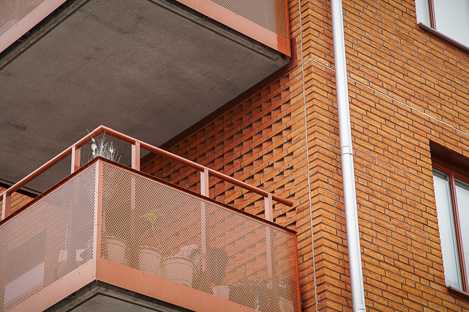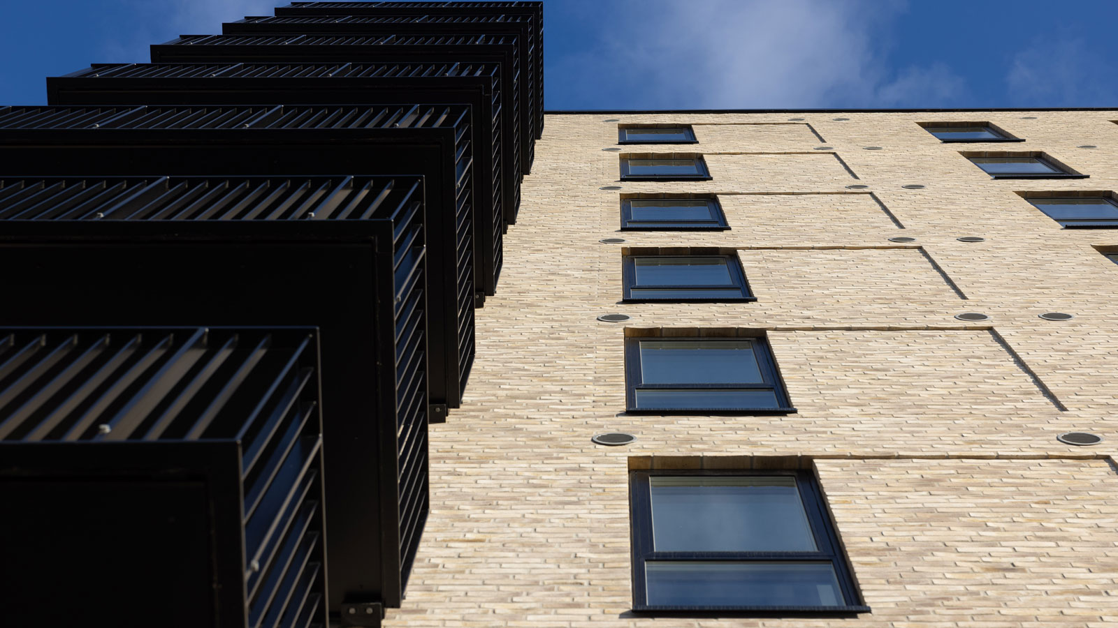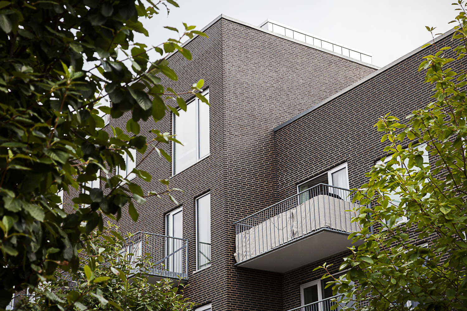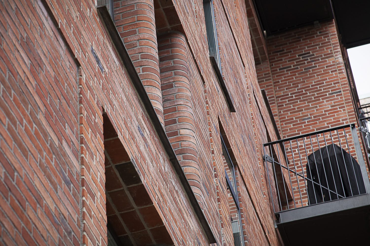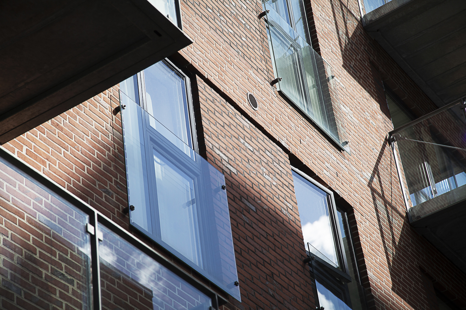 Balkongerna utgör en naturlig del av byggnadens karaktäristiska form. Med ett starkt formspråk skapar teglet en robusthet i omgivningarna.