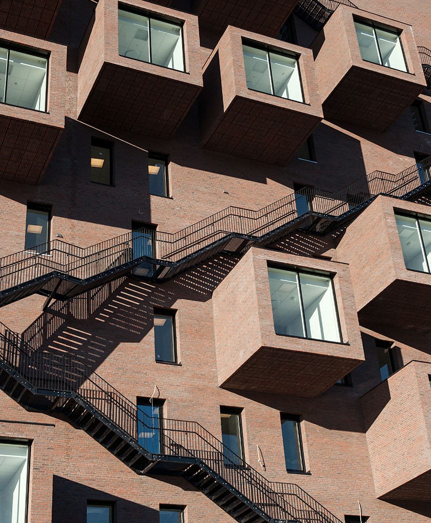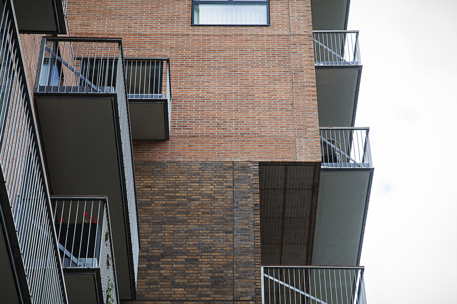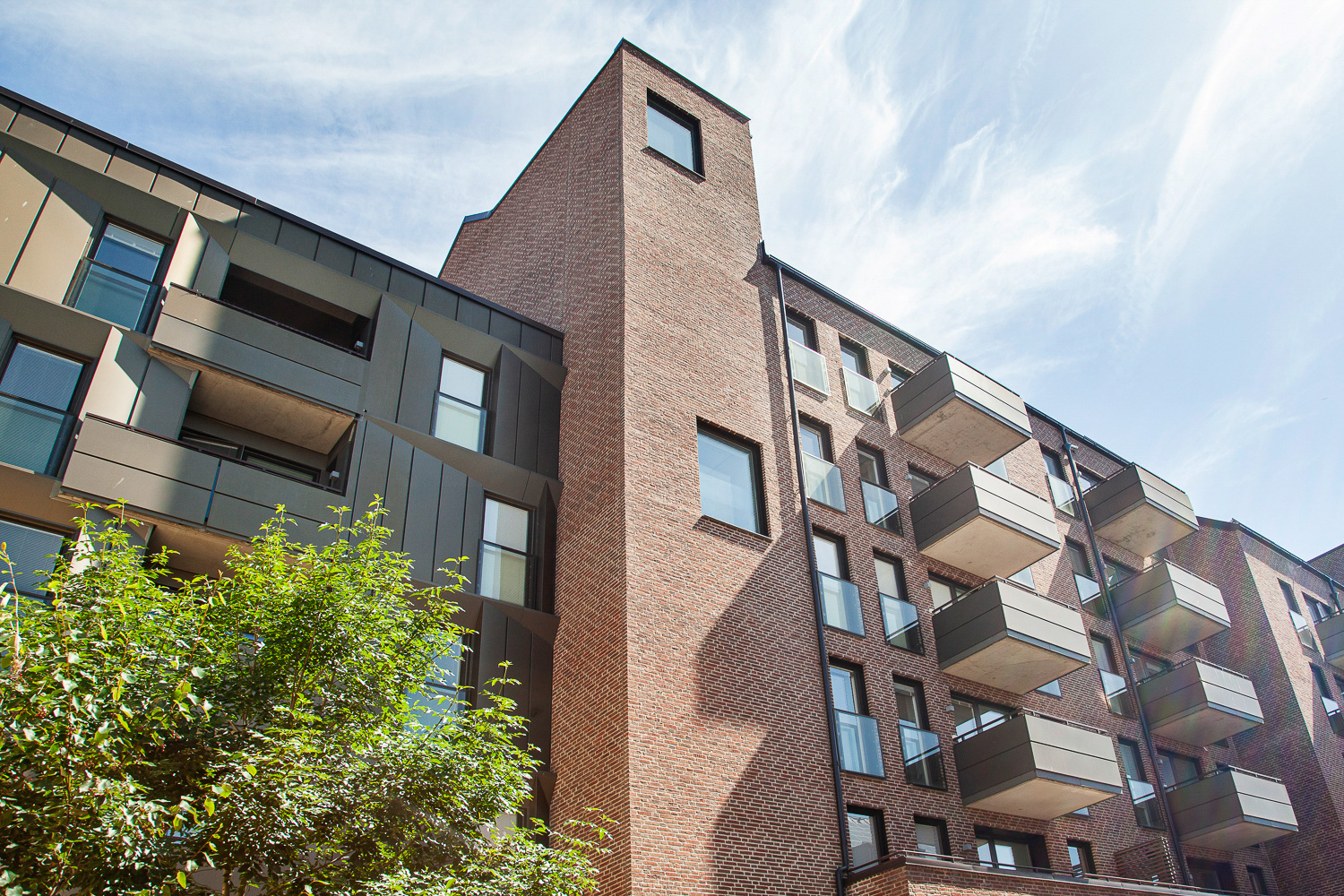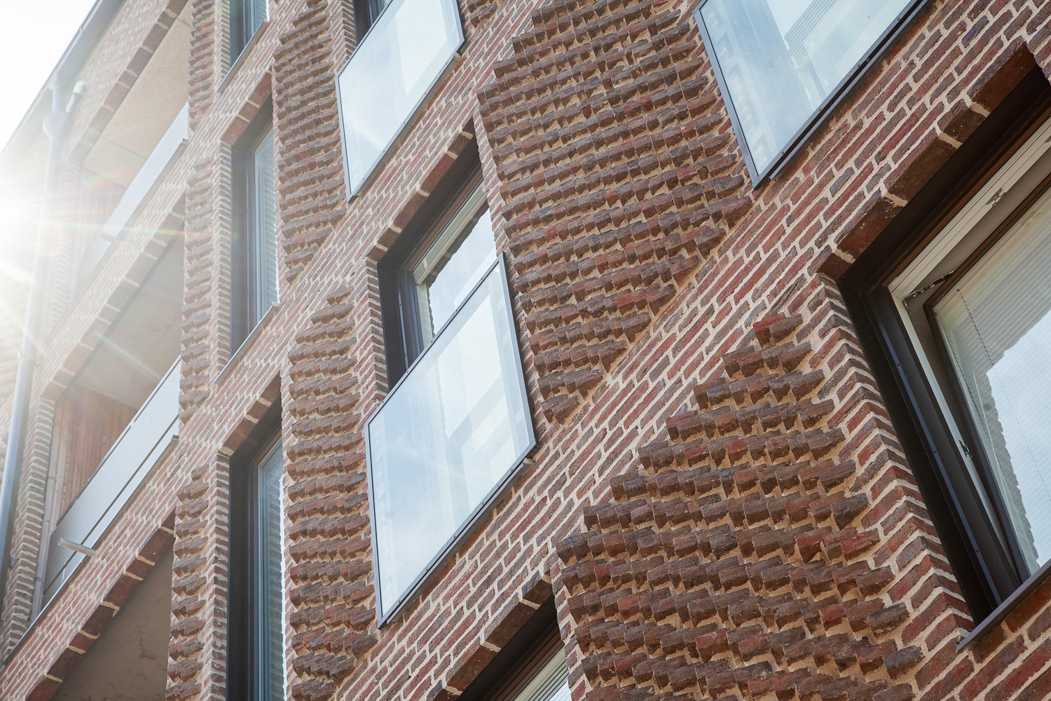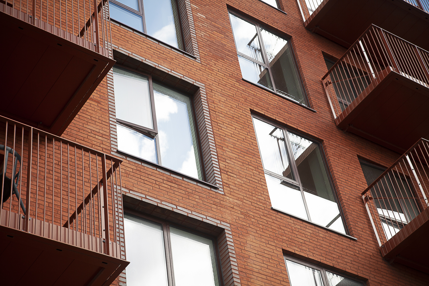 Balkongerna utgör en naturlig del av byggnadens karaktäristiska form. Med ett starkt formspråk skapar teglet en robusthet i omgivningarna.