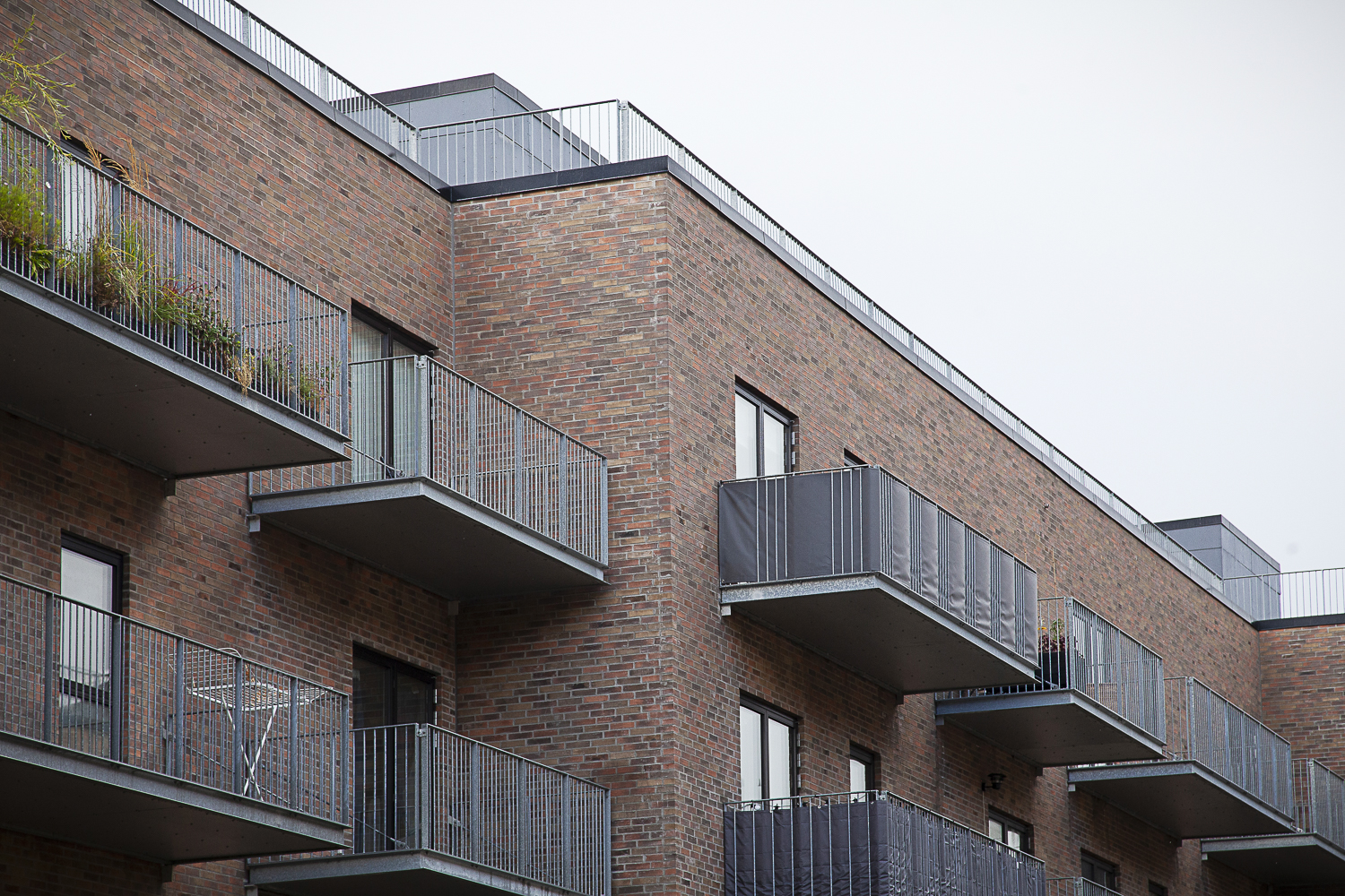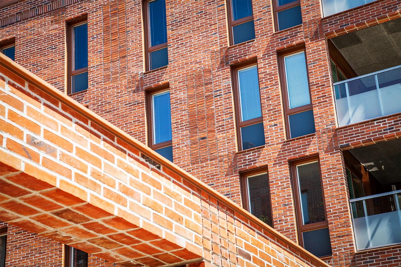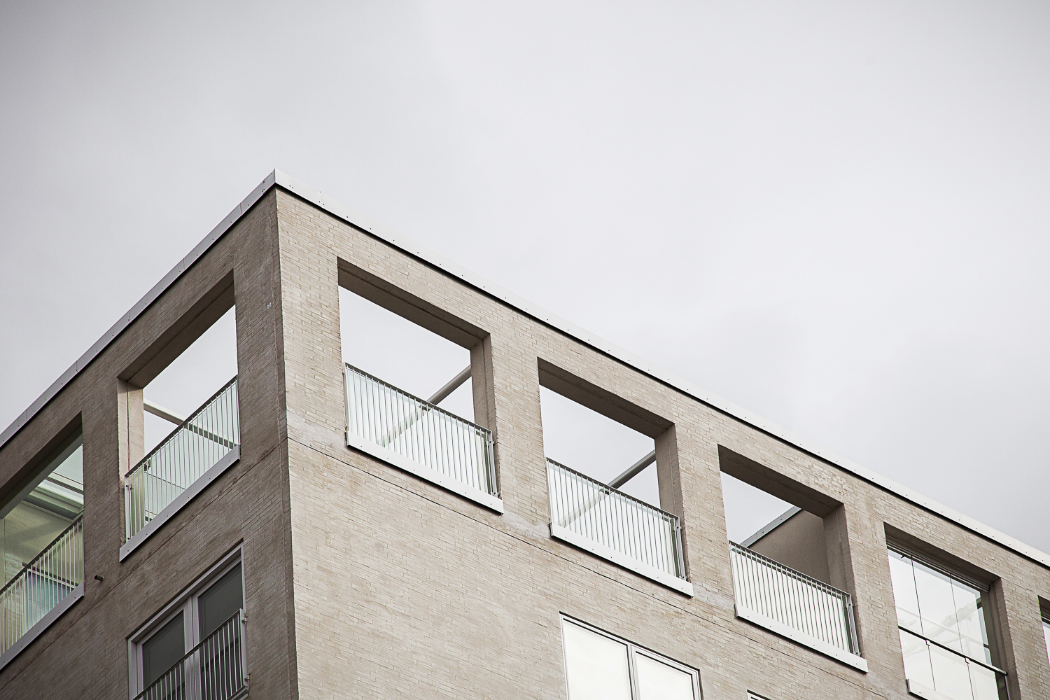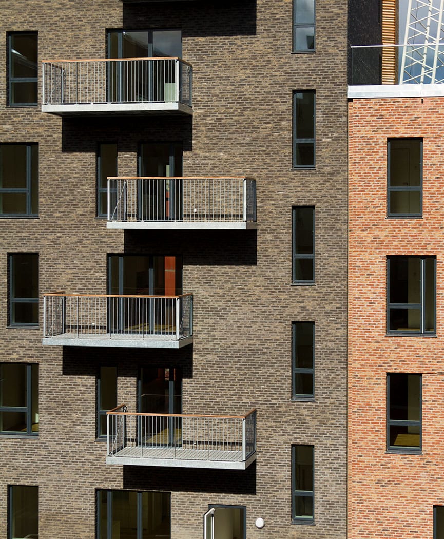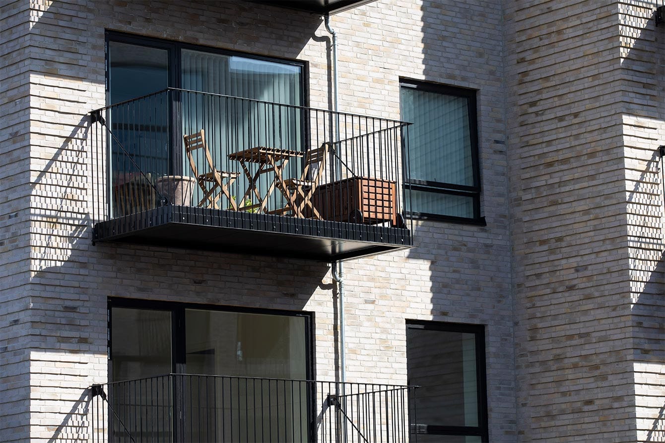 Balkongerna utgör en naturlig del av byggnadens karaktäristiska form. Med ett starkt formspråk skapar teglet en robusthet i omgivningarna.