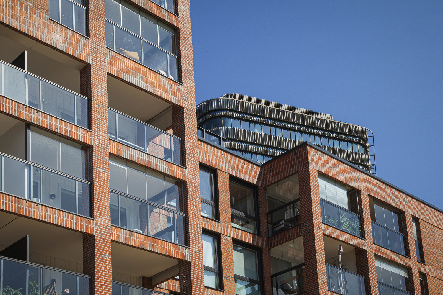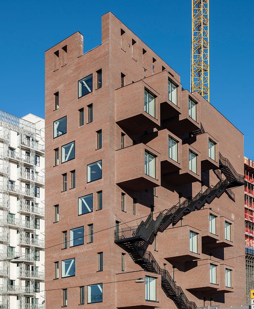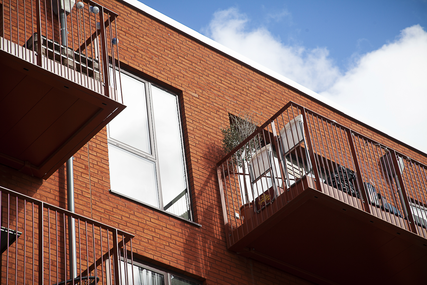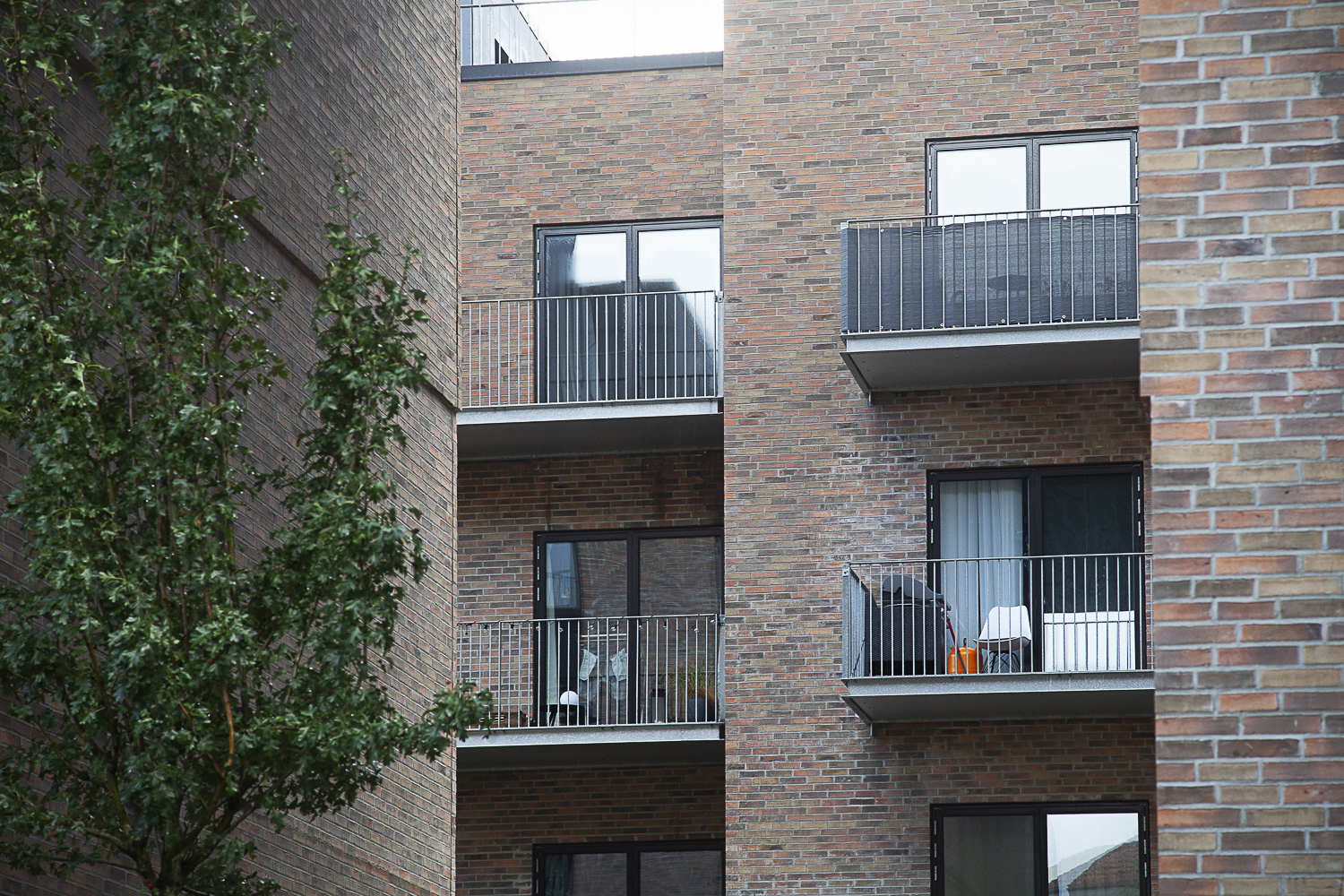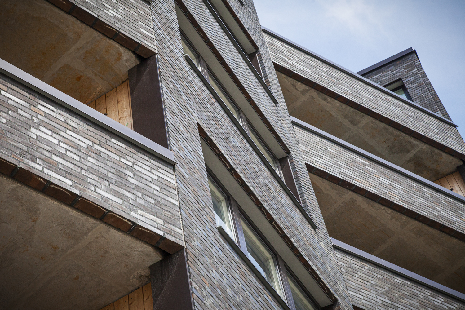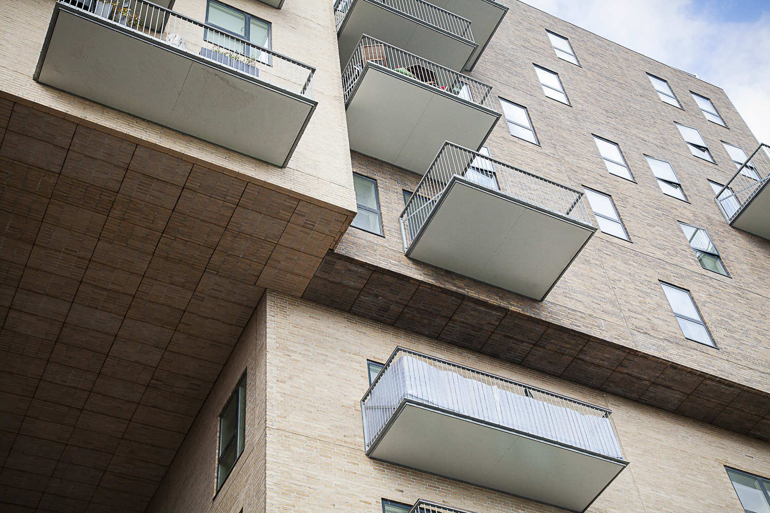 Balkongerna utgör en naturlig del av byggnadens karaktäristiska form. Med ett starkt formspråk skapar teglet en robusthet i omgivningarna.