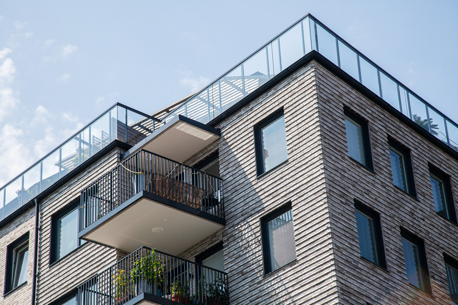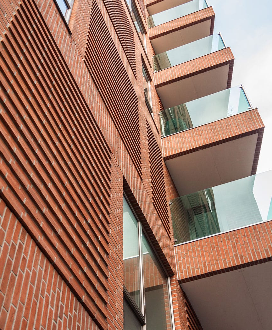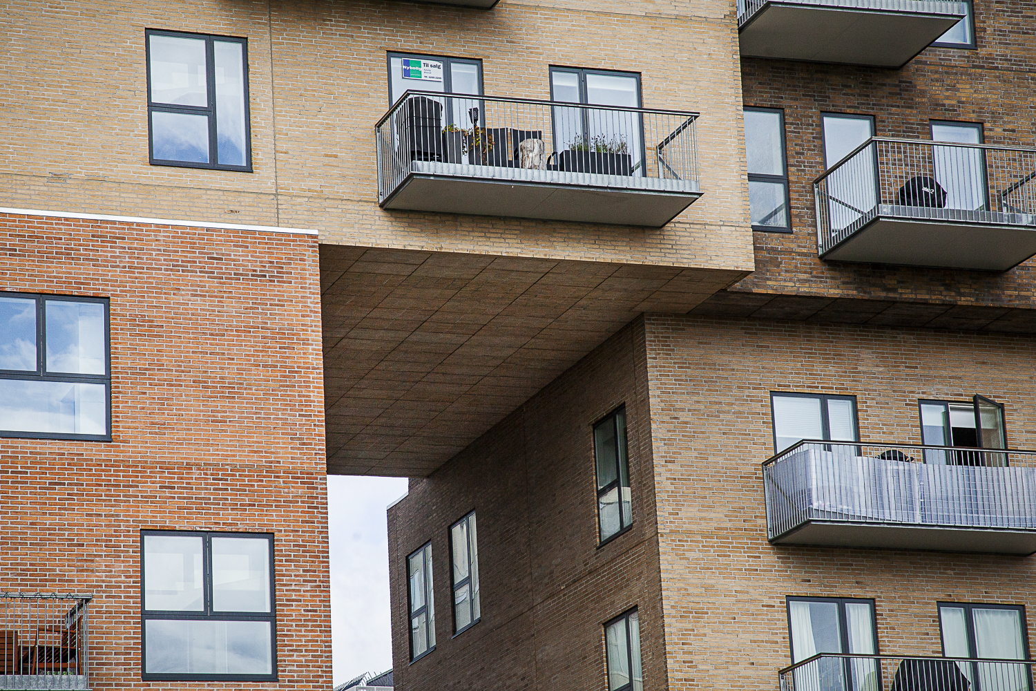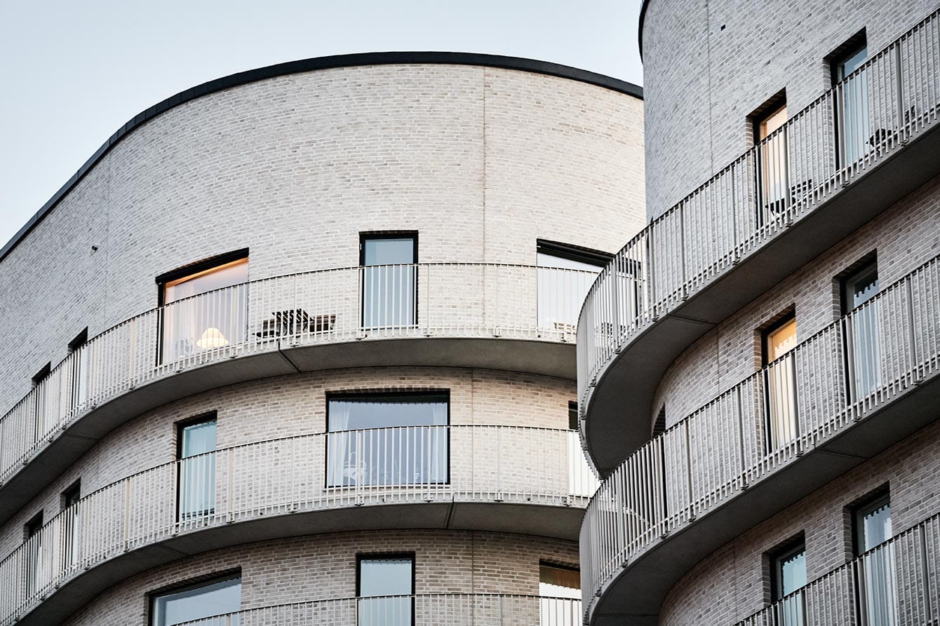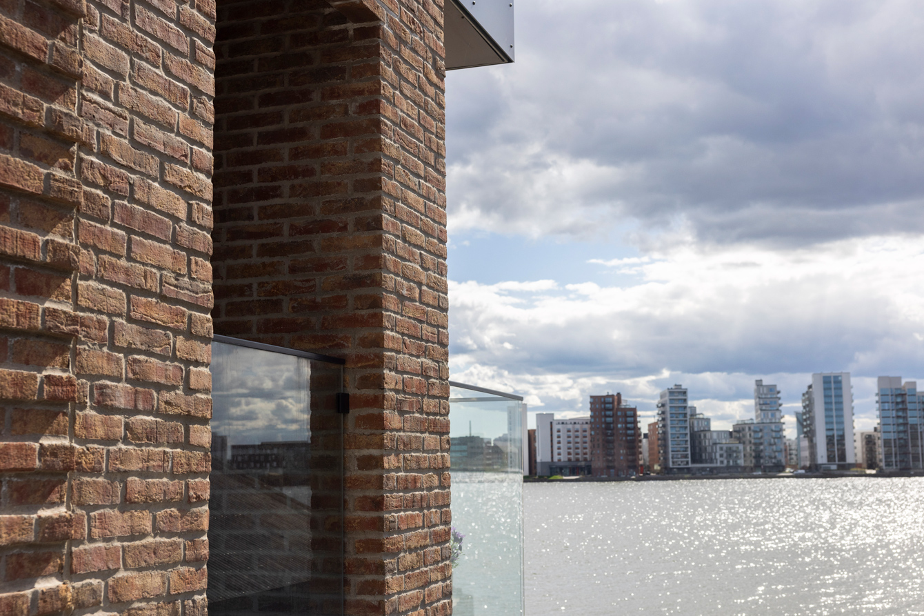 Balkongerna utgör en naturlig del av byggnadens karaktäristiska form. Med ett starkt formspråk skapar teglet en robusthet i omgivningarna.