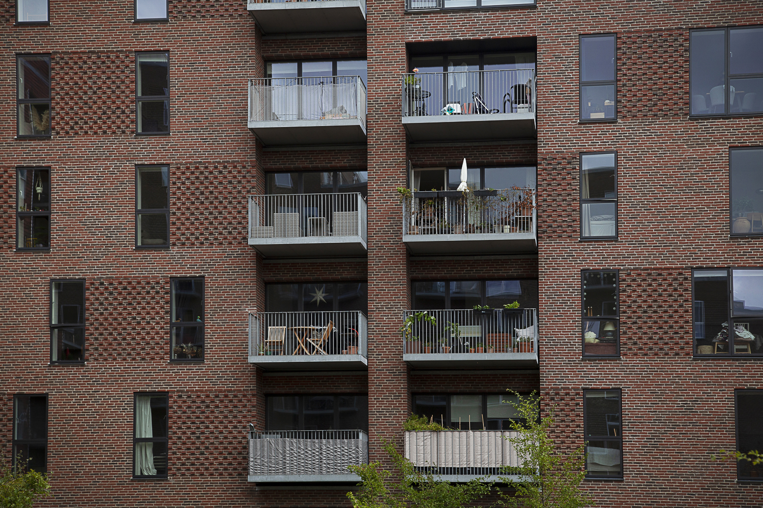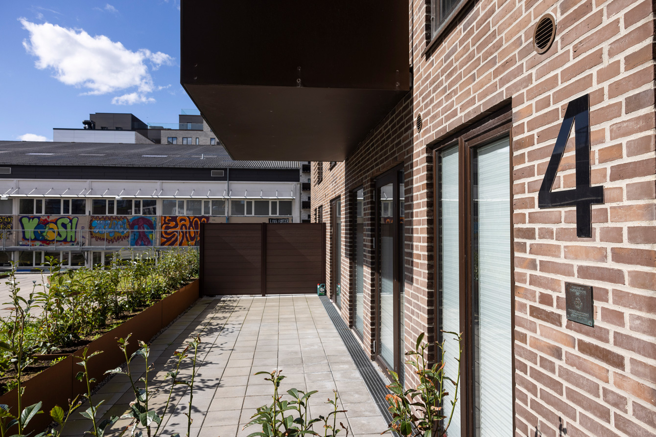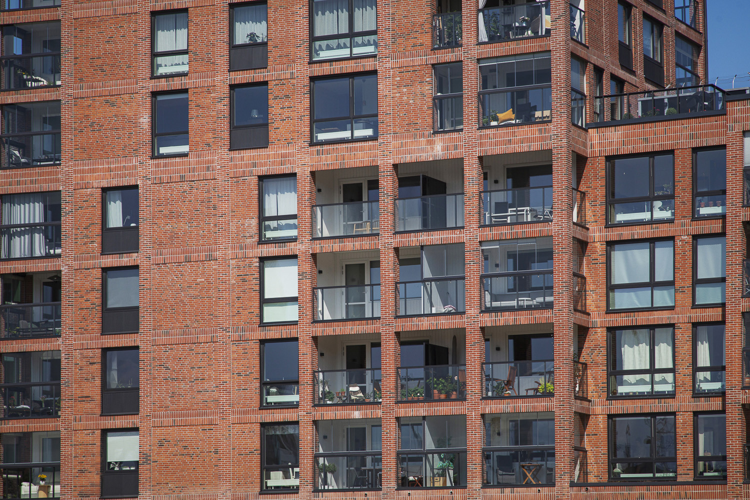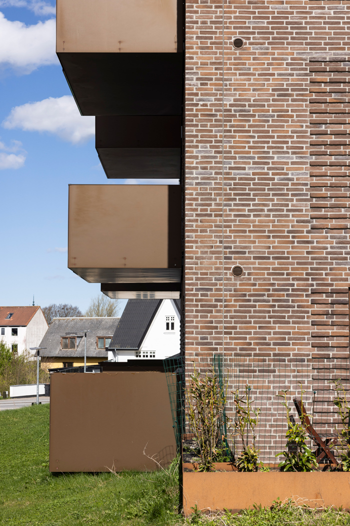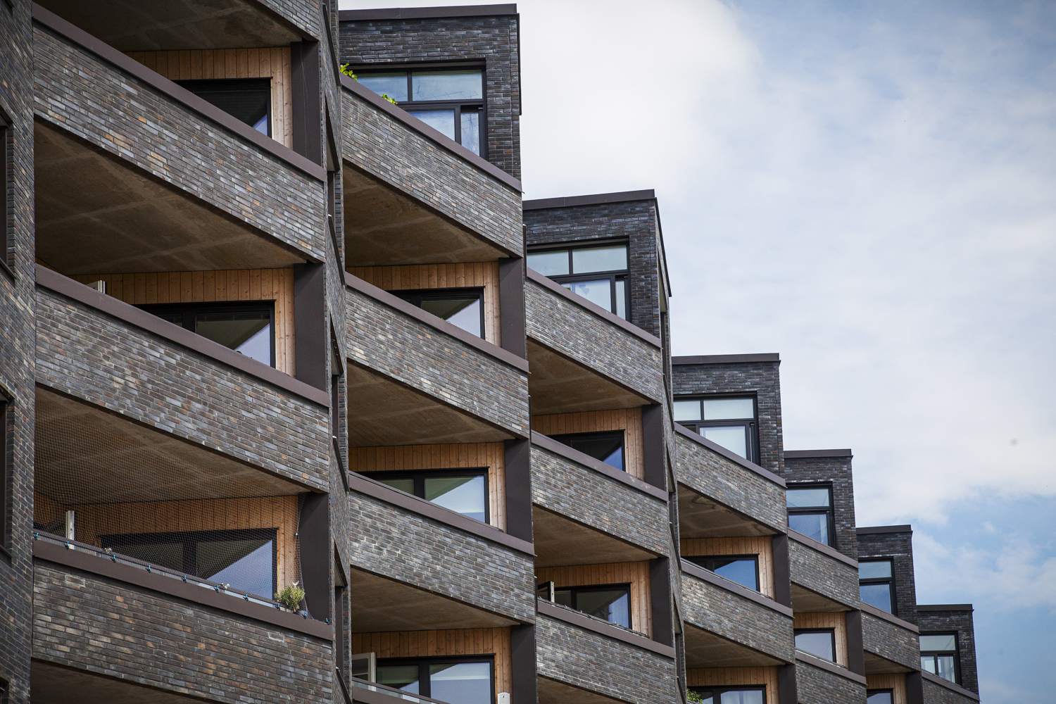 Balkongerna utgör en naturlig del av byggnadens karaktäristiska form. Med ett starkt formspråk skapar teglet en robusthet i omgivningarna.