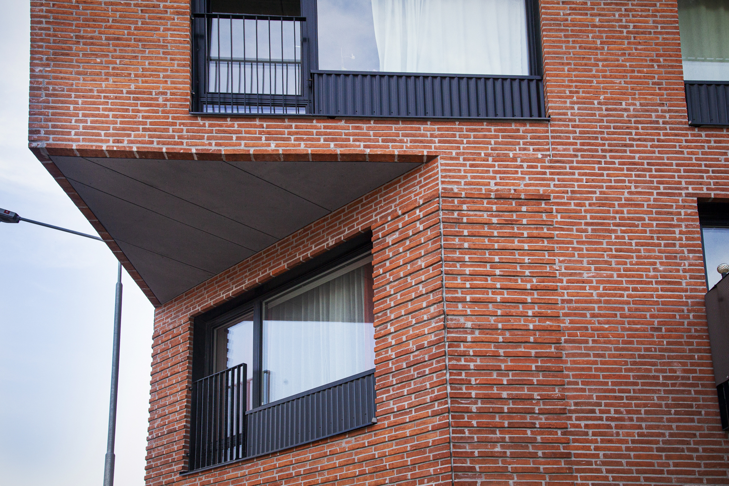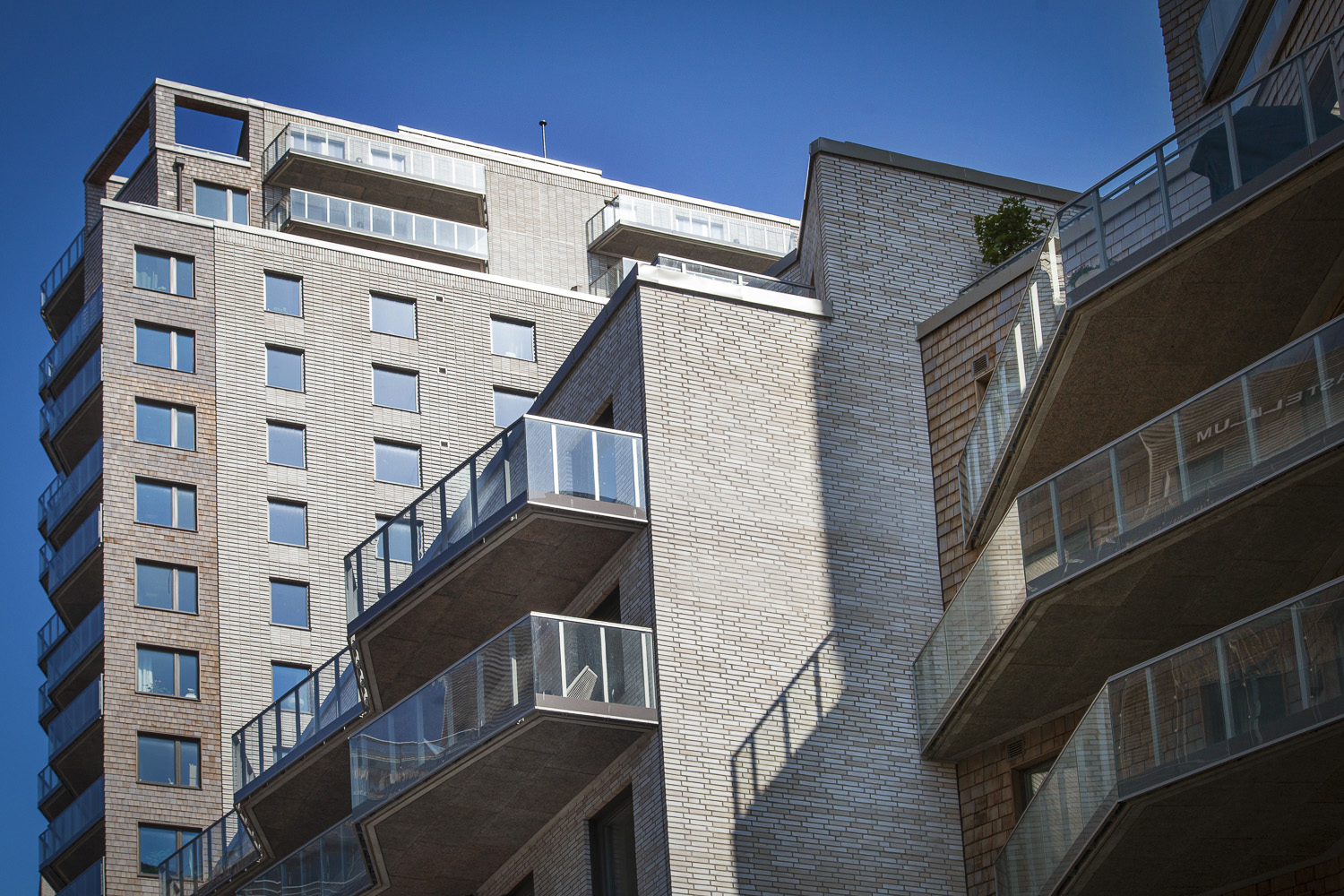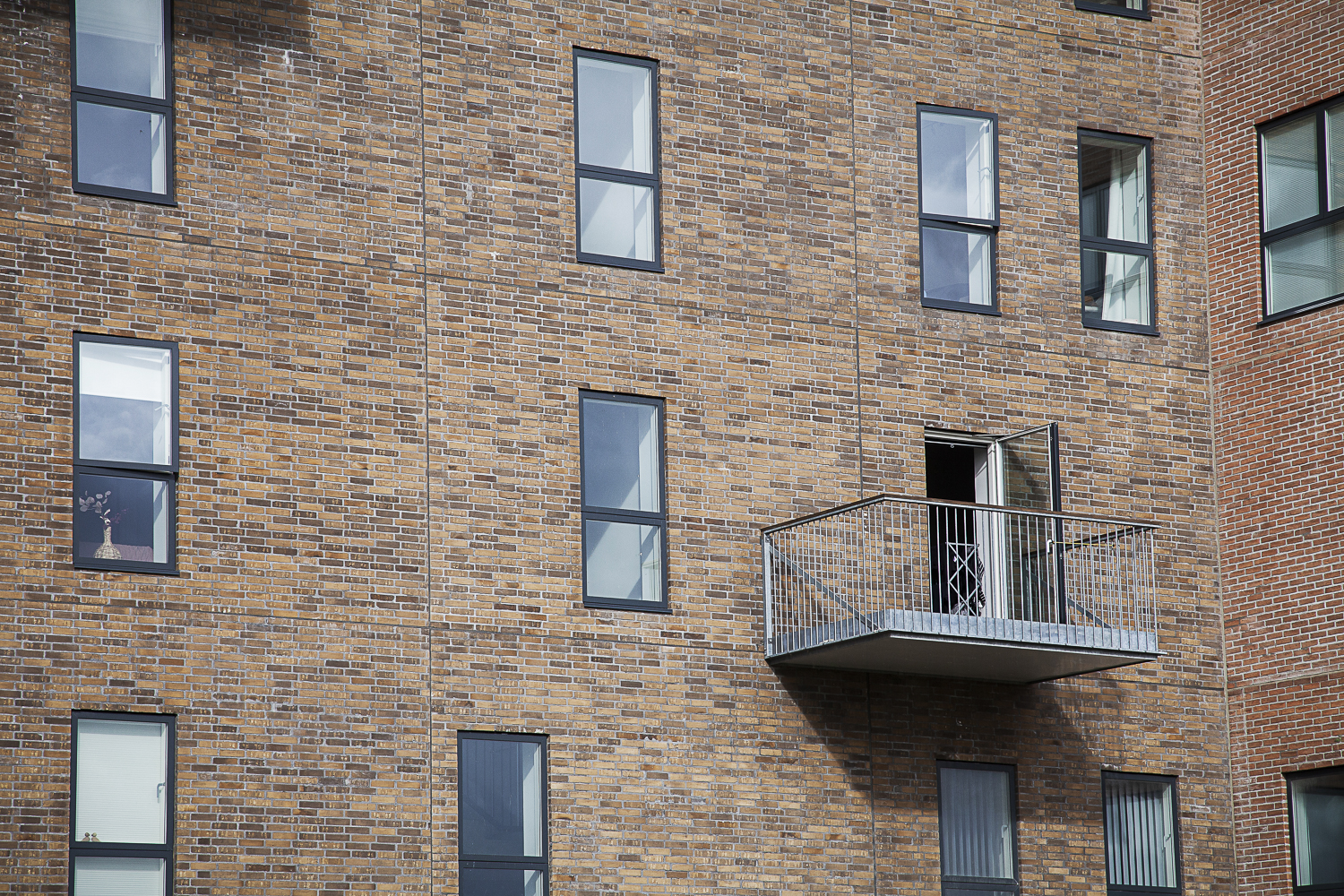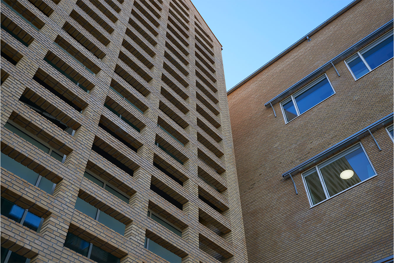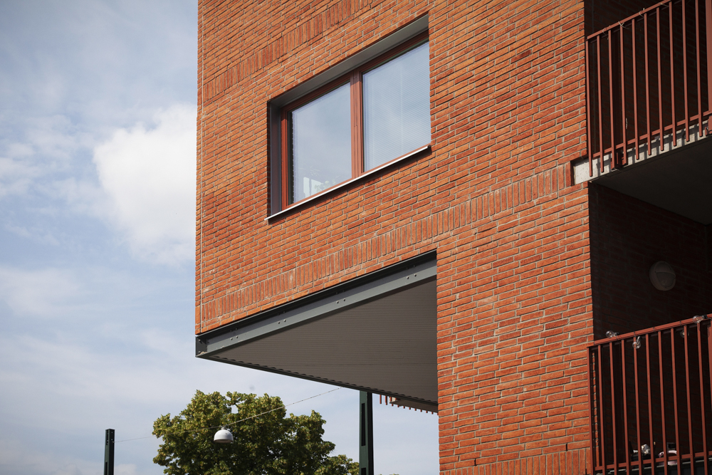 Balkongerna utgör en naturlig del av byggnadens karaktäristiska form. Med ett starkt formspråk skapar teglet en robusthet i omgivningarna.