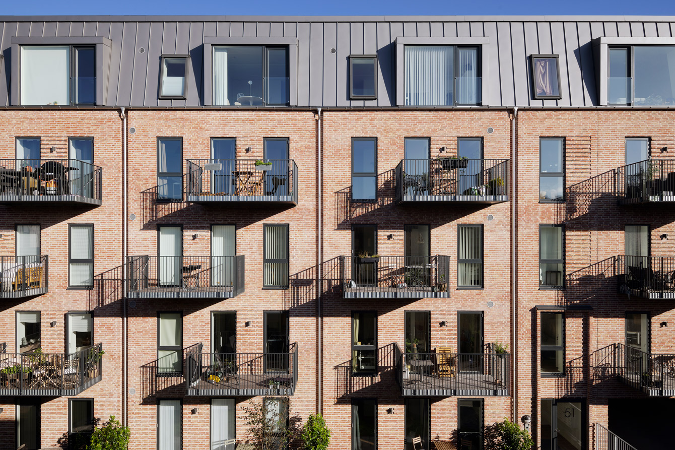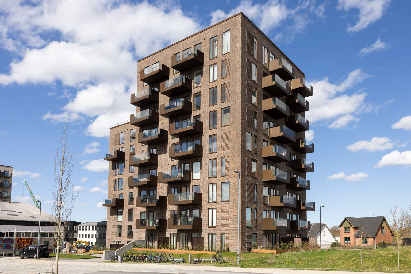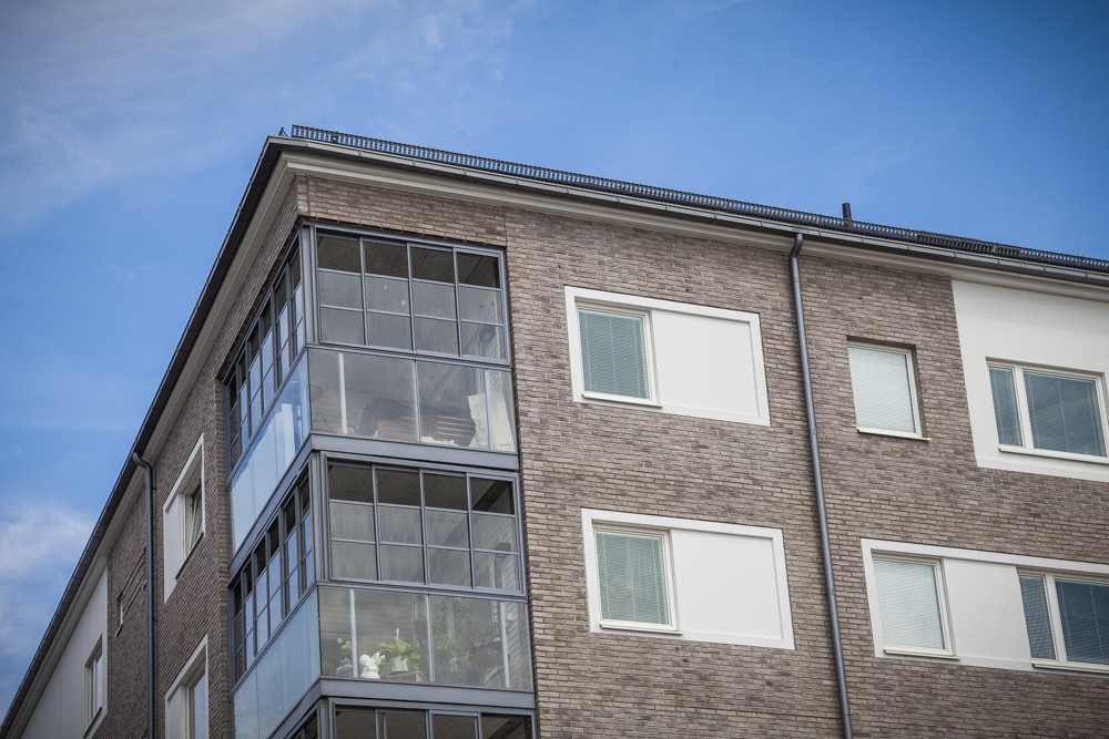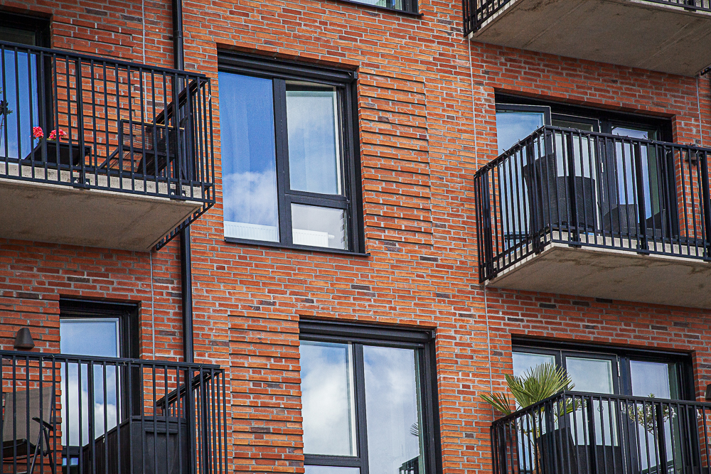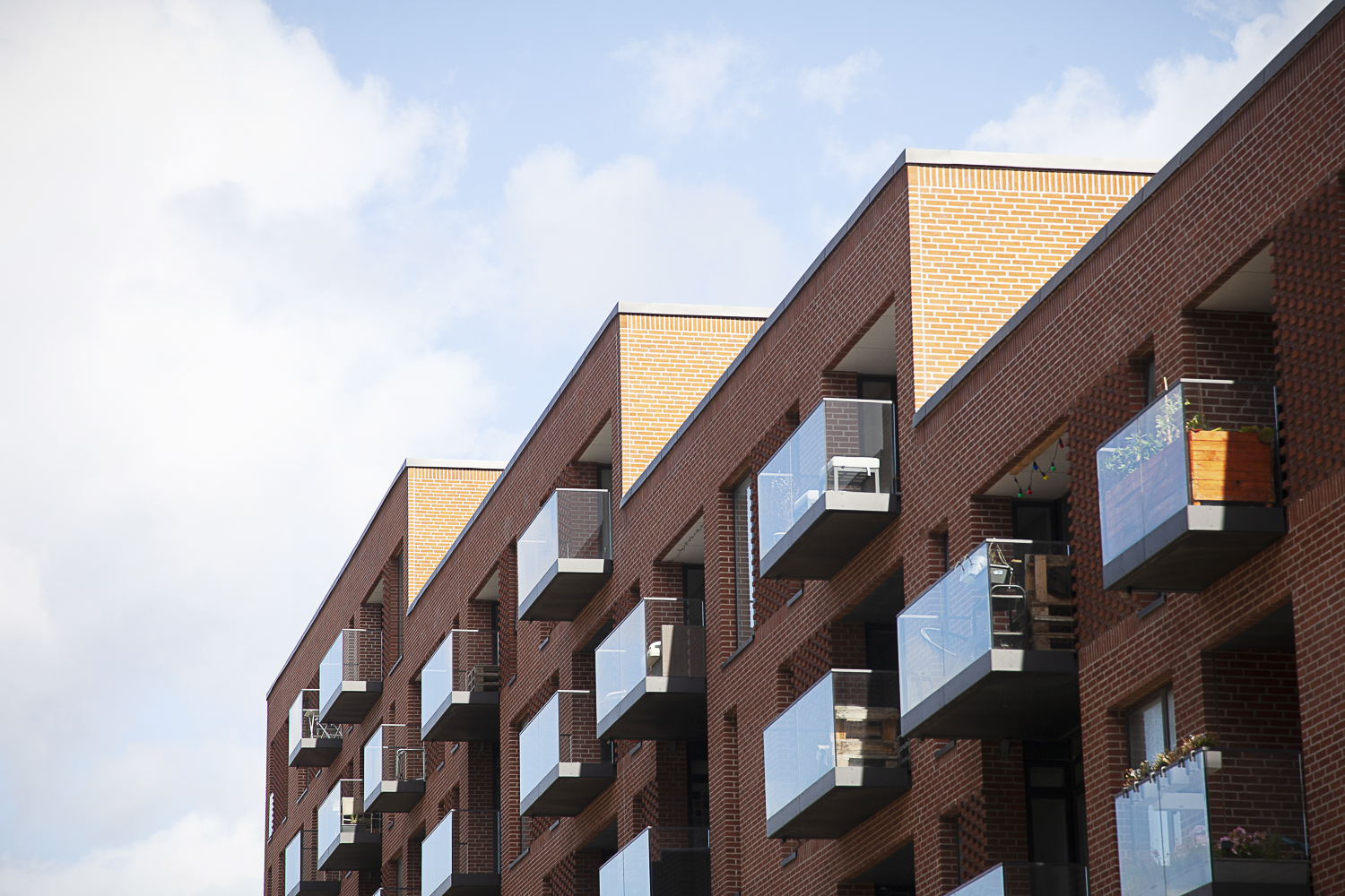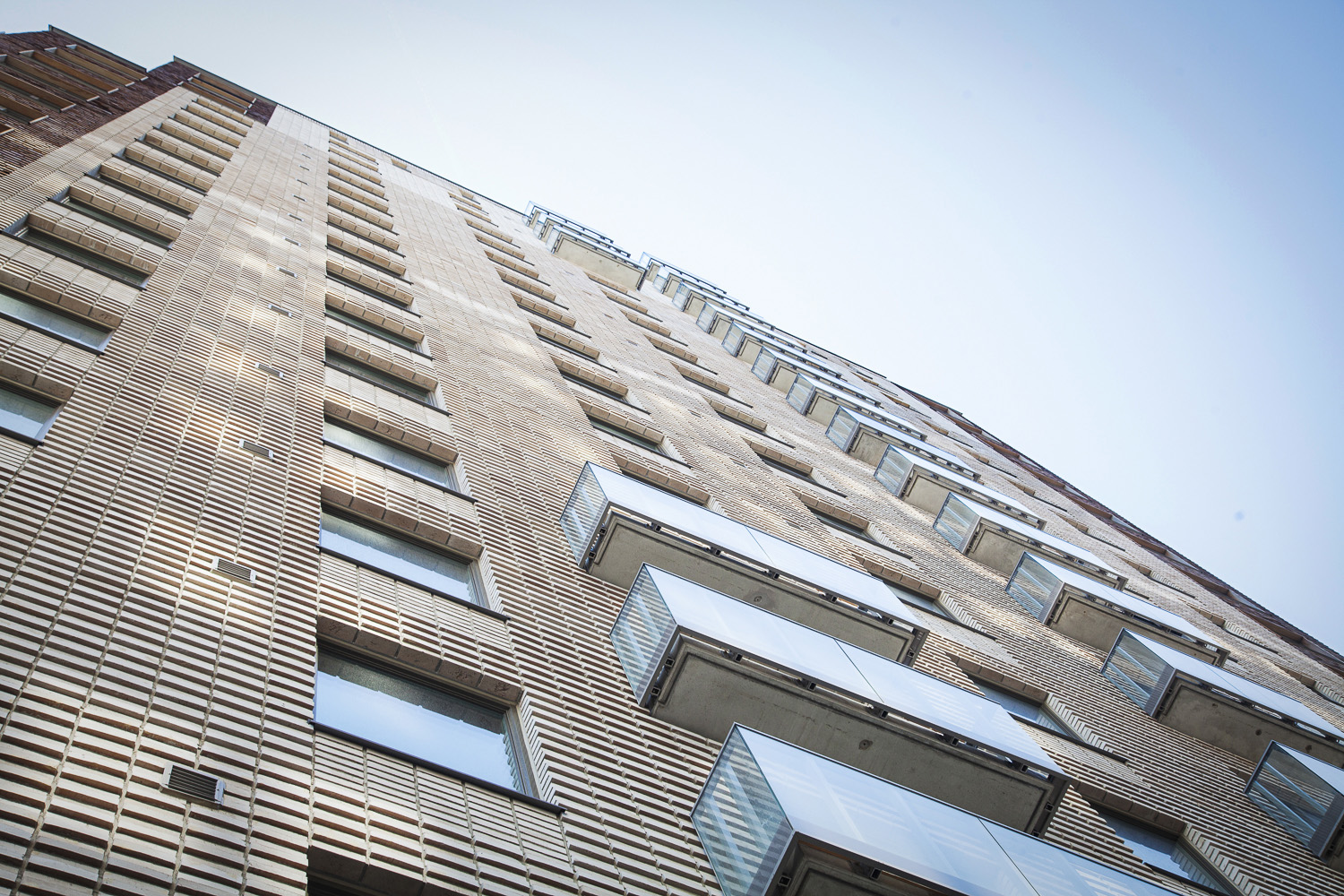 Balkongerna utgör en naturlig del av byggnadens karaktäristiska form. Med ett starkt formspråk skapar teglet en robusthet i omgivningarna.