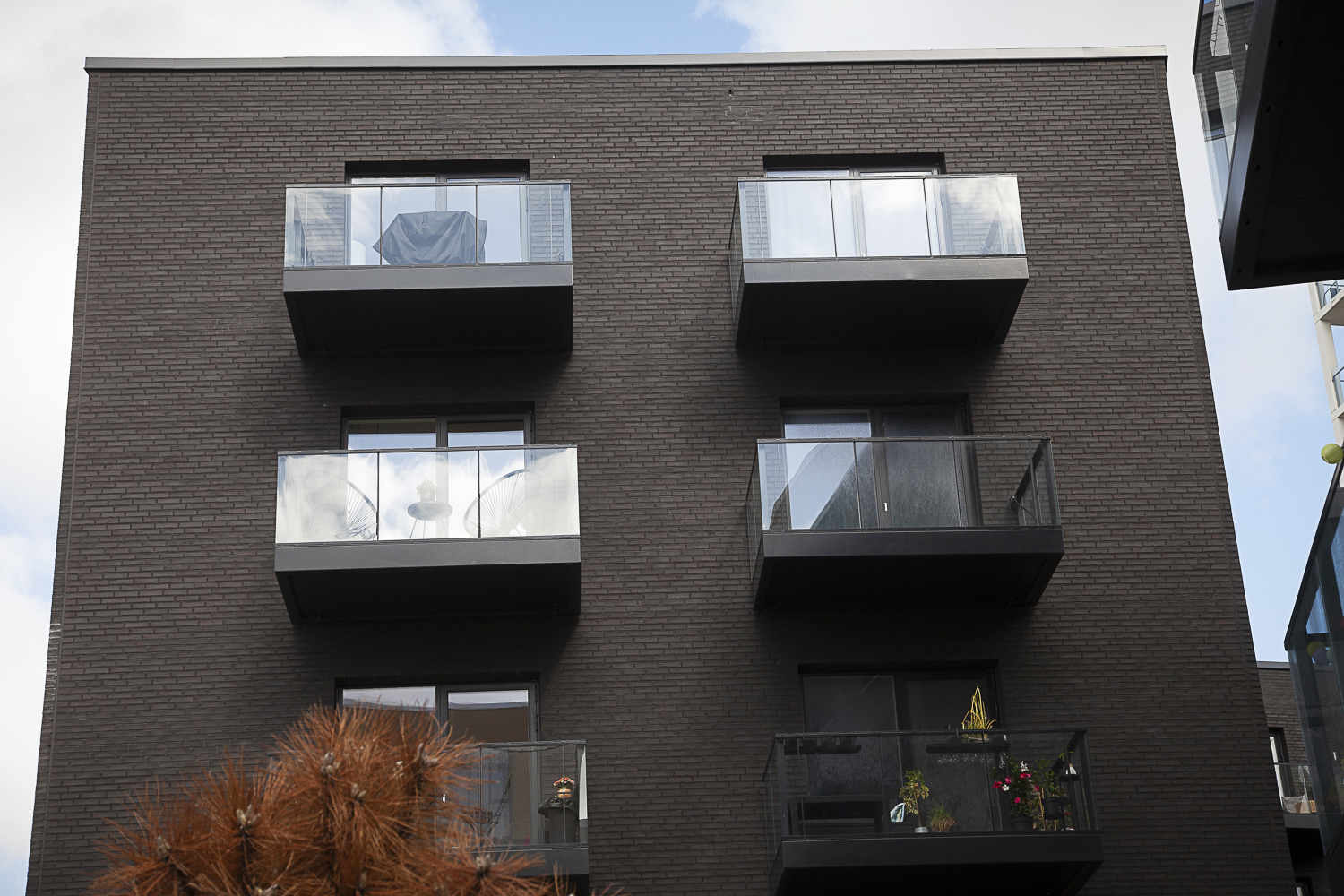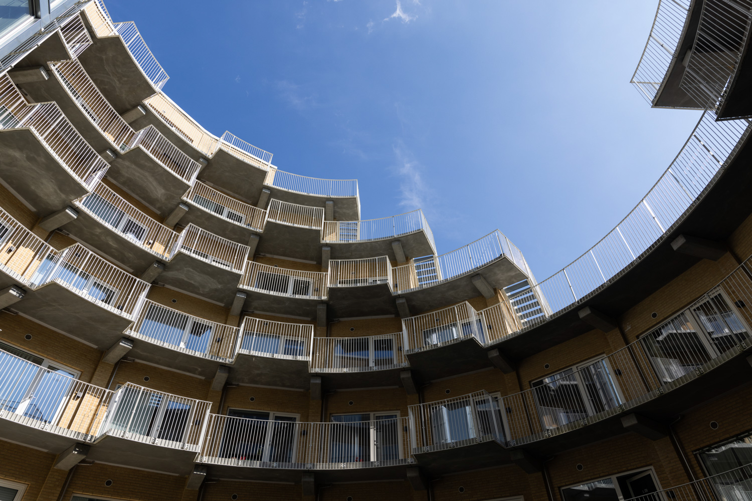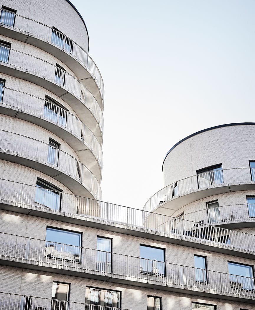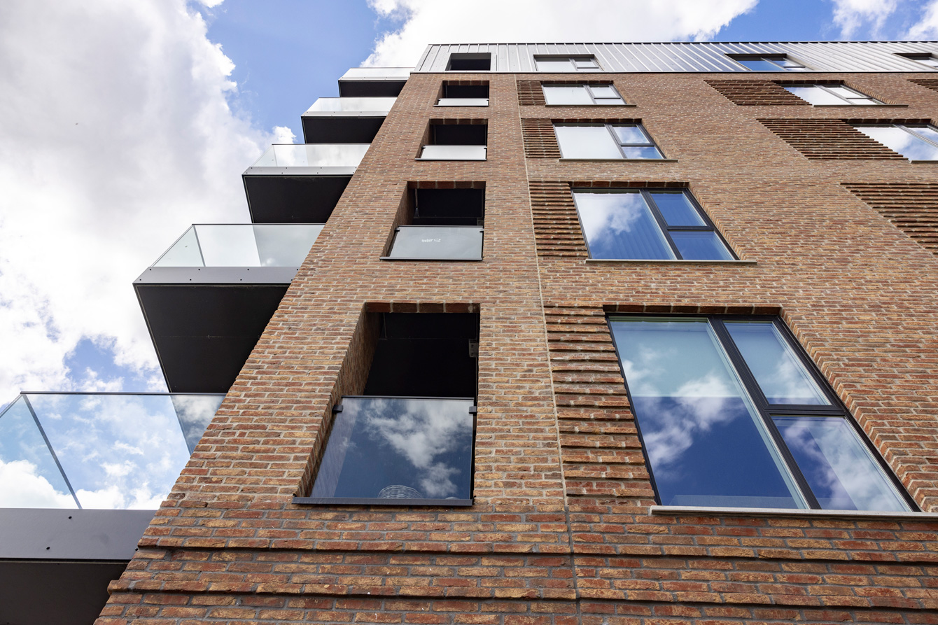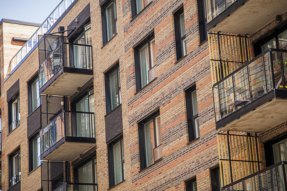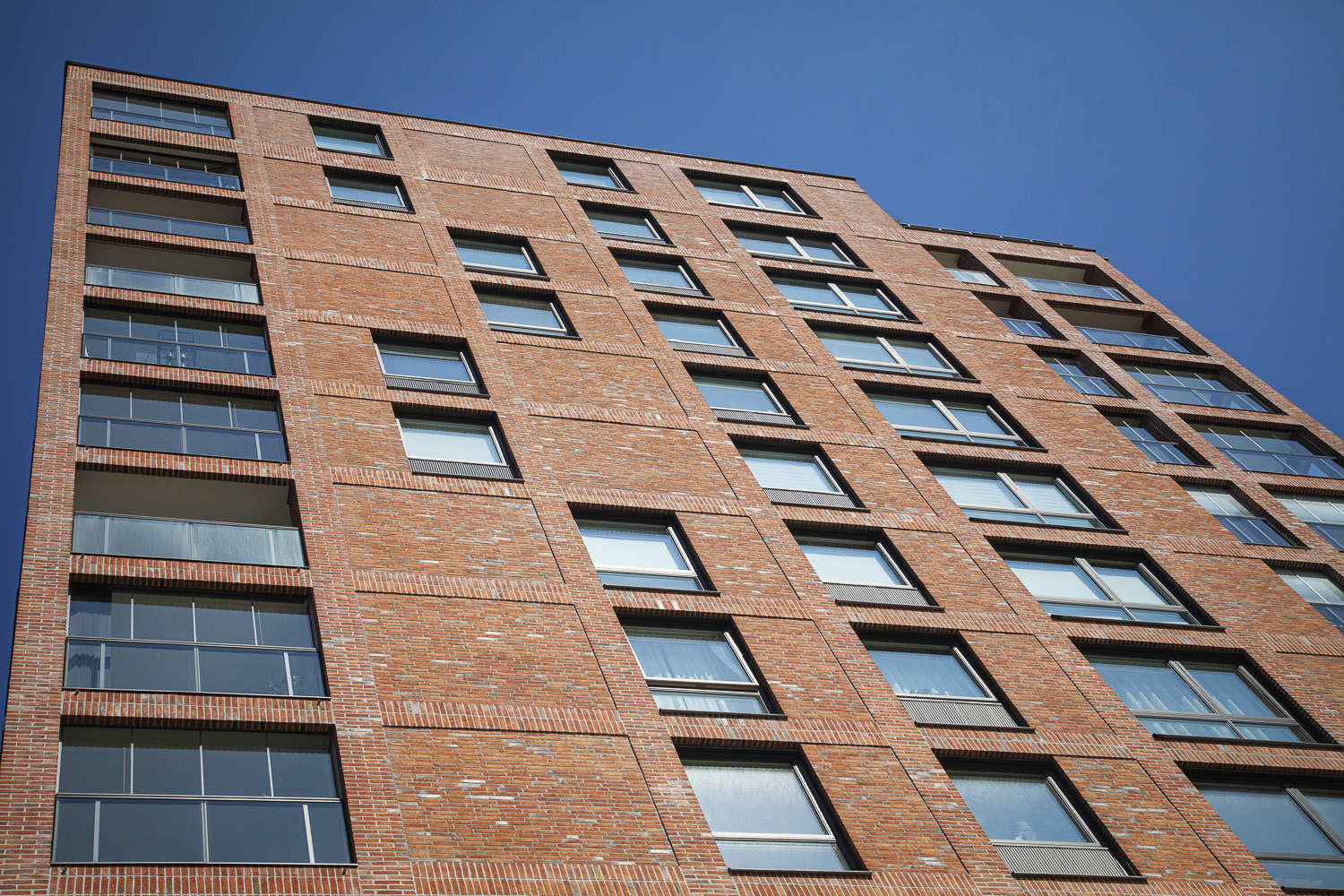 Balkongerna utgör en naturlig del av byggnadens karaktäristiska form. Med ett starkt formspråk skapar teglet en robusthet i omgivningarna.