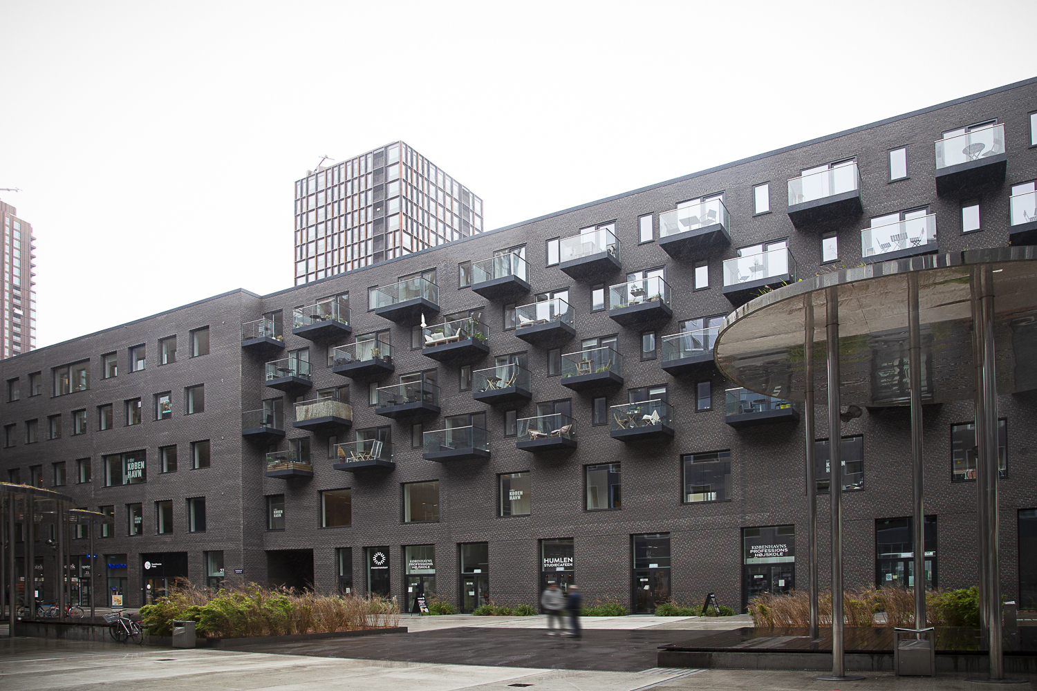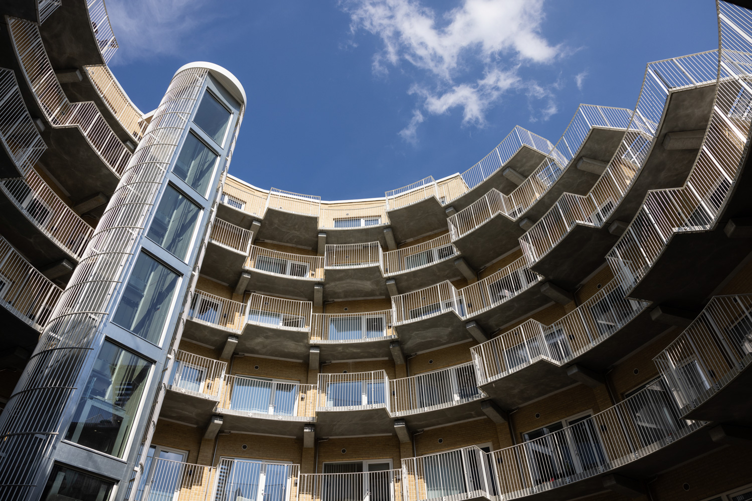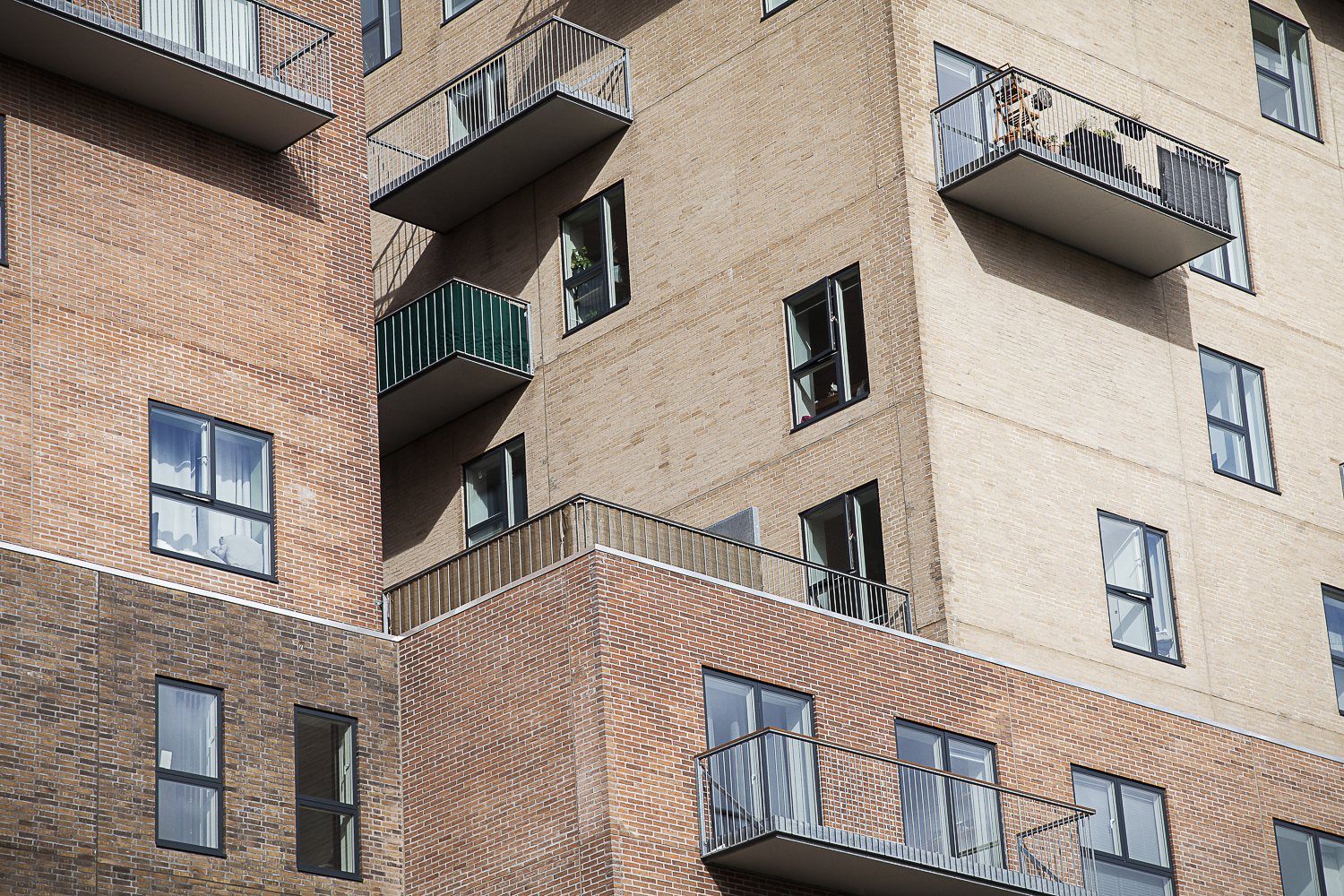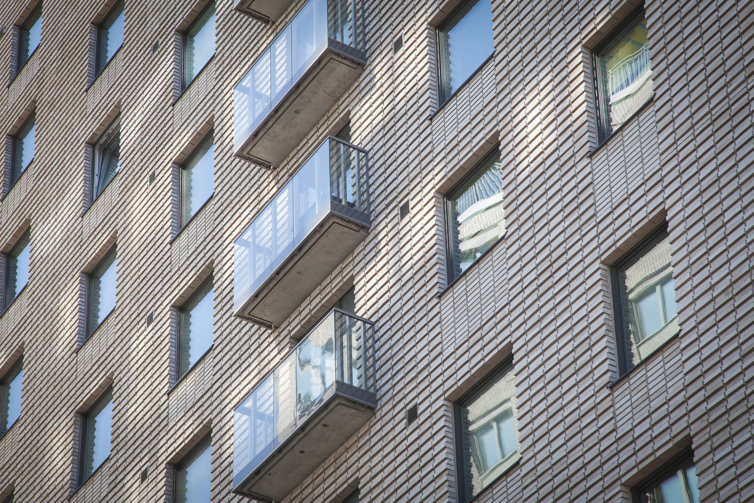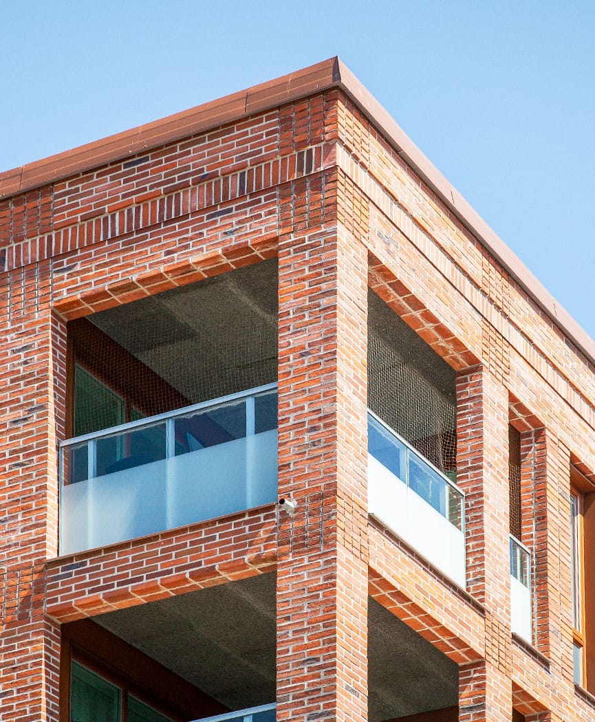 Balkongerna utgör en naturlig del av byggnadens karaktäristiska form. Med ett starkt formspråk skapar teglet en robusthet i omgivningarna.