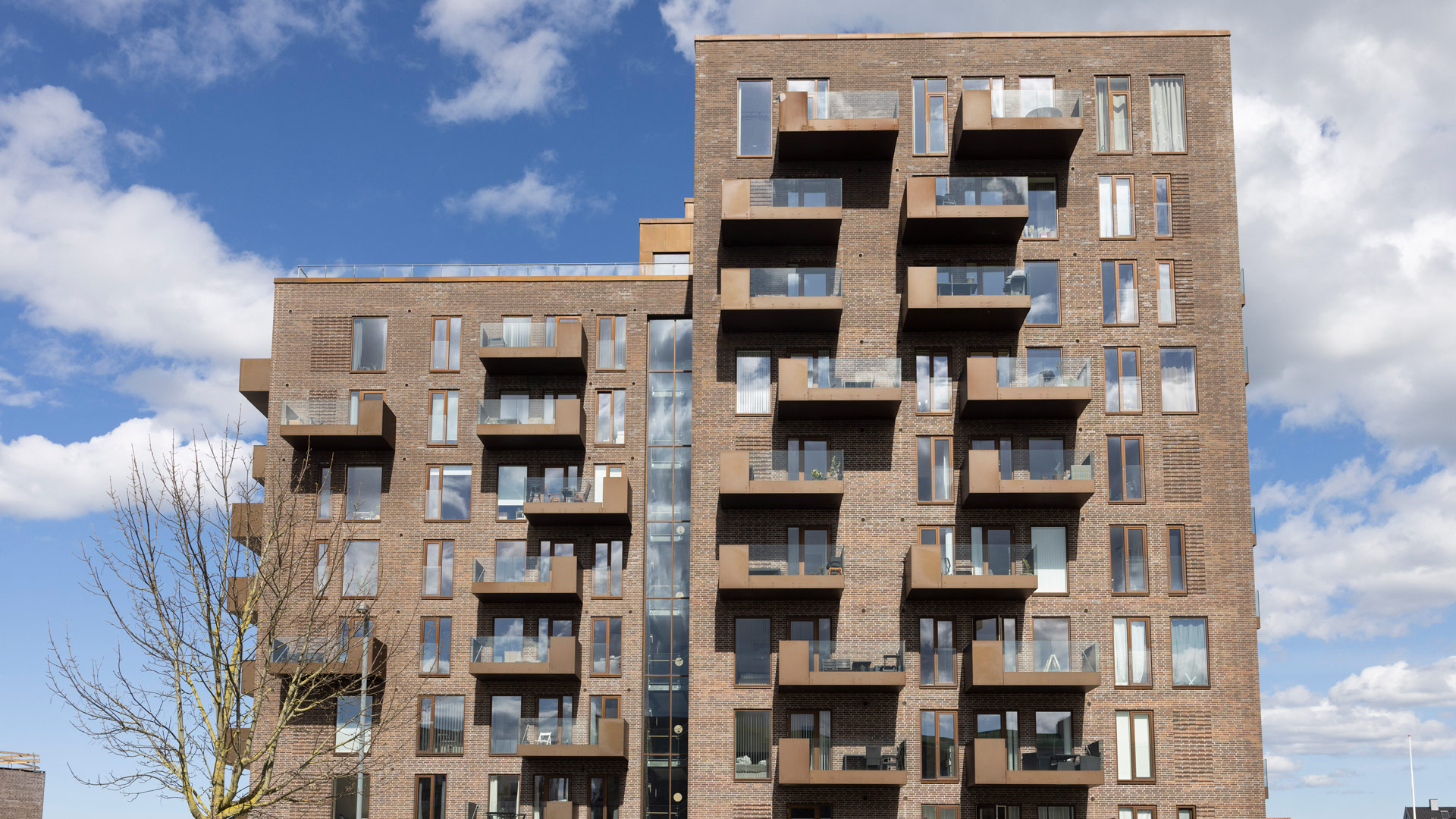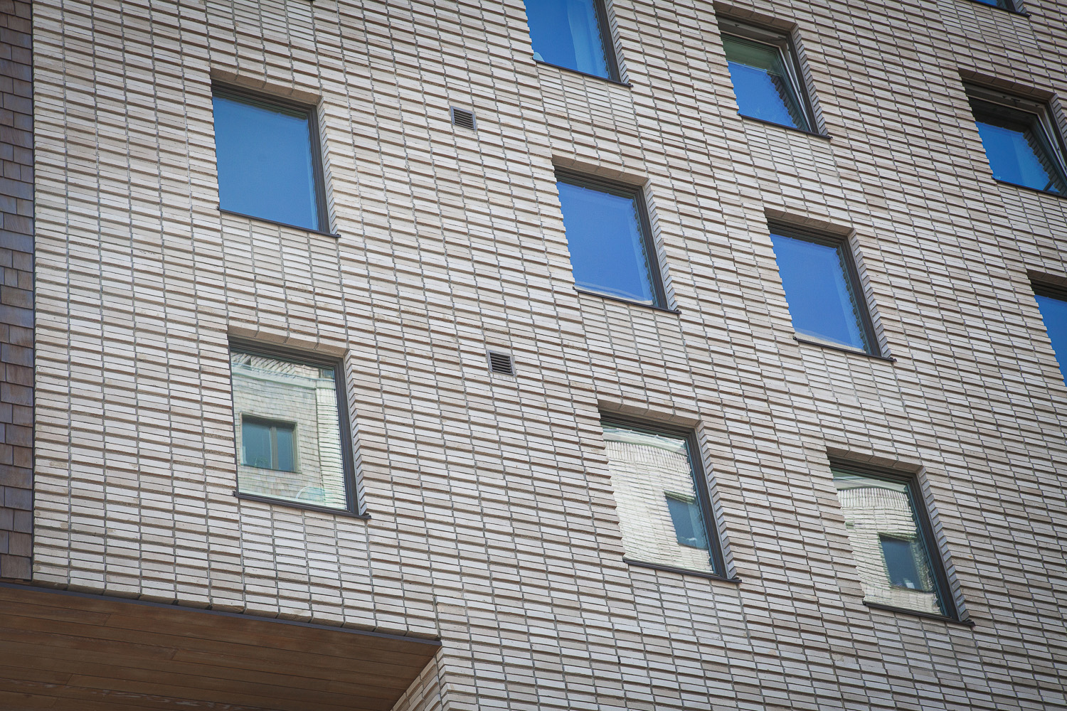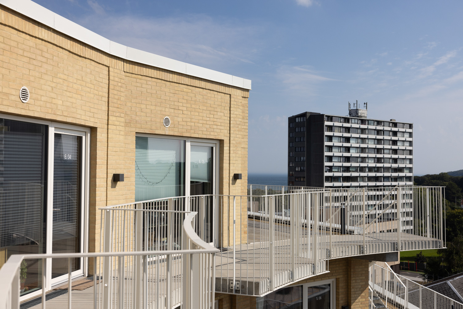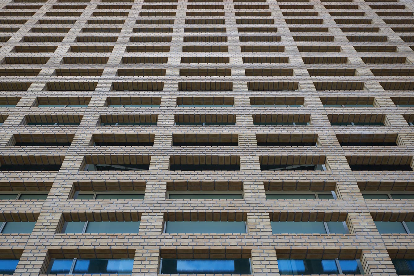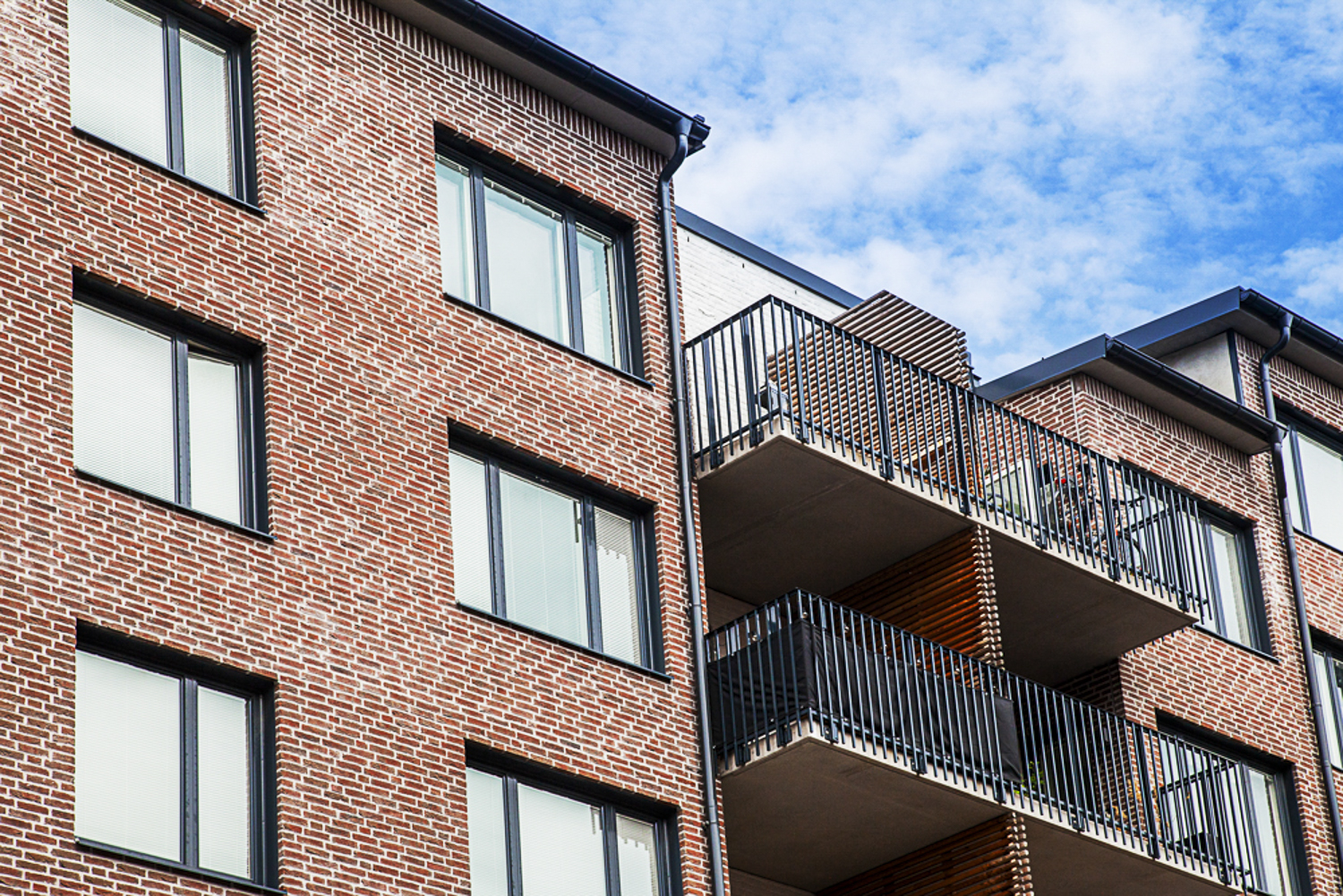 Balkongerna utgör en naturlig del av byggnadens karaktäristiska form. Med ett starkt formspråk skapar teglet en robusthet i omgivningarna.