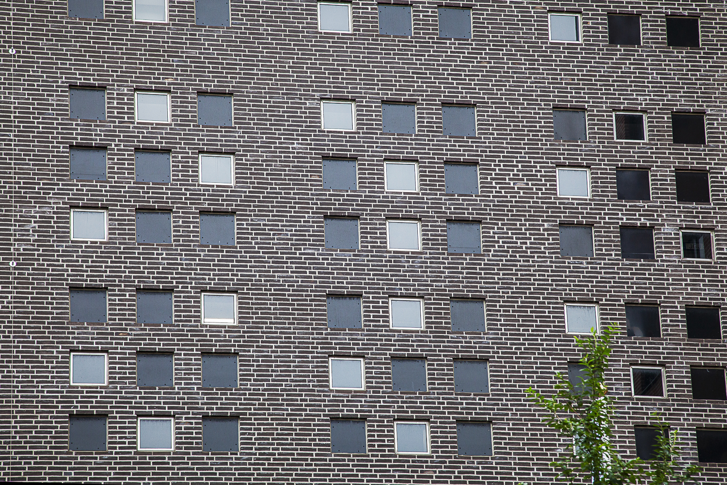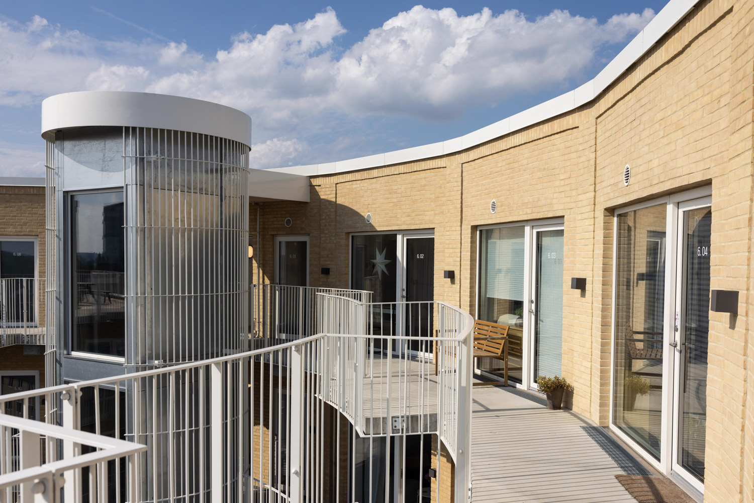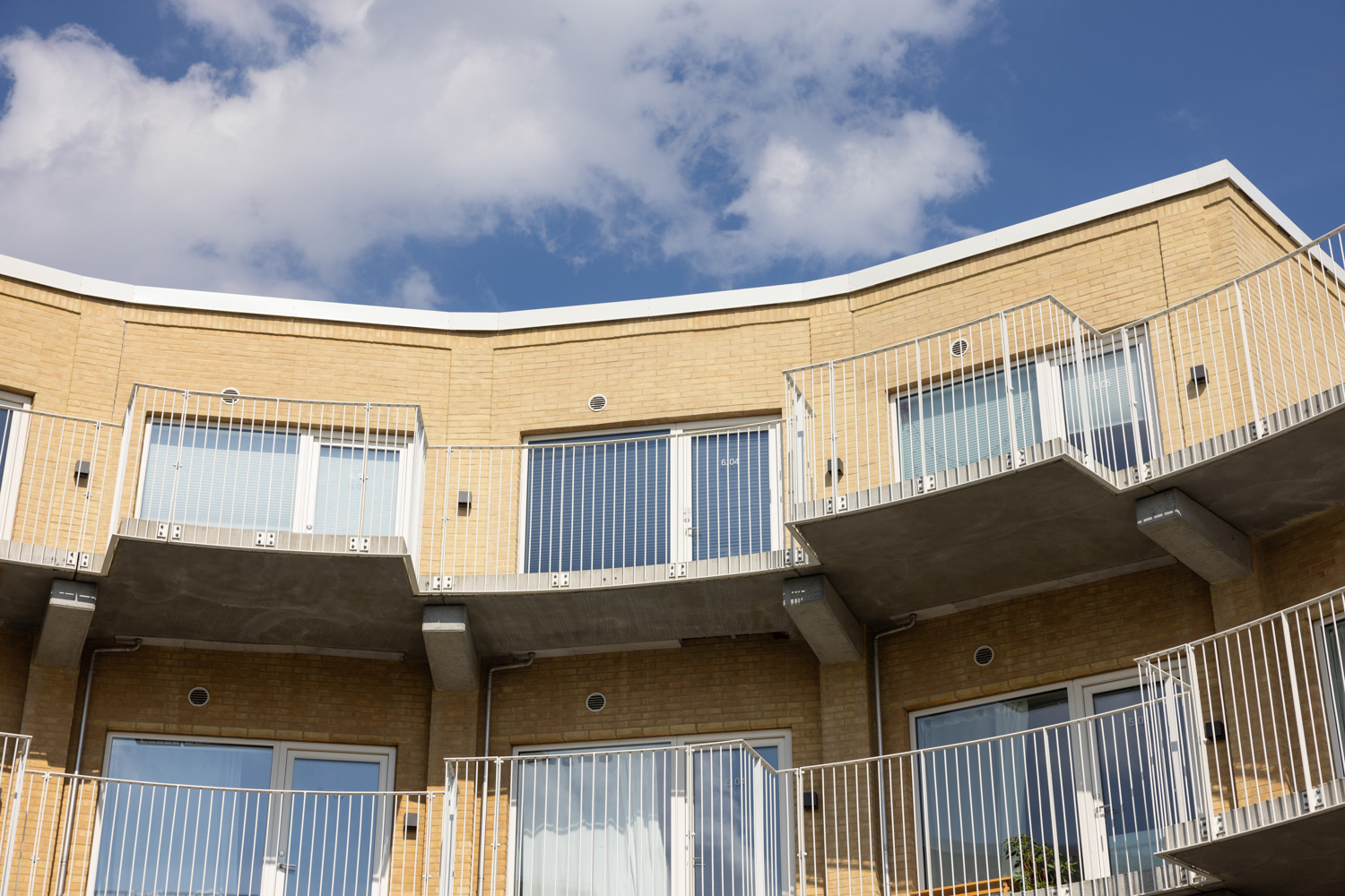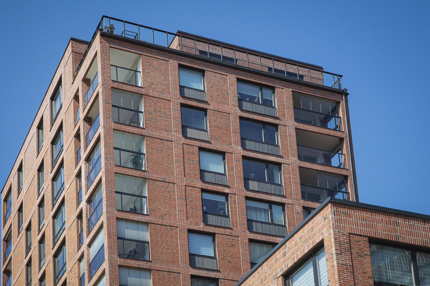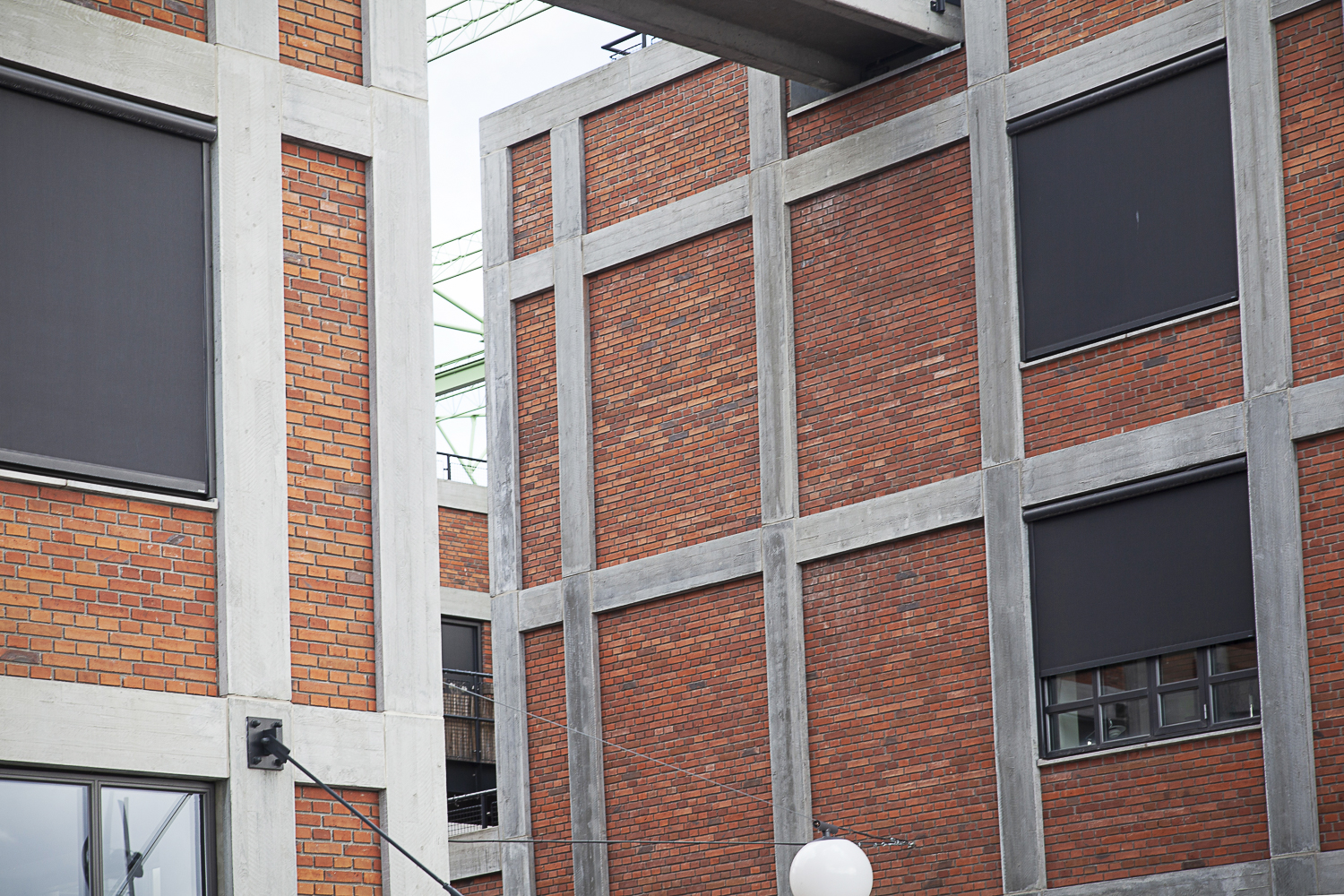 Balkongerna utgör en naturlig del av byggnadens karaktäristiska form. Med ett starkt formspråk skapar teglet en robusthet i omgivningarna.