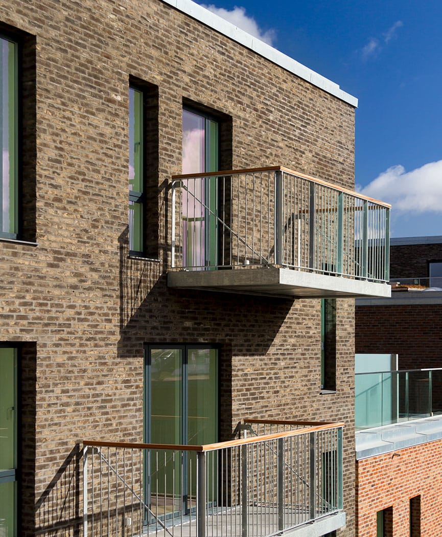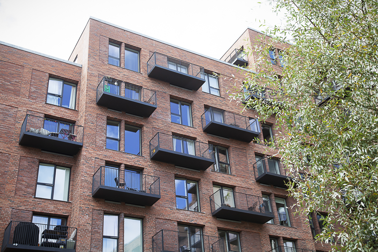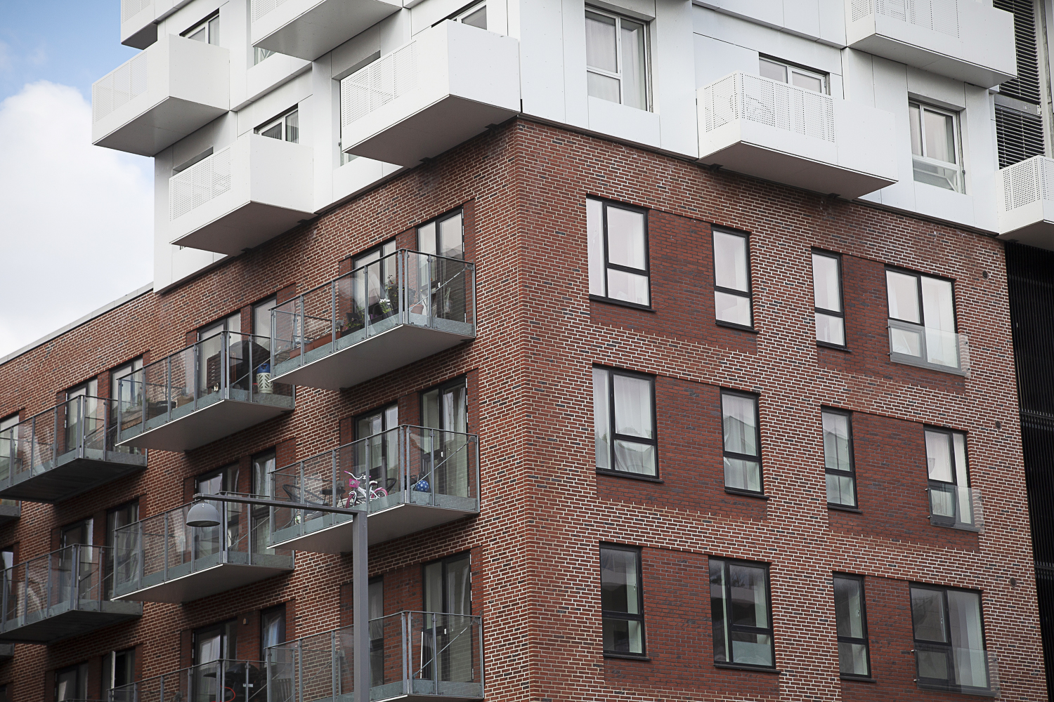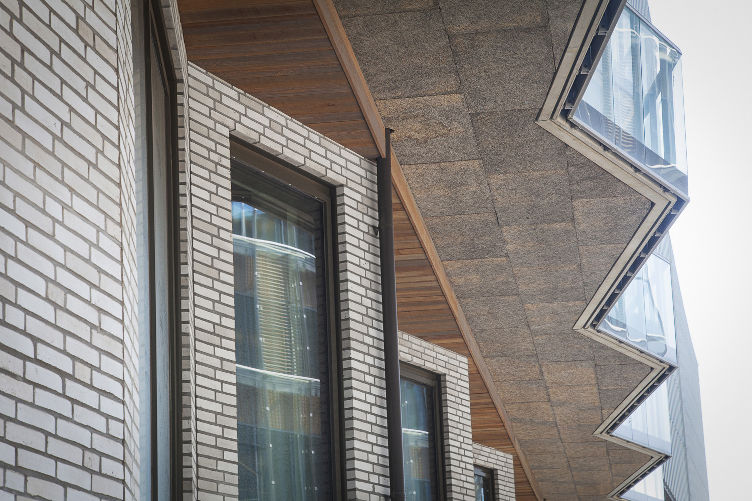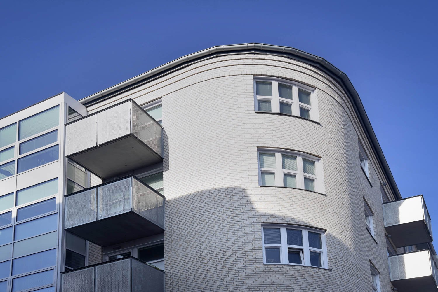 Balkongerna utgör en naturlig del av byggnadens karaktäristiska form. Med ett starkt formspråk skapar teglet en robusthet i omgivningarna.