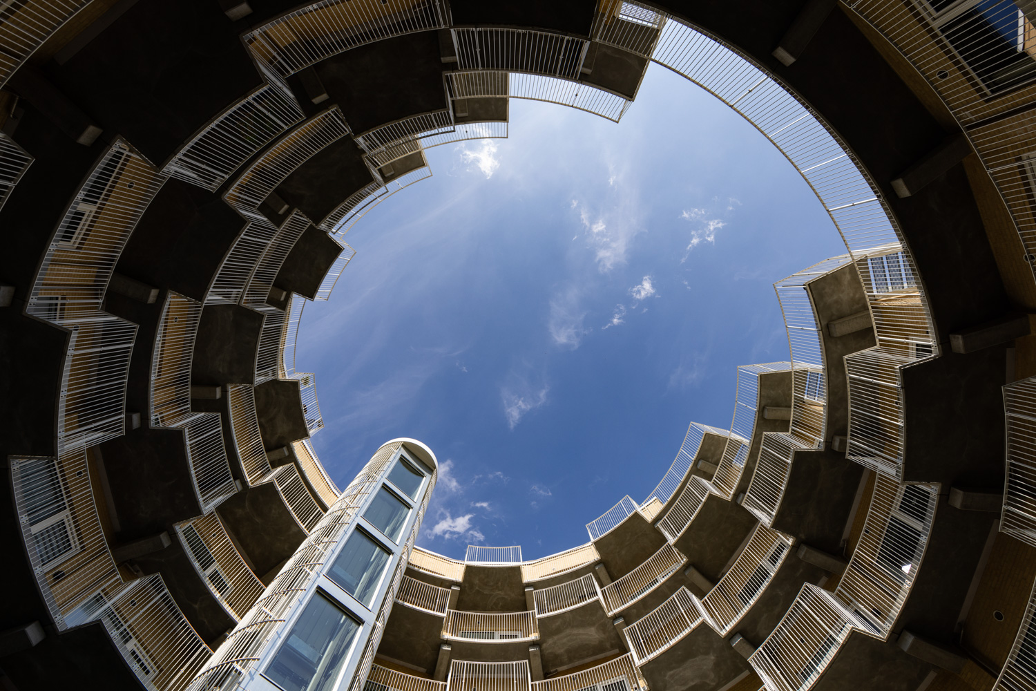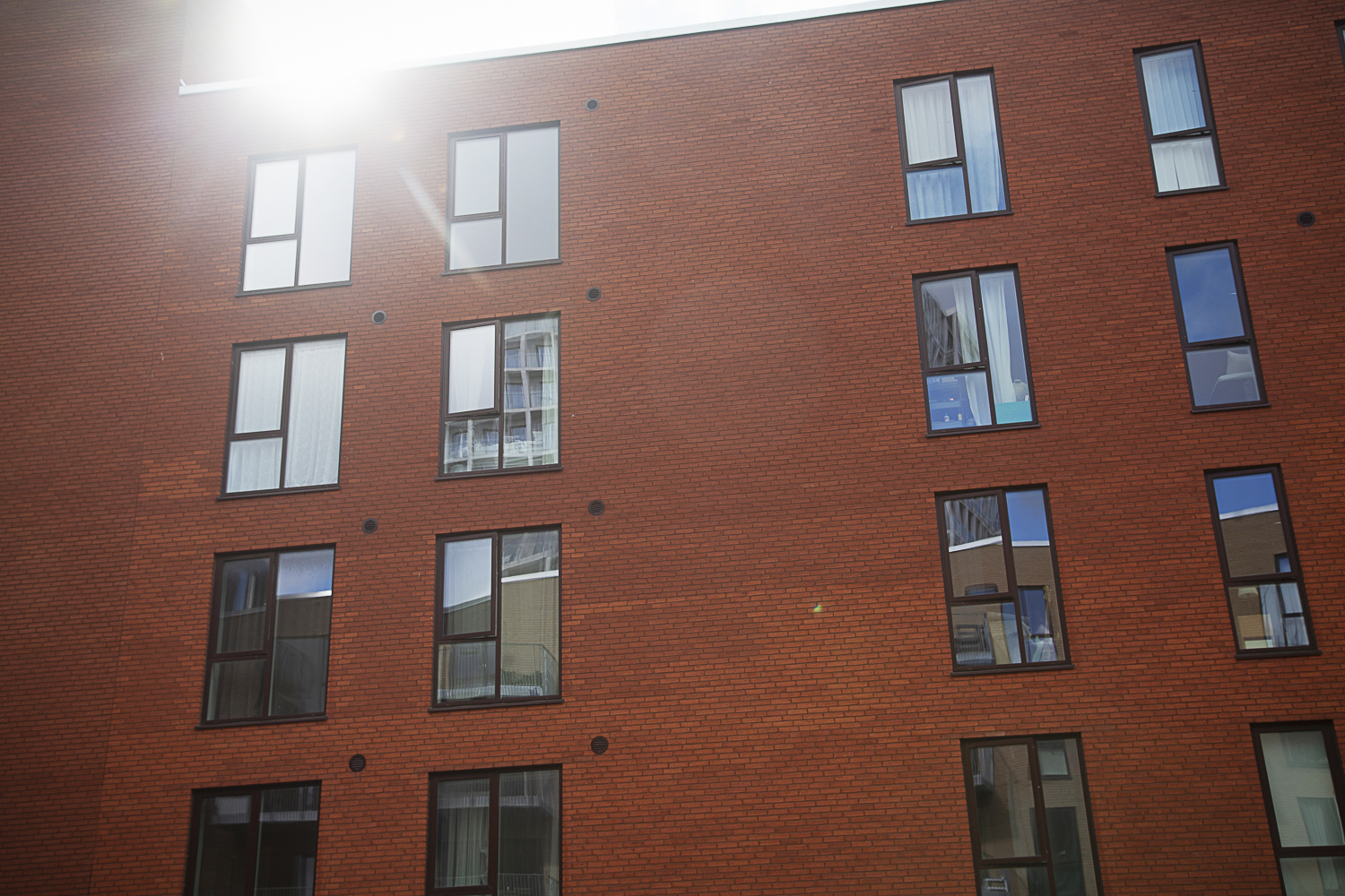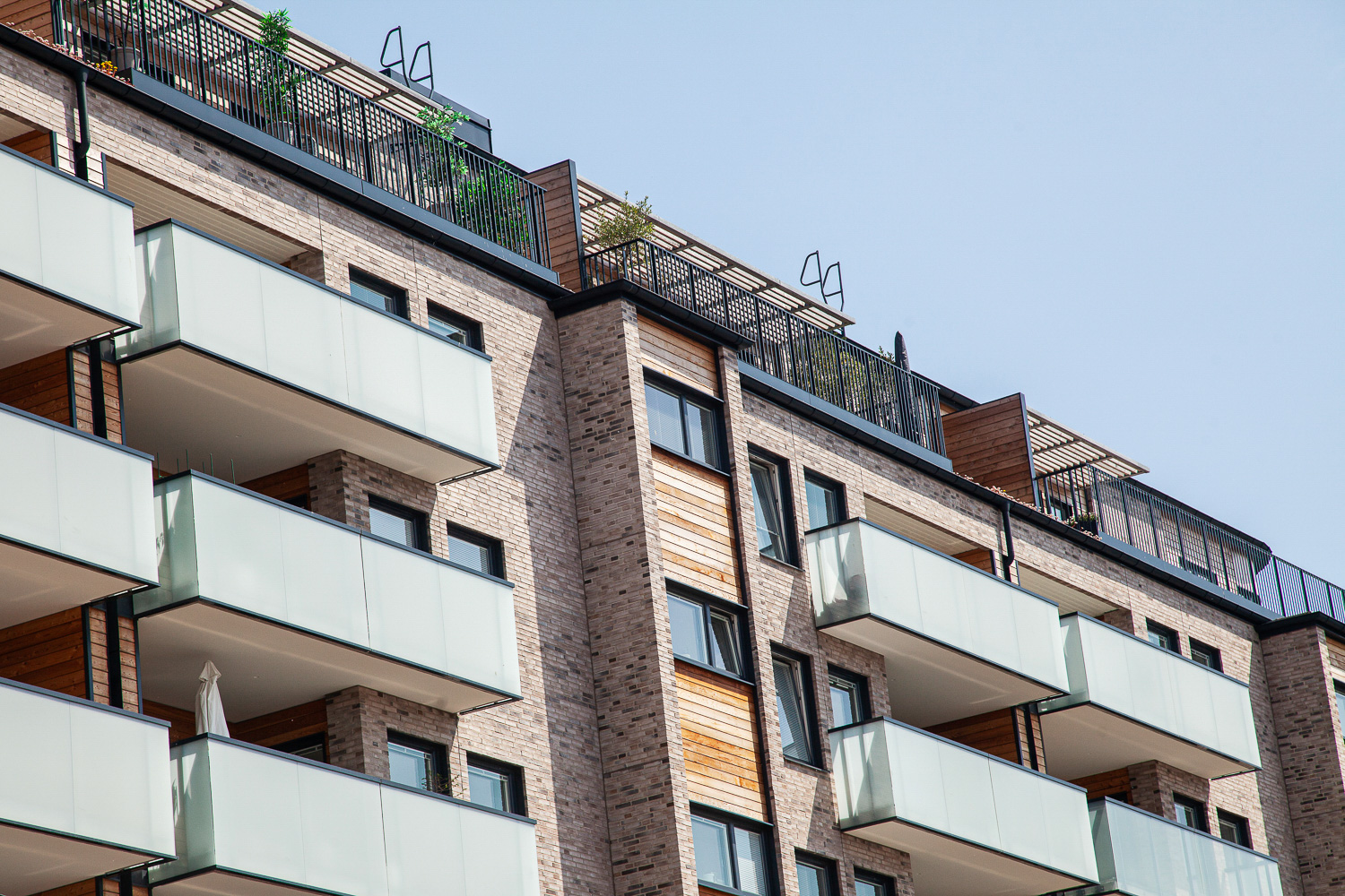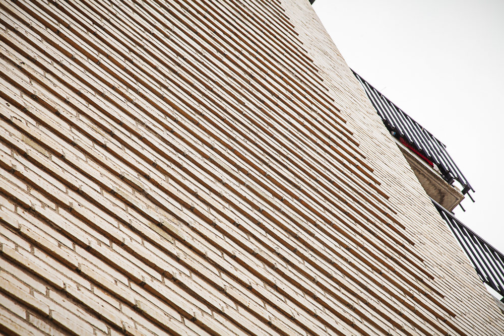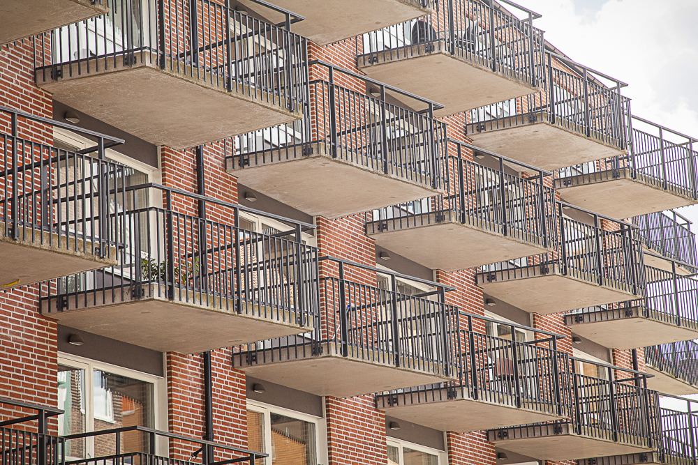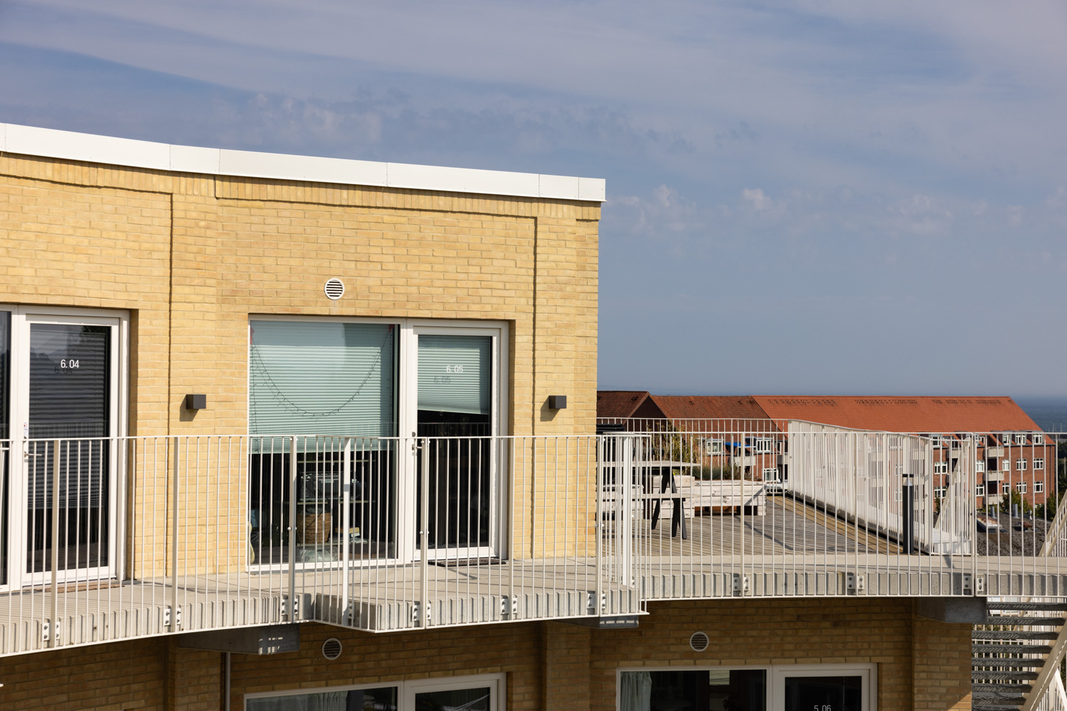 Balkongerna utgör en naturlig del av byggnadens karaktäristiska form. Med ett starkt formspråk skapar teglet en robusthet i omgivningarna.
