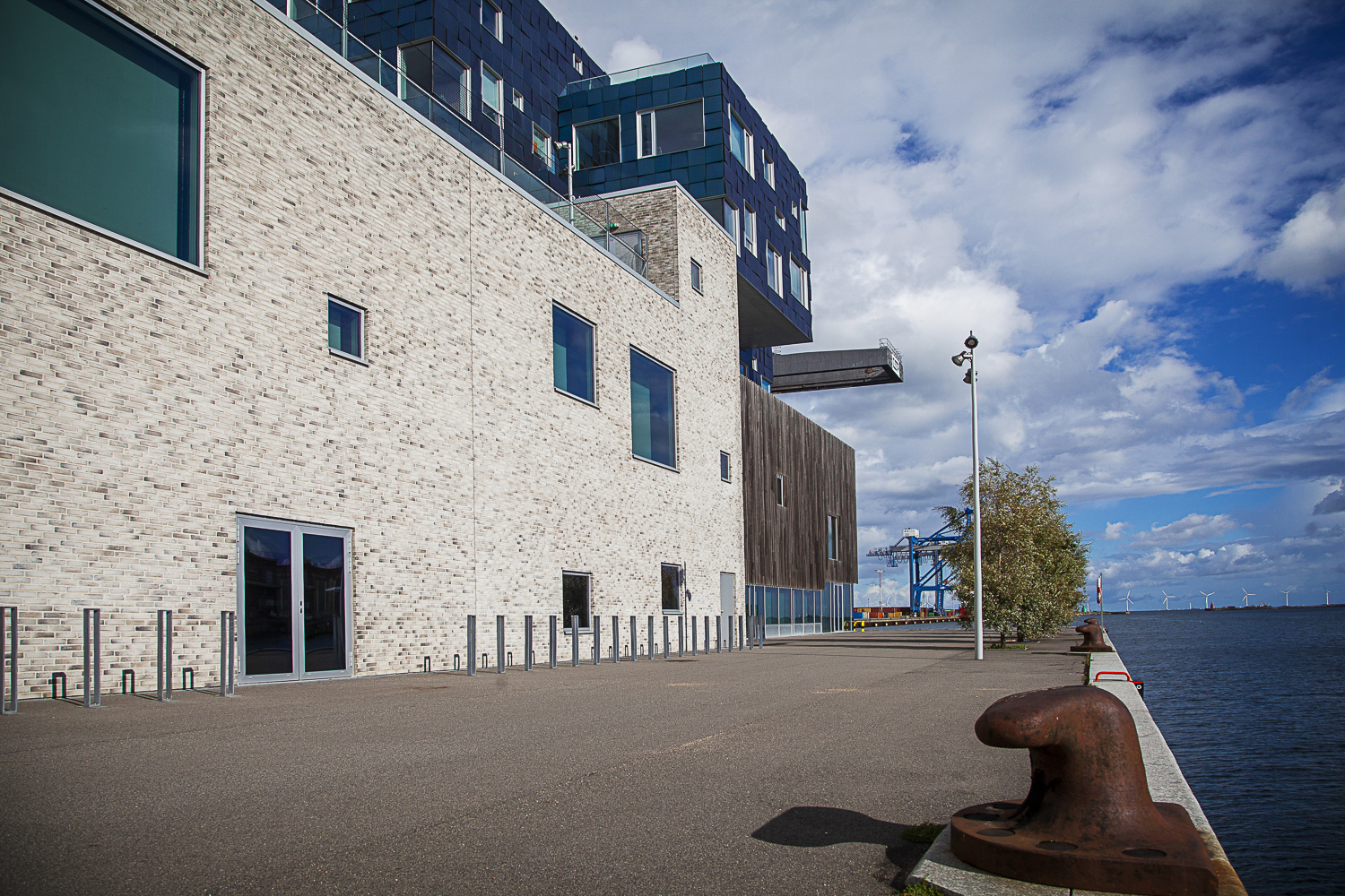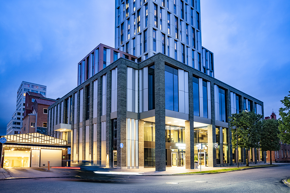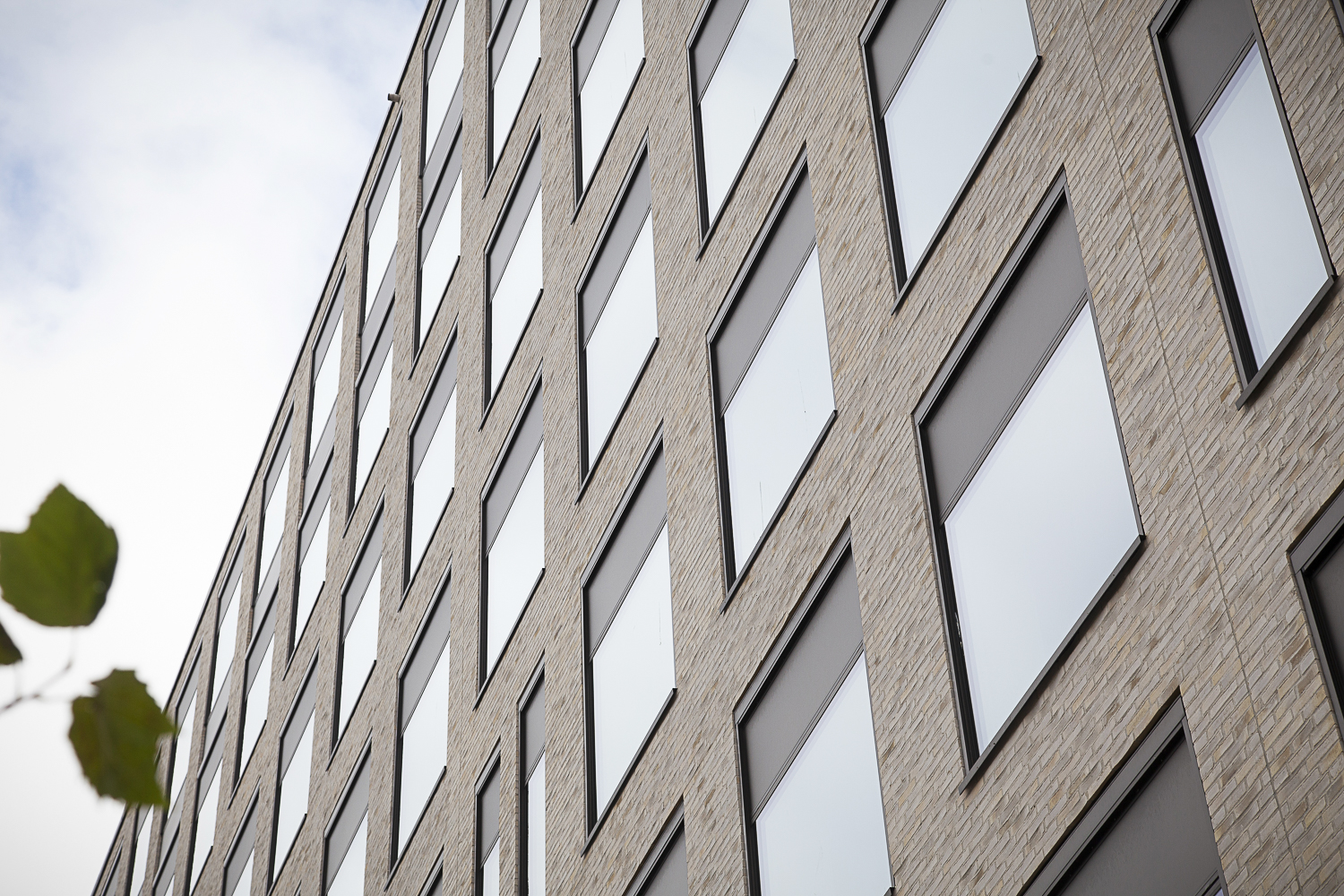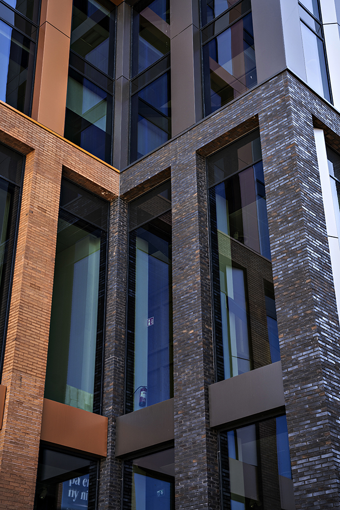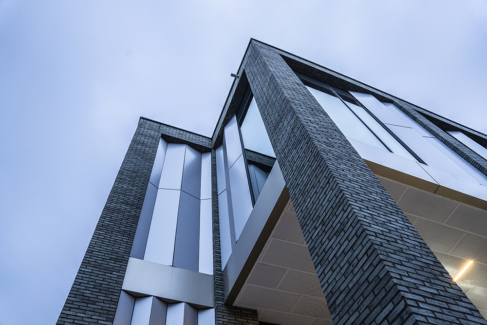 Innovative property in Aalborg City center with a distinct sloping façade. Randers Tegl assisted the performing contractor in designing and planning expansion joints, as well as suspension principles and determination of the masonry course according to the placement of brick bellows. The design of the façade posed special requirements for the building's carrying capacity.