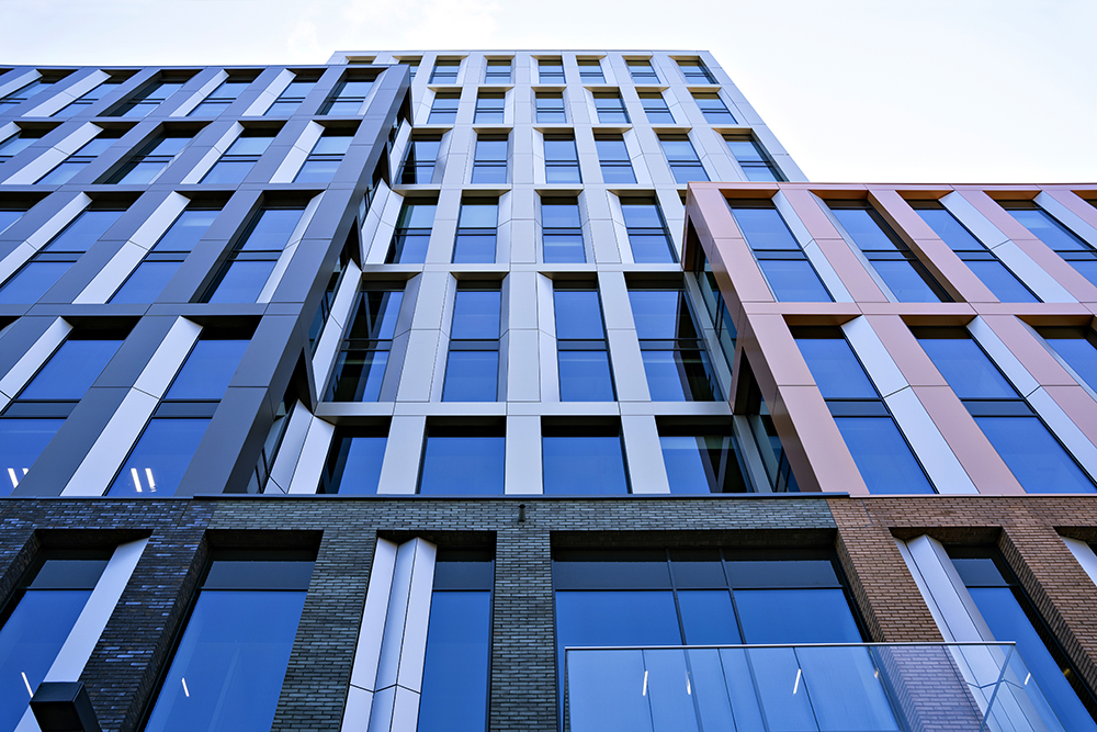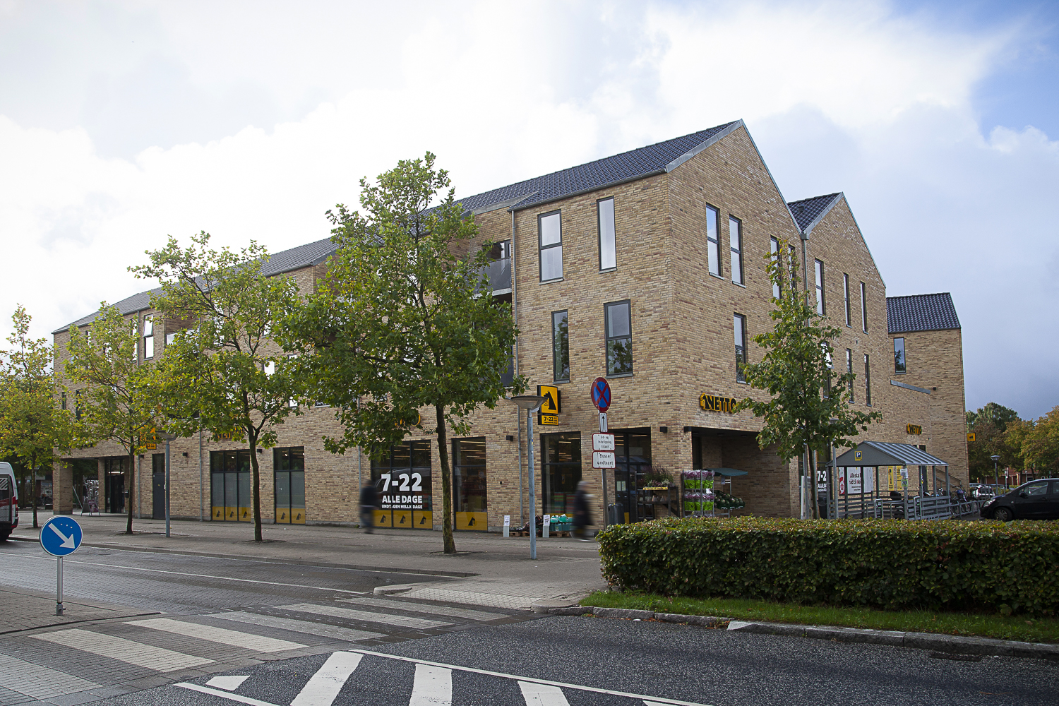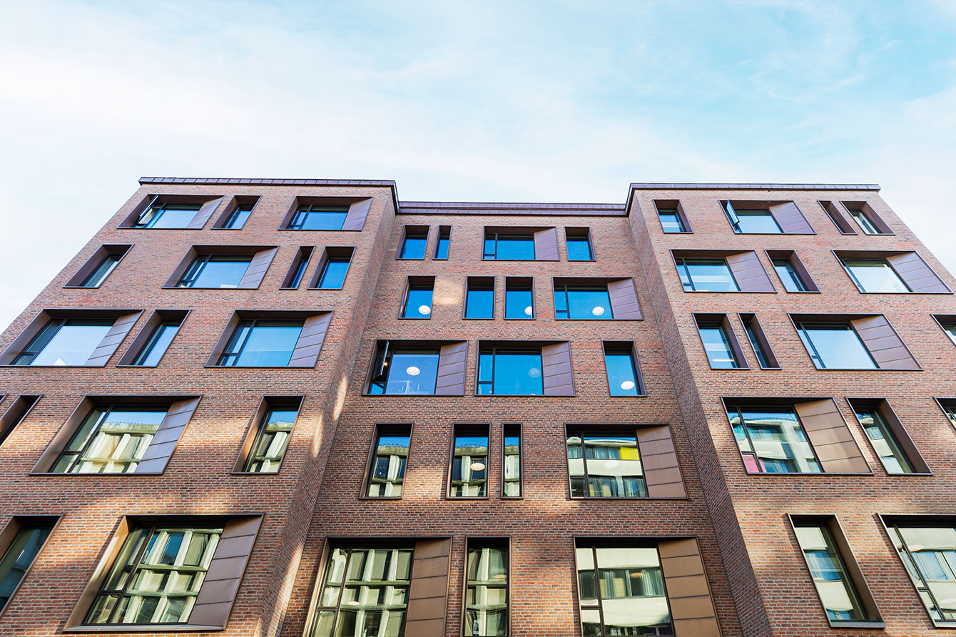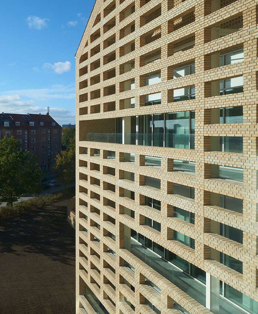 Innovative property in Aalborg City center with a distinct sloping façade. Randers Tegl assisted the performing contractor in designing and planning expansion joints, as well as suspension principles and determination of the masonry course according to the placement of brick bellows. The design of the façade posed special requirements for the building's carrying capacity.