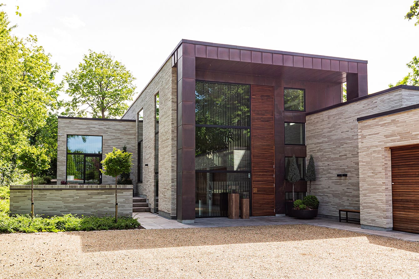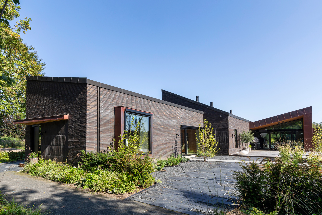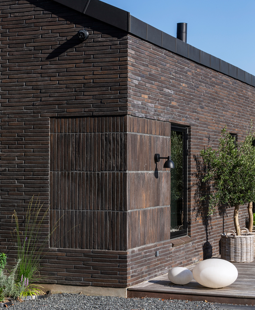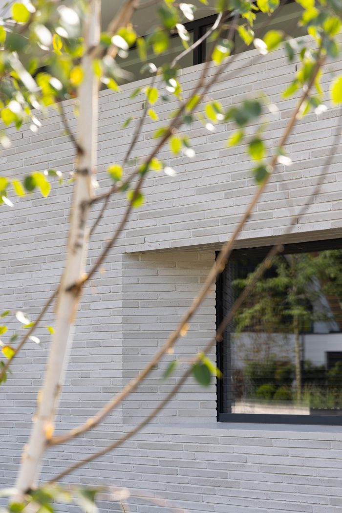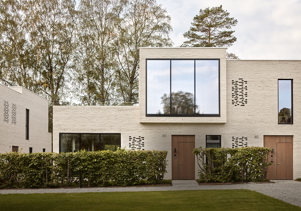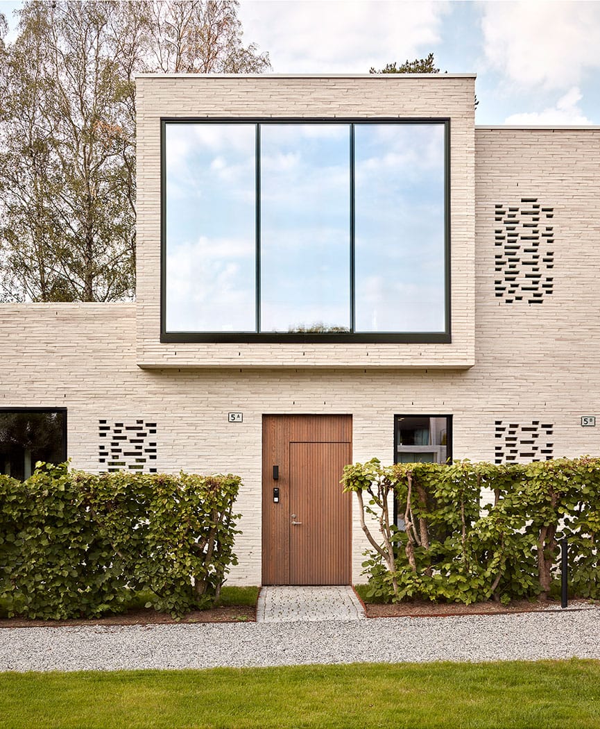 The bricks are light-tinted with a raw and coarse touch that adds a sand-coloured diversity to the finished masonry. The slightly retracted masonry joints have been chosen to bring out the brick’s rustic surfaces even more. This detail rich façade plays elegantly with panels lined with pre-patinated copper cladding and obliquely cut hardwood cladding on the front door and garage doors. A symphony of warm and natural materials that blends in perfect symphony.
