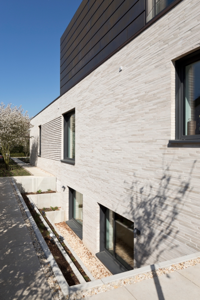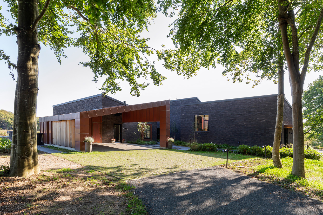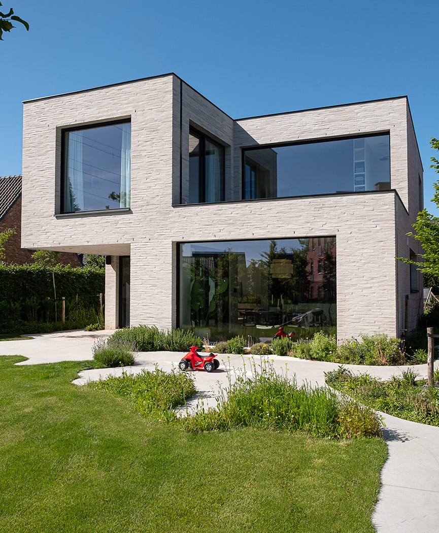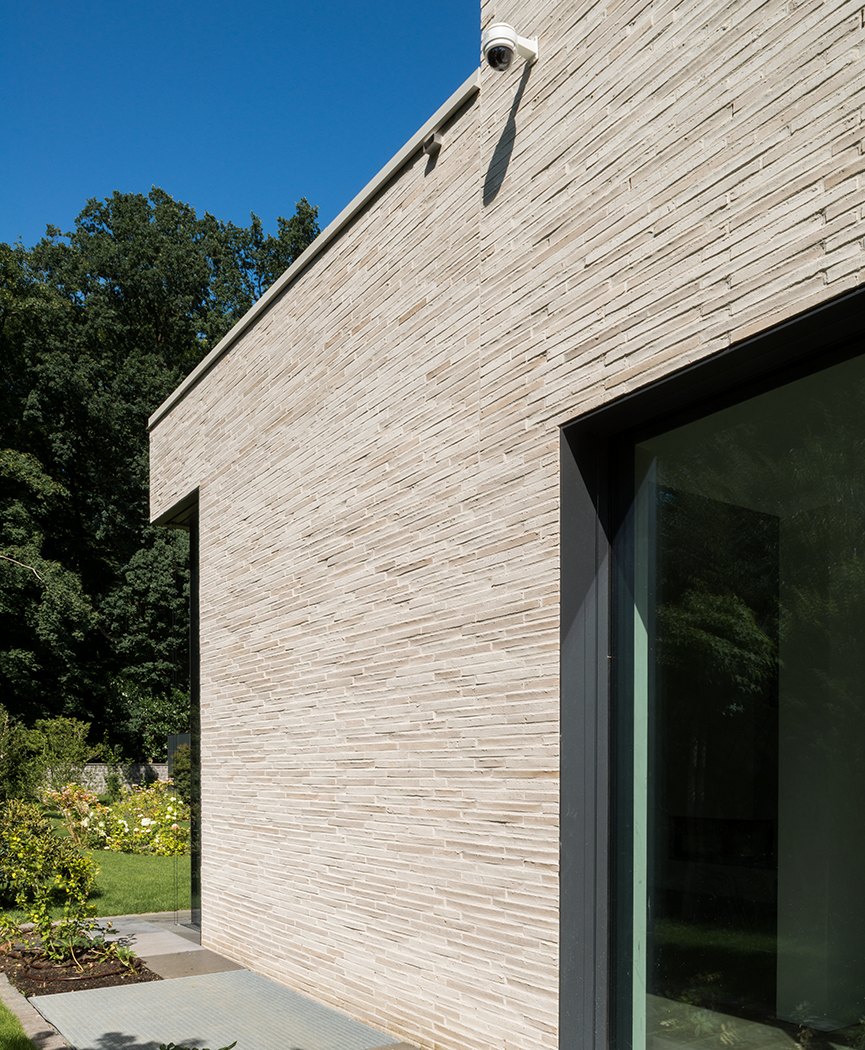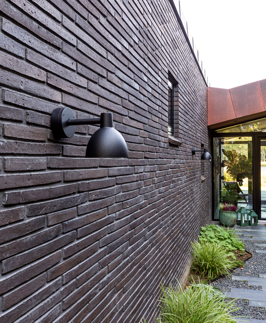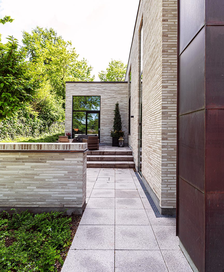 The bricks are light-tinted with a raw and coarse touch that adds a sand-coloured diversity to the finished masonry. The slightly retracted masonry joints have been chosen to bring out the brick’s rustic surfaces even more. This detail rich façade plays elegantly with panels lined with pre-patinated copper cladding and obliquely cut hardwood cladding on the front door and garage doors. A symphony of warm and natural materials that blends in perfect symphony.