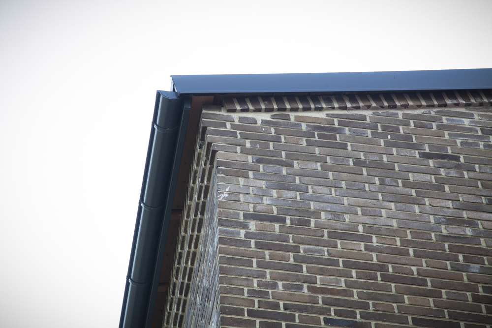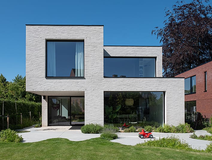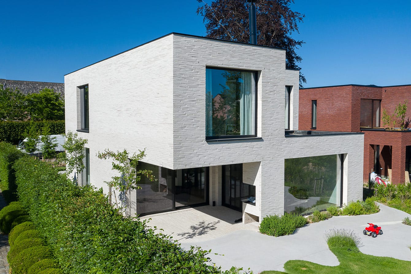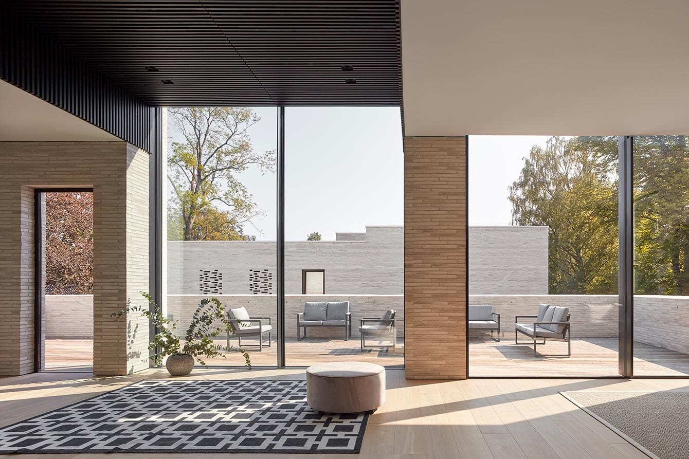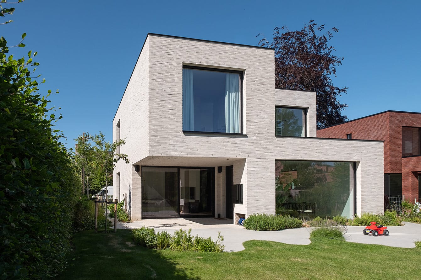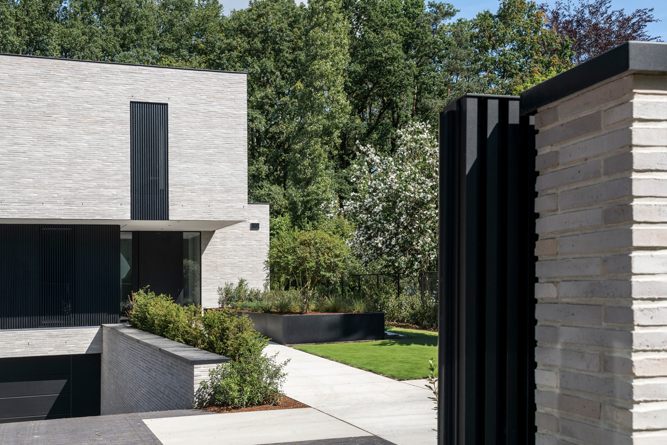 The bricks are light-tinted with a raw and coarse touch that adds a sand-coloured diversity to the finished masonry. The slightly retracted masonry joints have been chosen to bring out the brick’s rustic surfaces even more. This detail rich façade plays elegantly with panels lined with pre-patinated copper cladding and obliquely cut hardwood cladding on the front door and garage doors. A symphony of warm and natural materials that blends in perfect symphony.