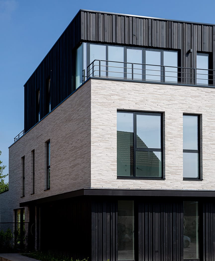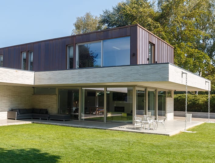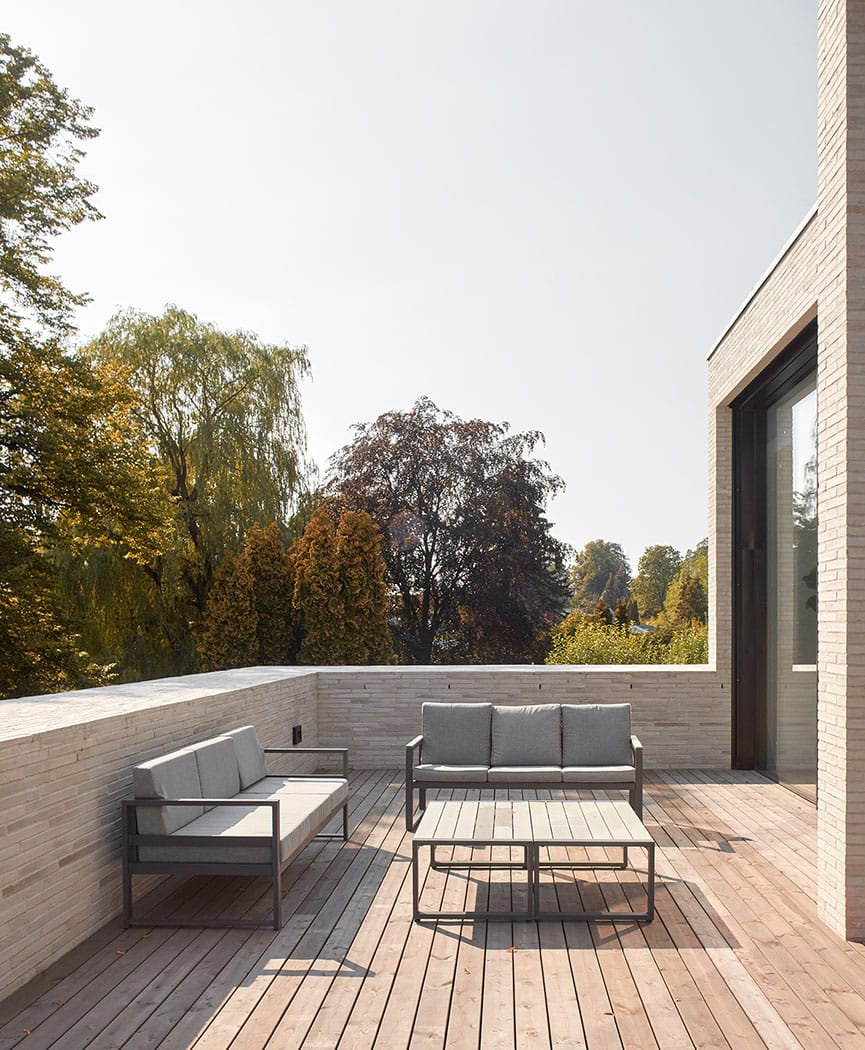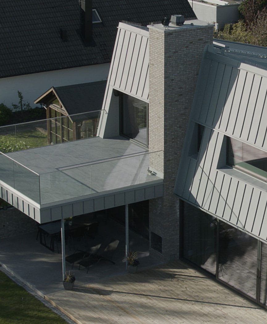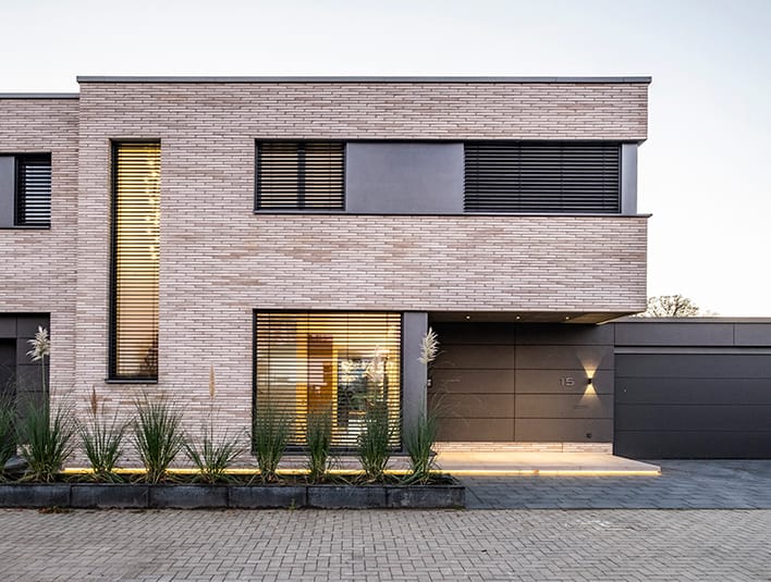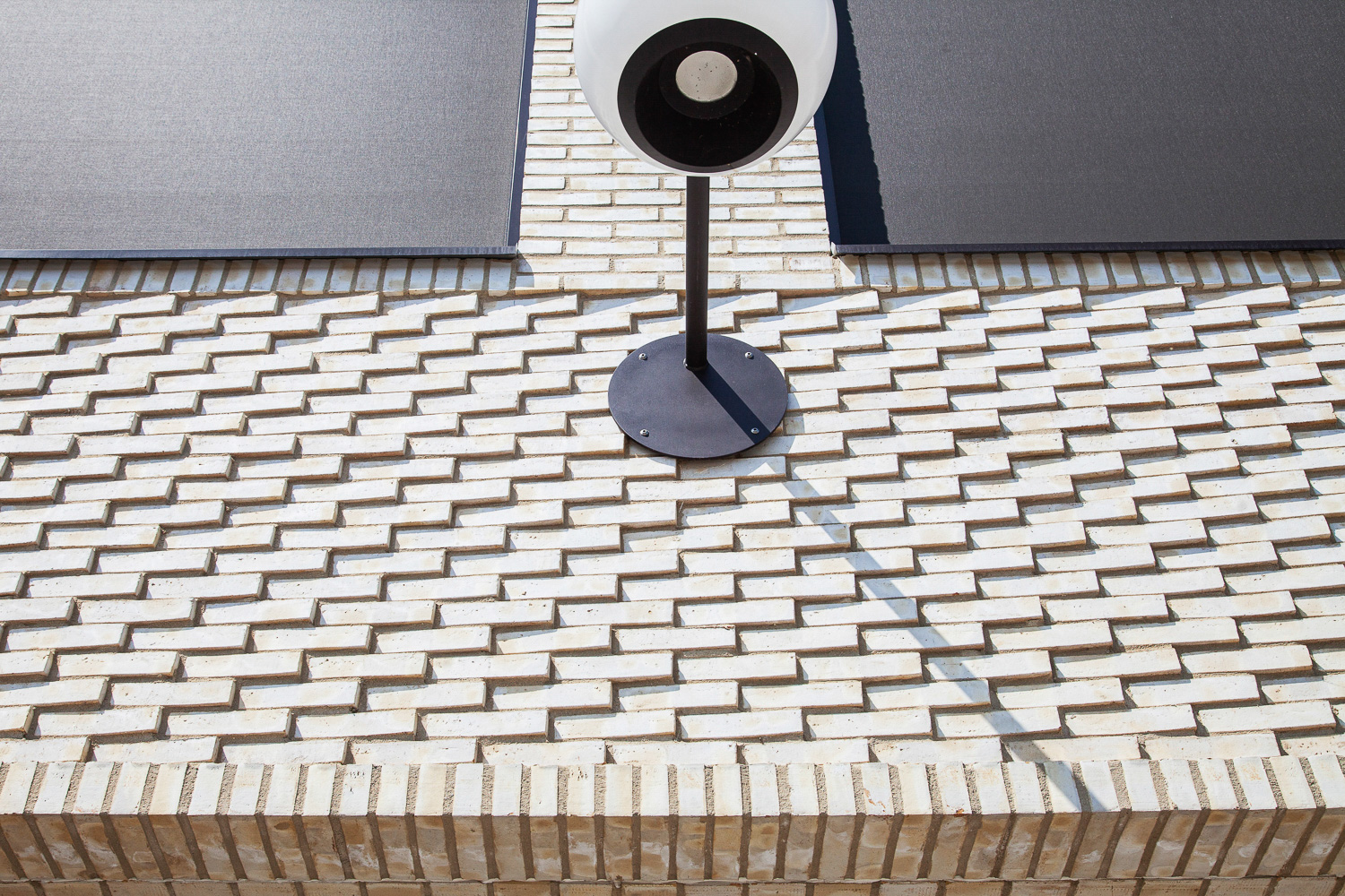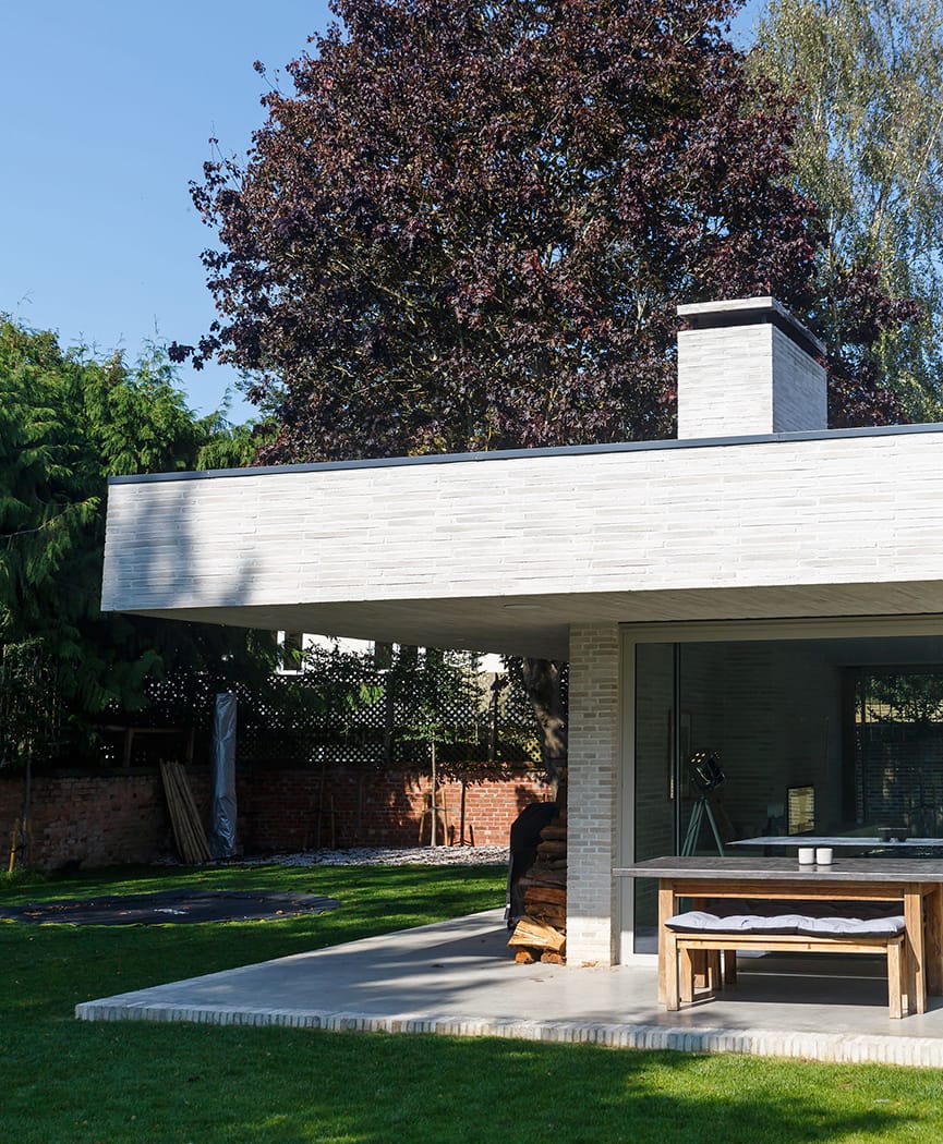 The bricks are light-tinted with a raw and coarse touch that adds a sand-coloured diversity to the finished masonry. The slightly retracted masonry joints have been chosen to bring out the brick’s rustic surfaces even more. This detail rich façade plays elegantly with panels lined with pre-patinated copper cladding and obliquely cut hardwood cladding on the front door and garage doors. A symphony of warm and natural materials that blends in perfect symphony.