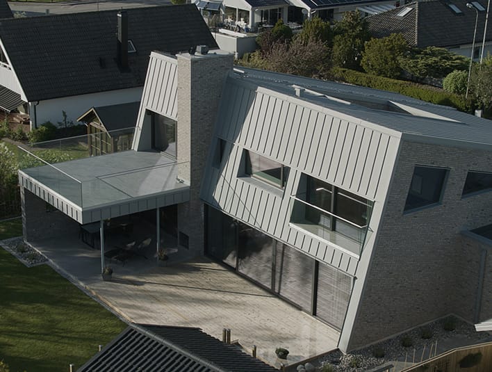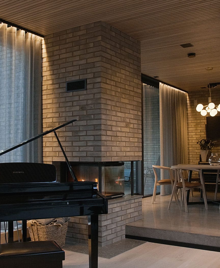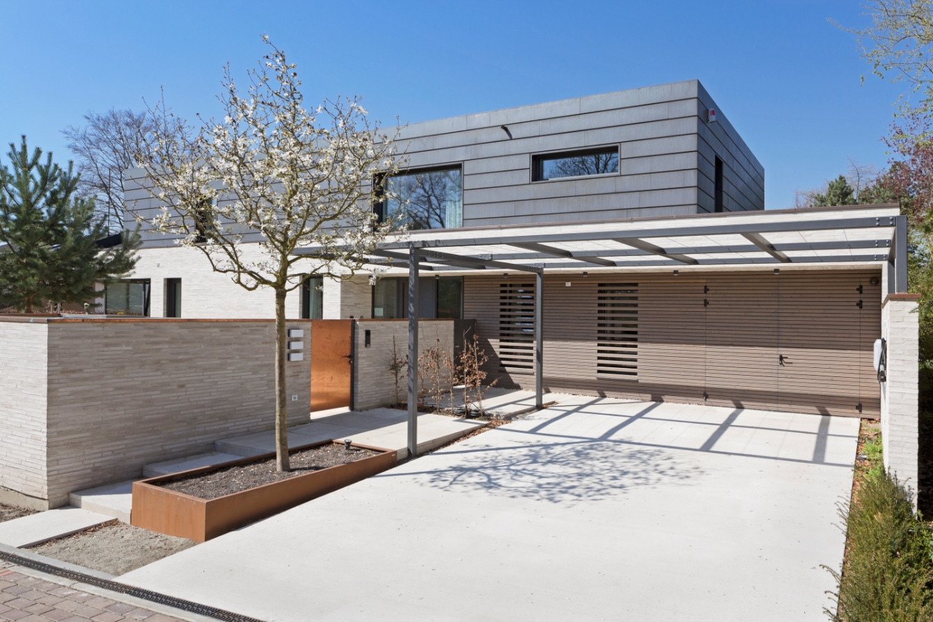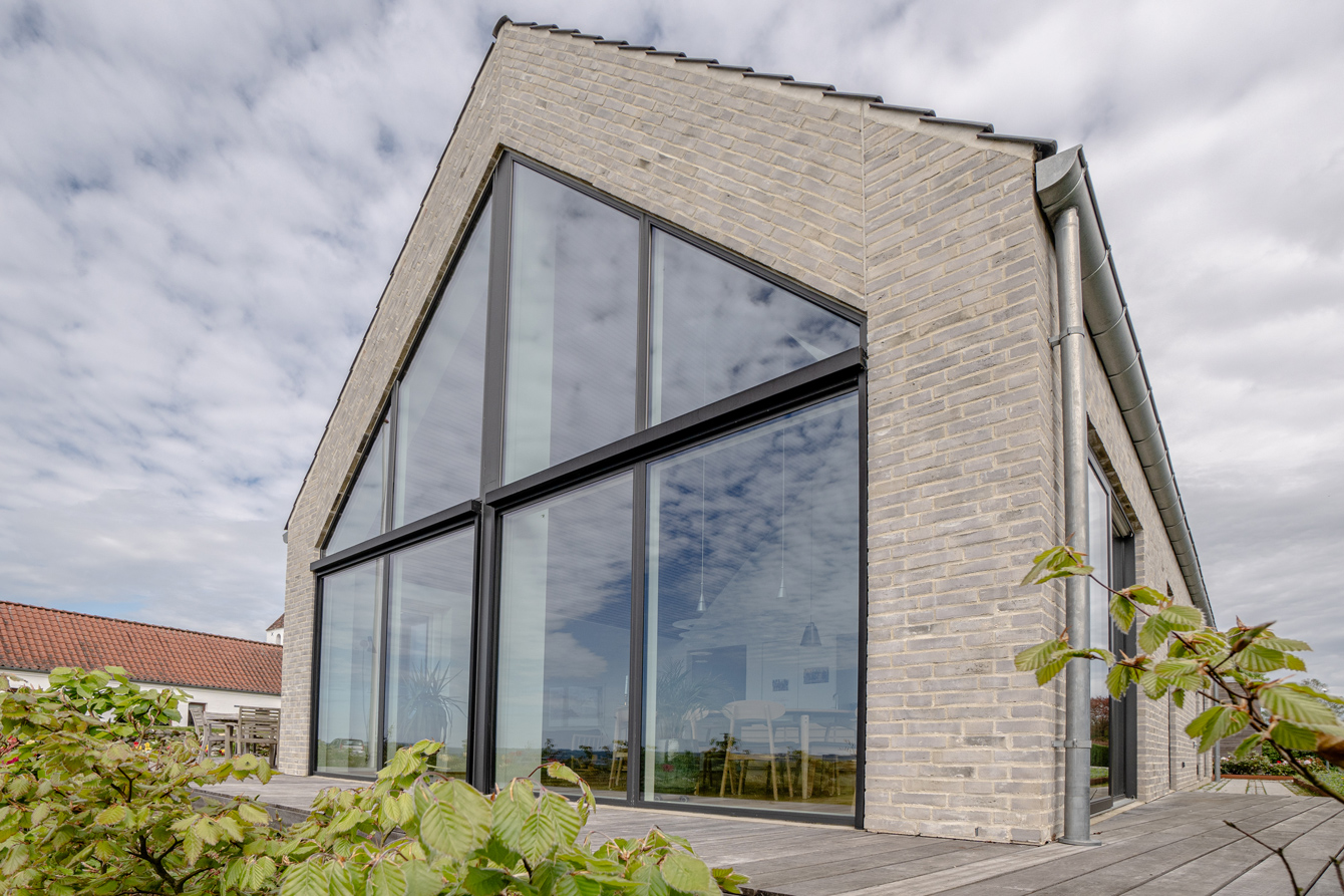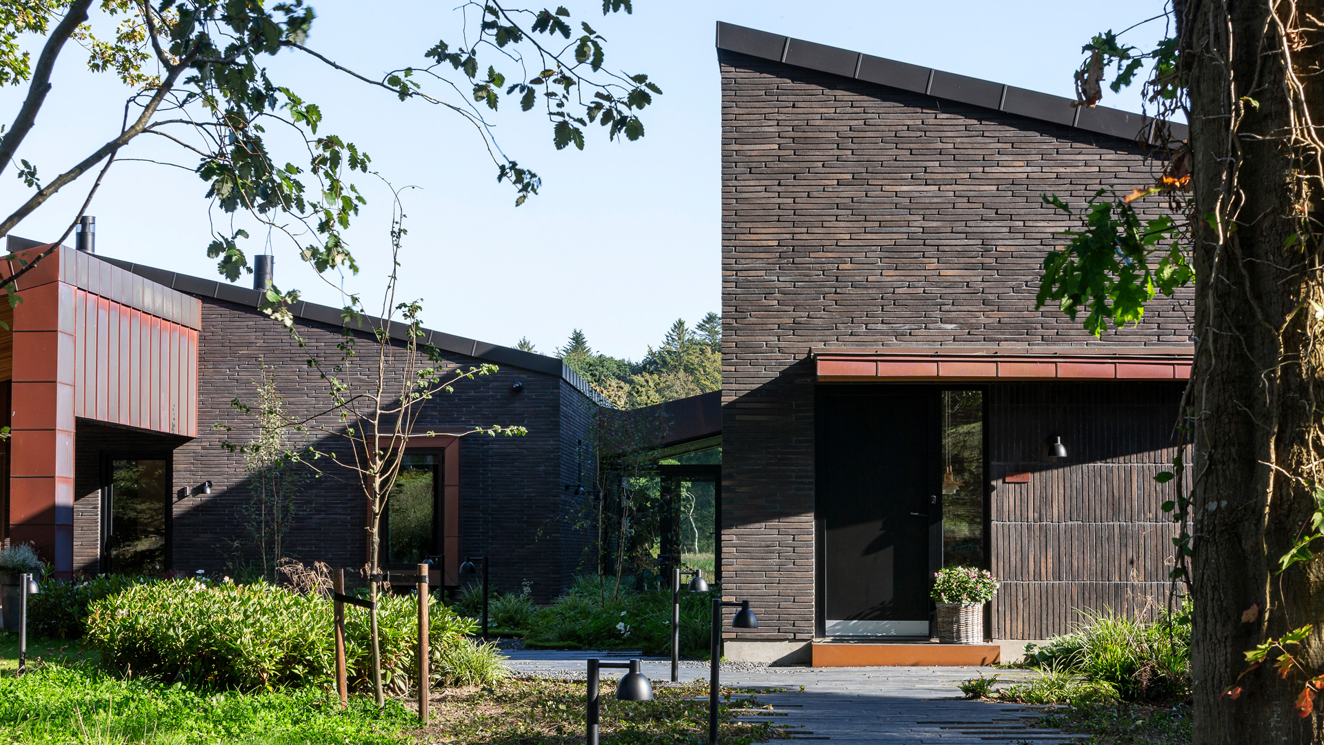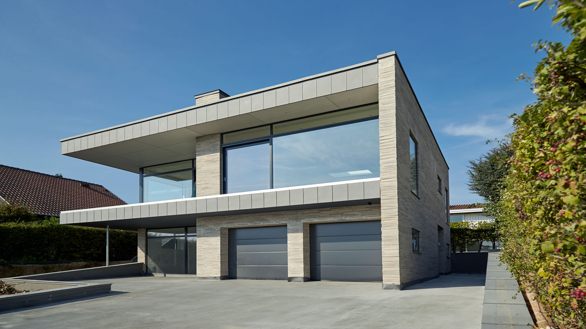 The bricks are light-tinted with a raw and coarse touch that adds a sand-coloured diversity to the finished masonry. The slightly retracted masonry joints have been chosen to bring out the brick’s rustic surfaces even more. This detail rich façade plays elegantly with panels lined with pre-patinated copper cladding and obliquely cut hardwood cladding on the front door and garage doors. A symphony of warm and natural materials that blends in perfect symphony.