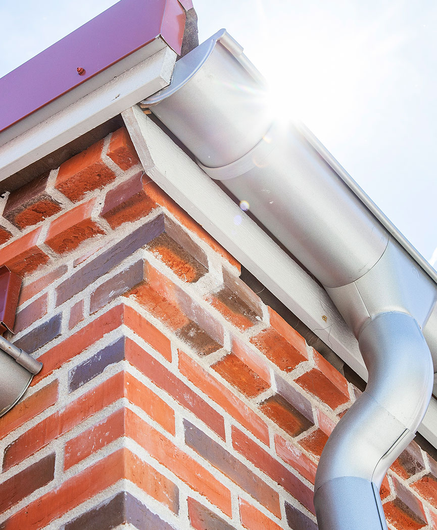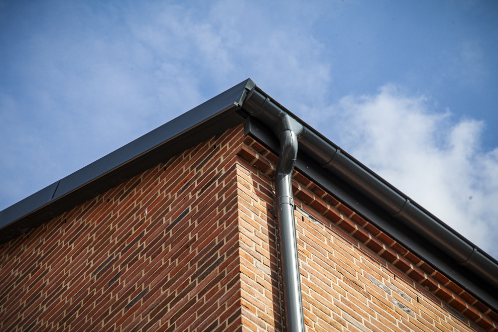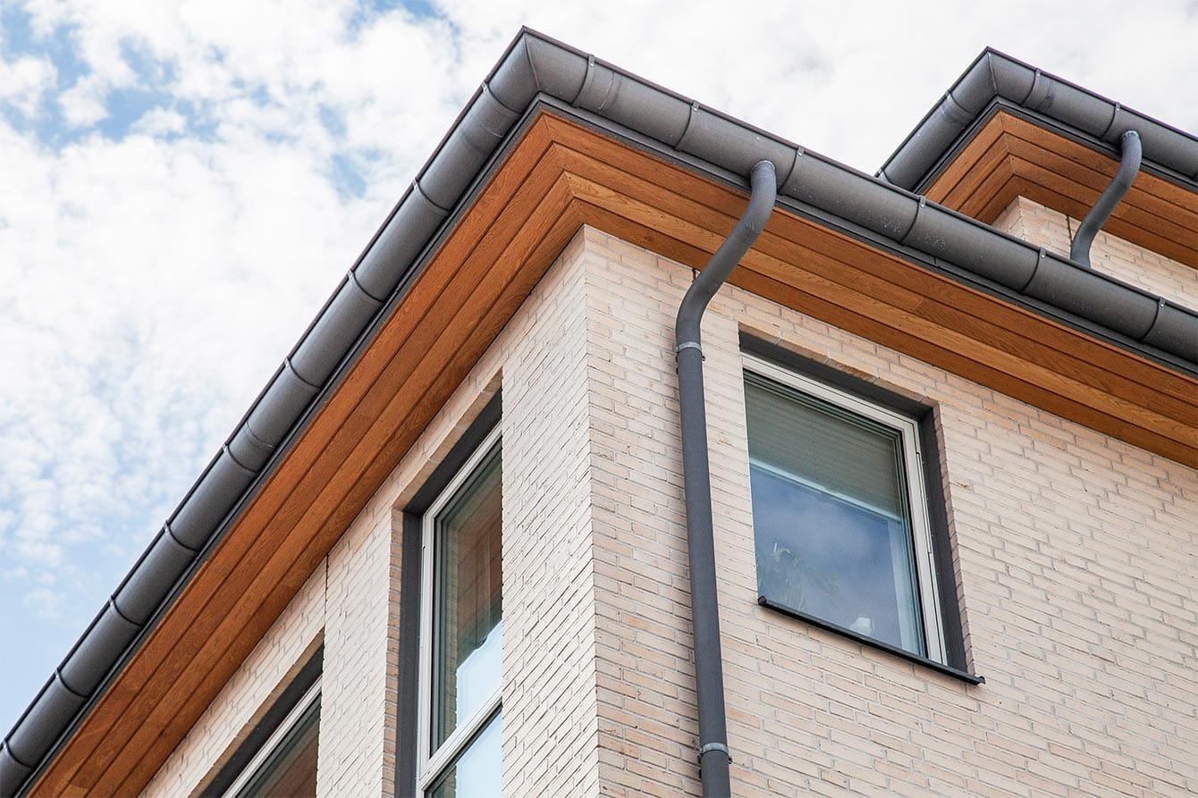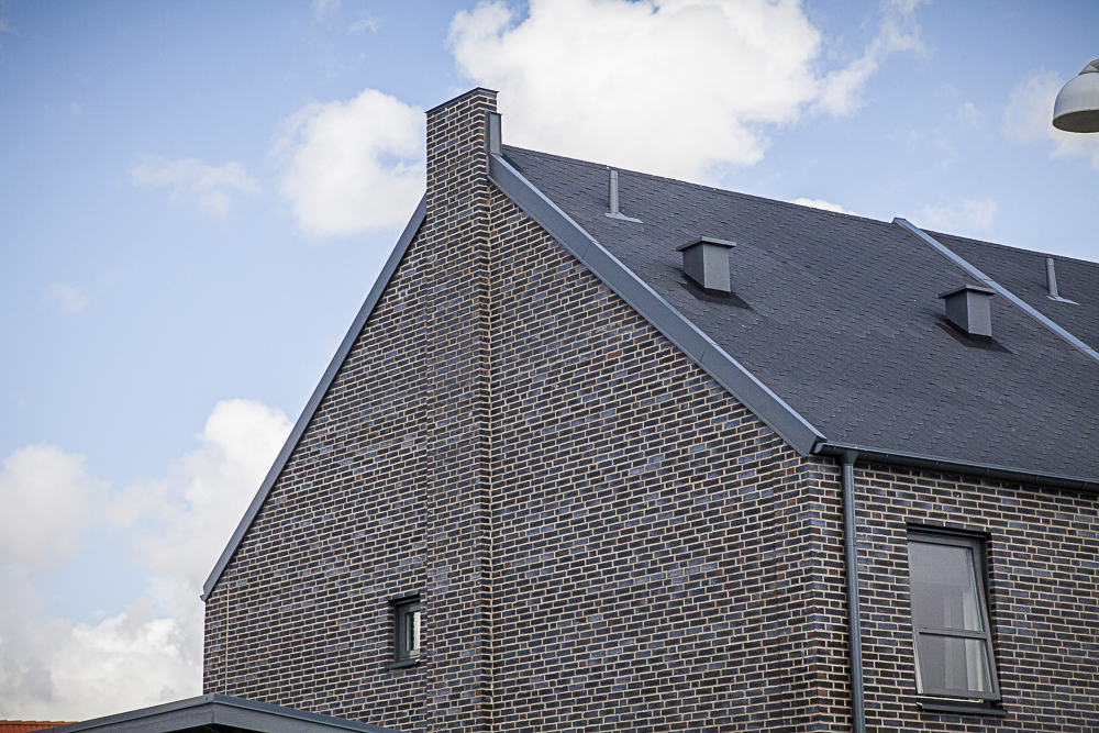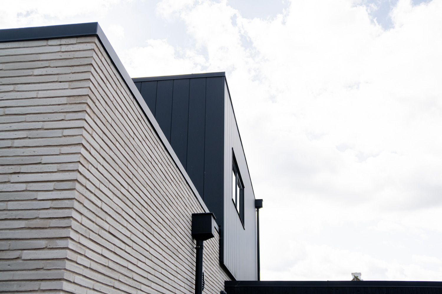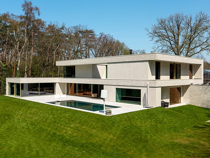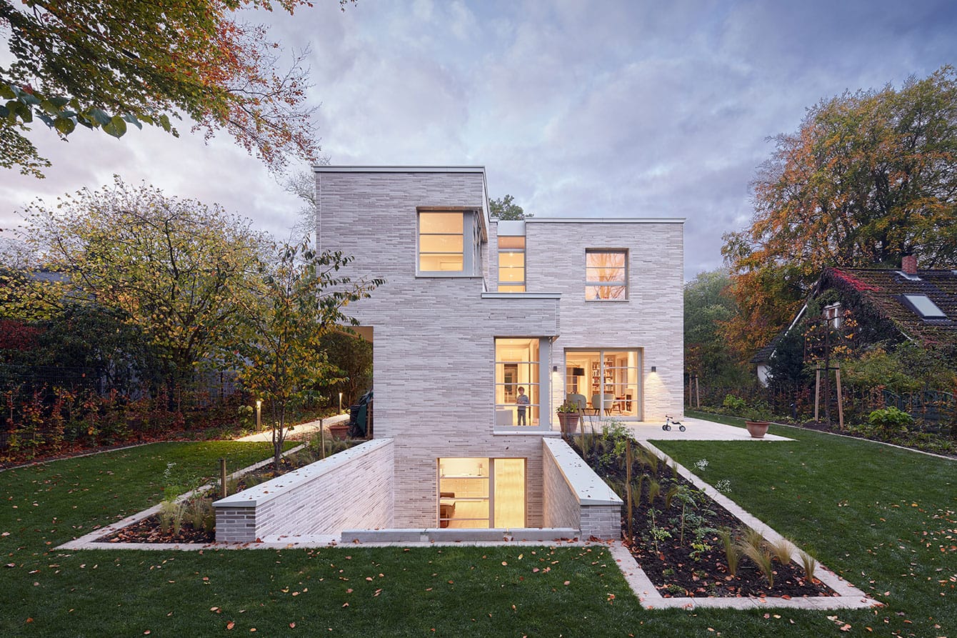 The bricks are light-tinted with a raw and coarse touch that adds a sand-coloured diversity to the finished masonry. The slightly retracted masonry joints have been chosen to bring out the brick’s rustic surfaces even more. This detail rich façade plays elegantly with panels lined with pre-patinated copper cladding and obliquely cut hardwood cladding on the front door and garage doors. A symphony of warm and natural materials that blends in perfect symphony.
