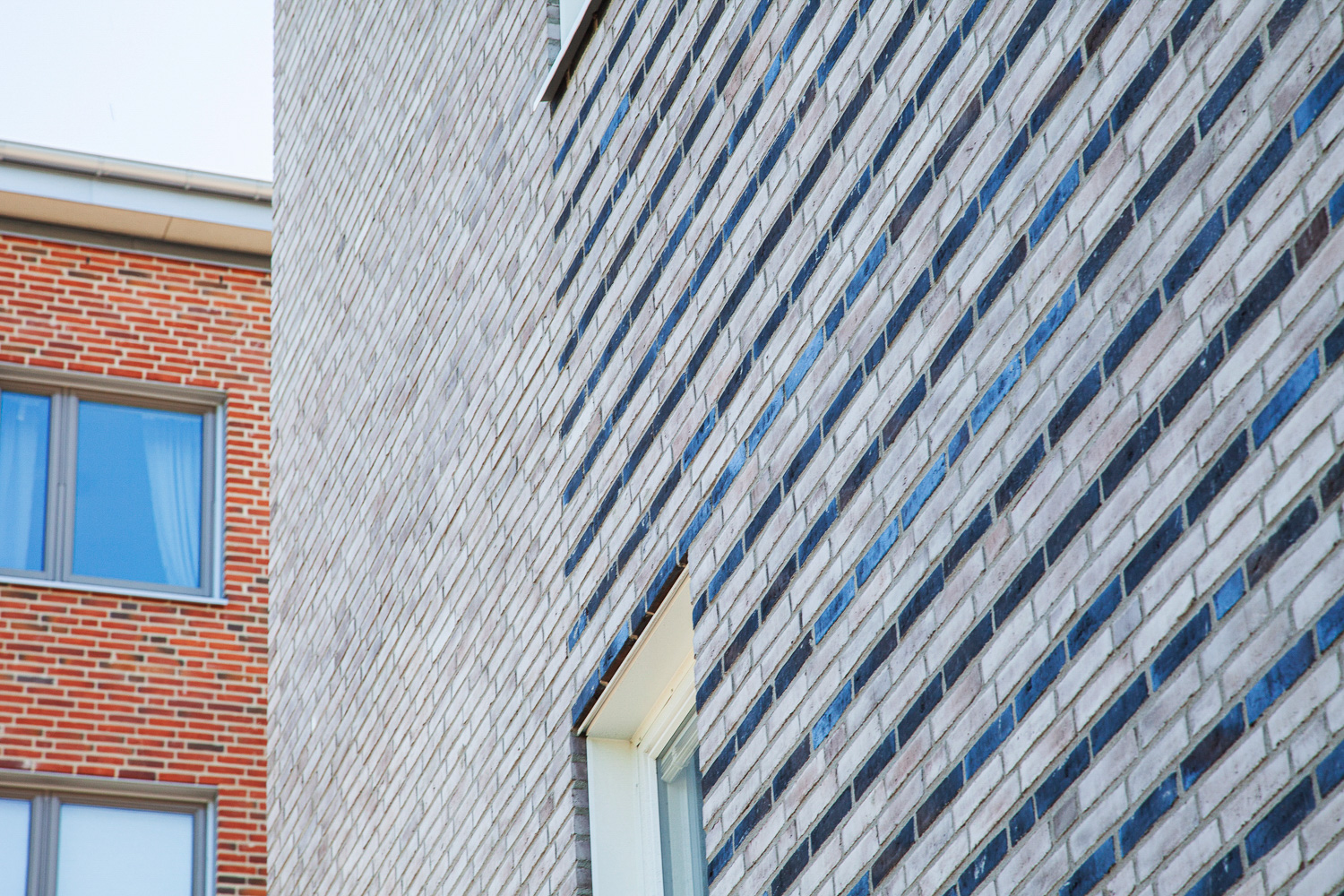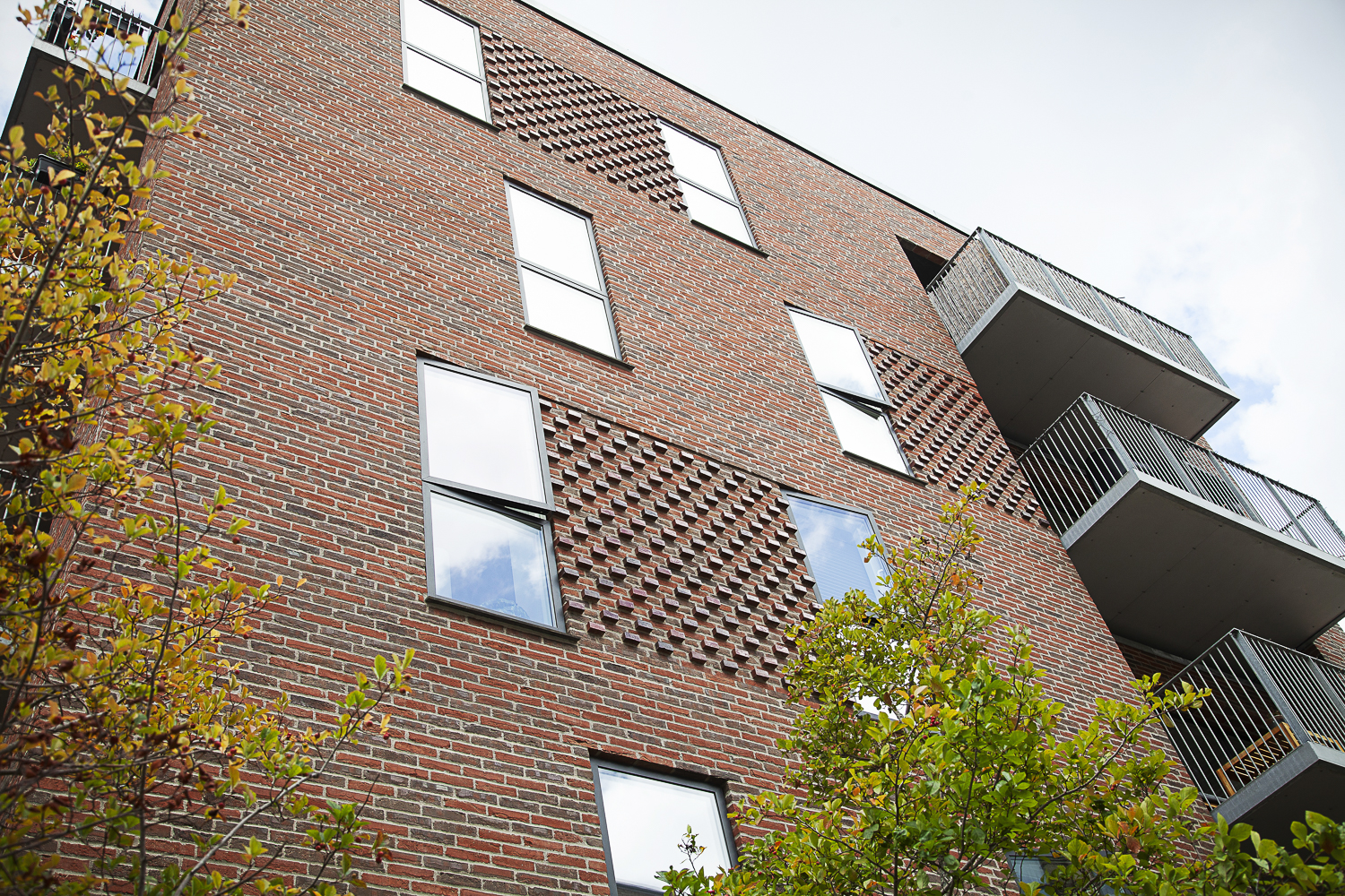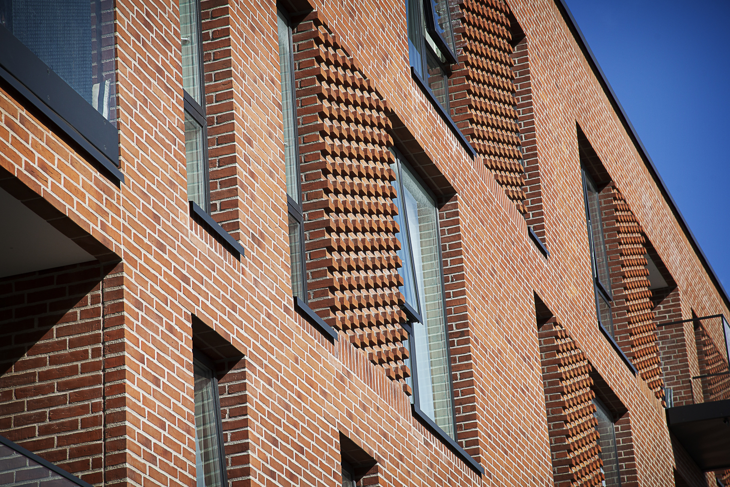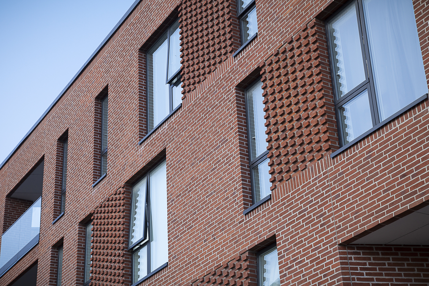 Block of apartment building in three different brick colours with each its distinctive expression. Matching colours and exciting masonry in the façade make these city apartments blend in an architectural sense, despite the different colours.