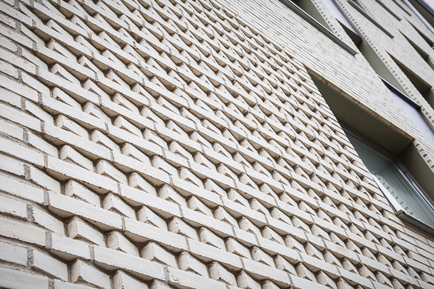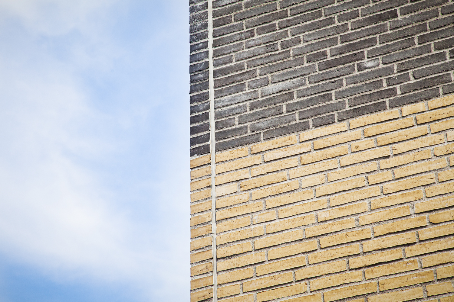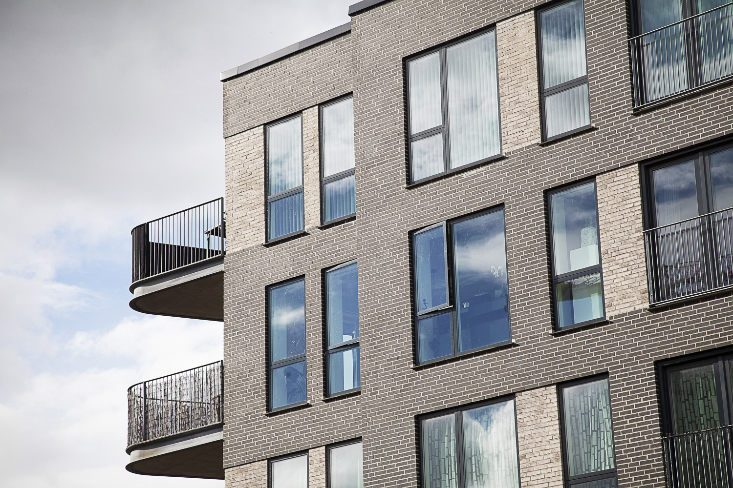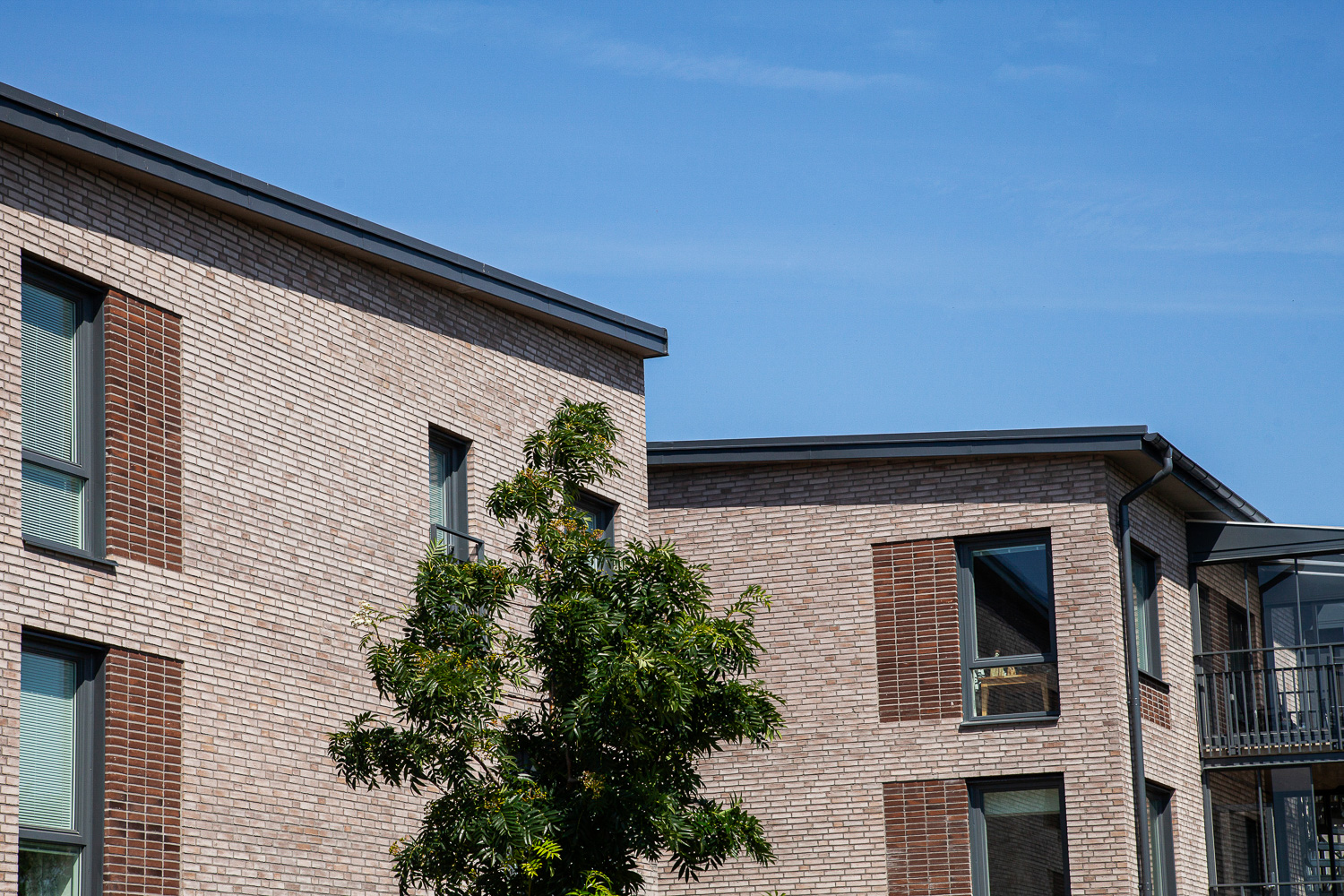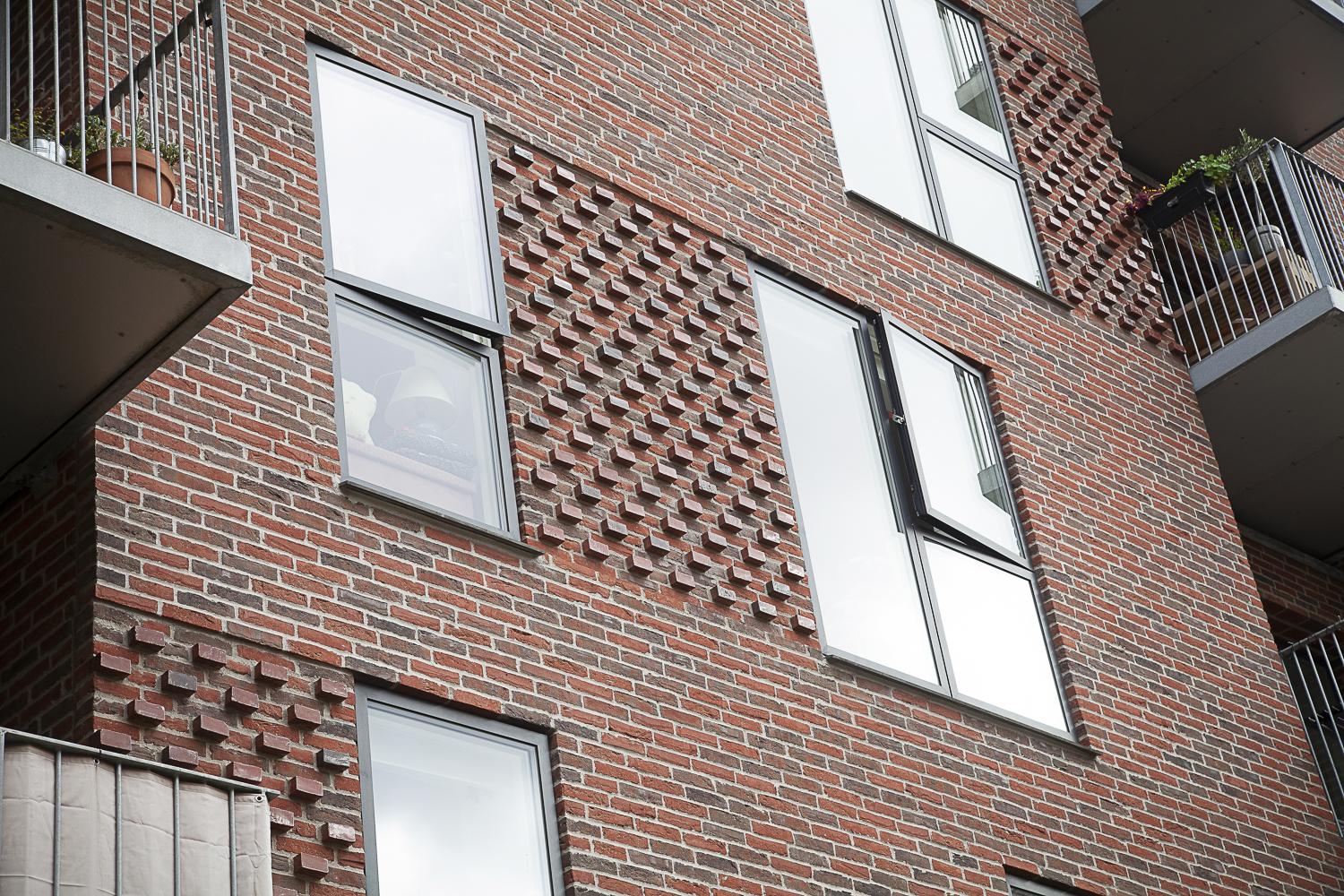 Block of apartment building in three different brick colours with each its distinctive expression. Matching colours and exciting masonry in the façade make these city apartments blend in an architectural sense, despite the different colours.