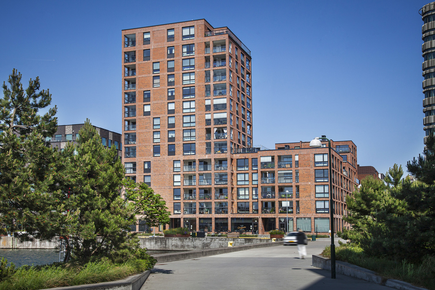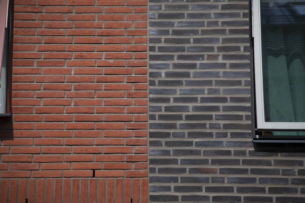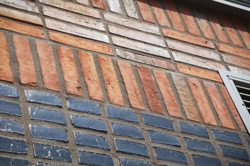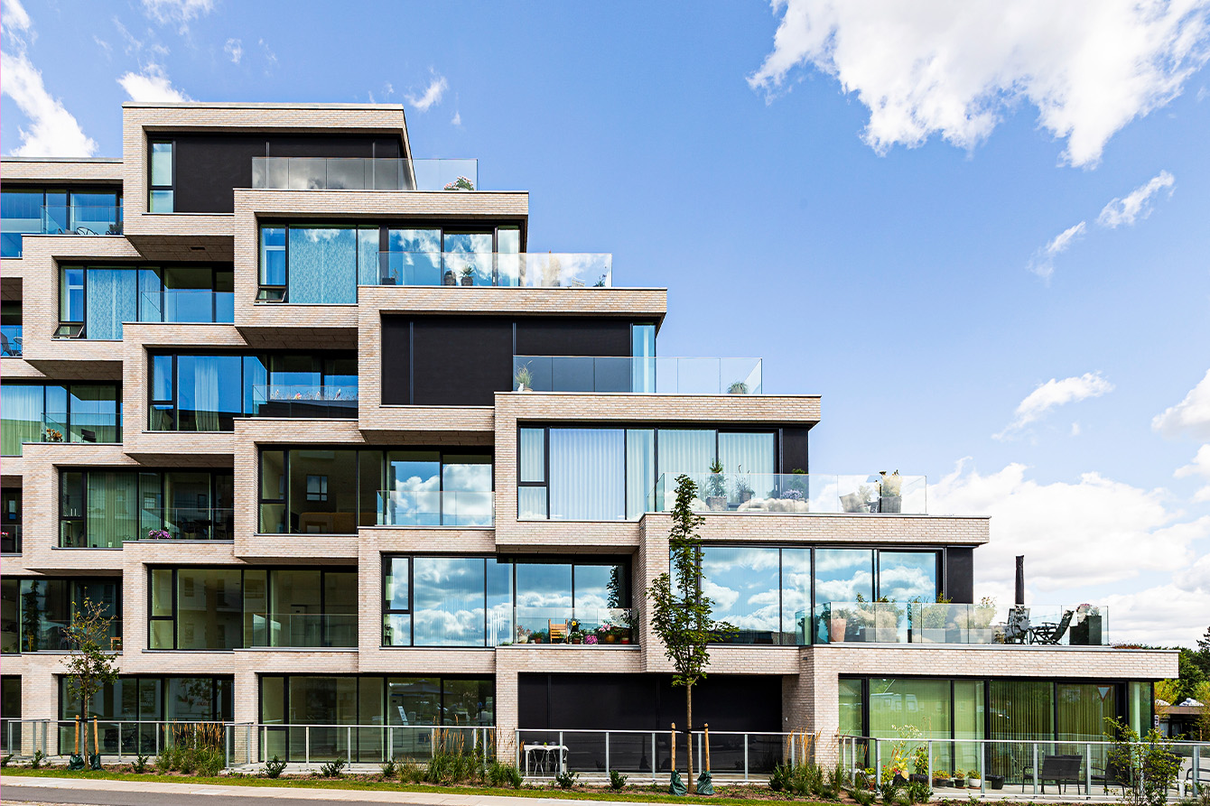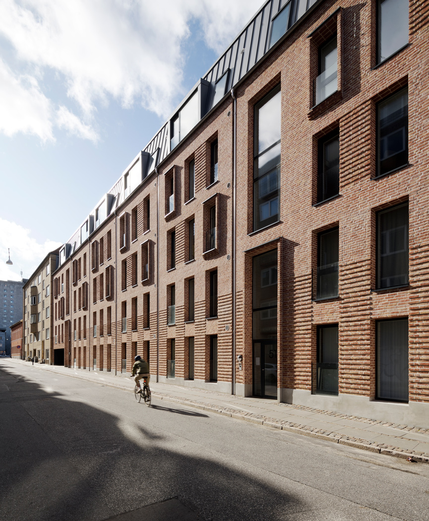 Block of apartment building in three different brick colours with each its distinctive expression. Matching colours and exciting masonry in the façade make these city apartments blend in an architectural sense, despite the different colours.