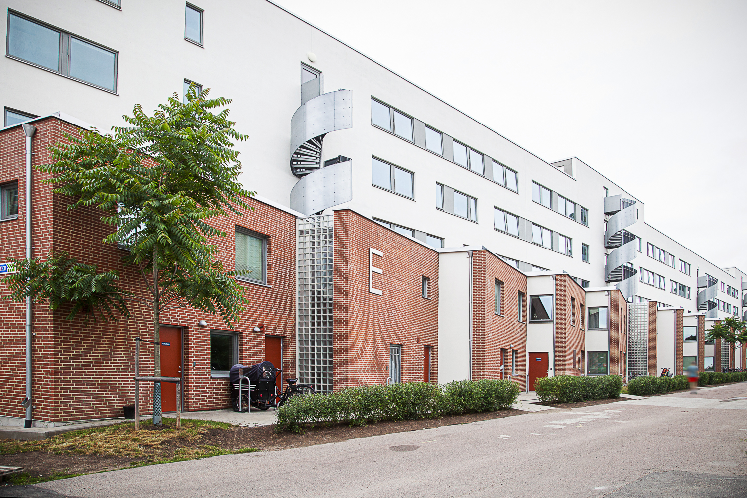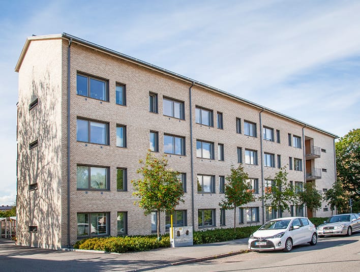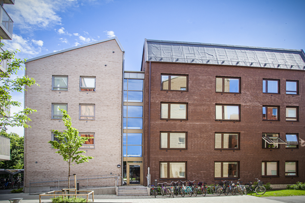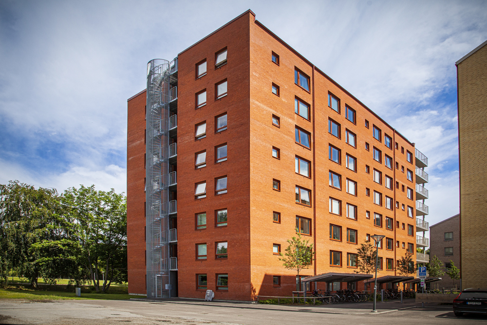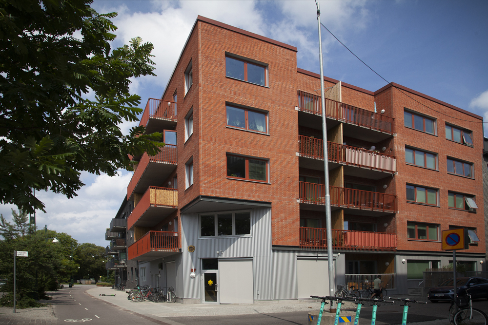 Apartment building in Sweden with bright light-yellow bricks that give a classic and modern look. 58 space-optimized apartments dwell in the outskirts of Uppsala with green recreative areas for inhabitants to enjoy.