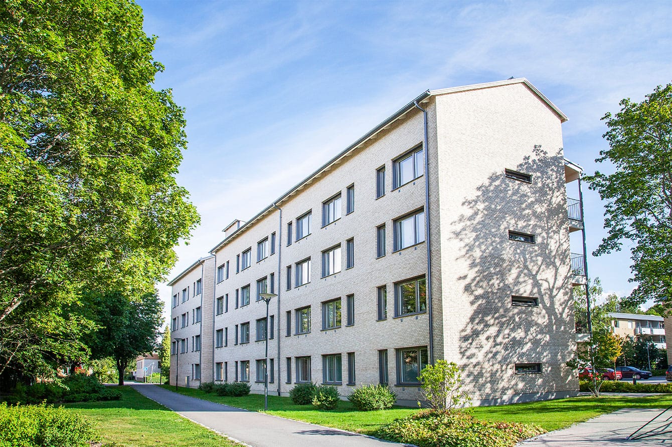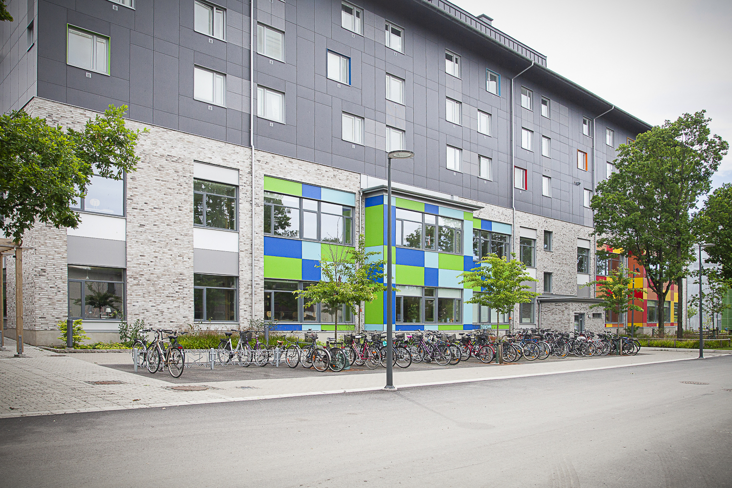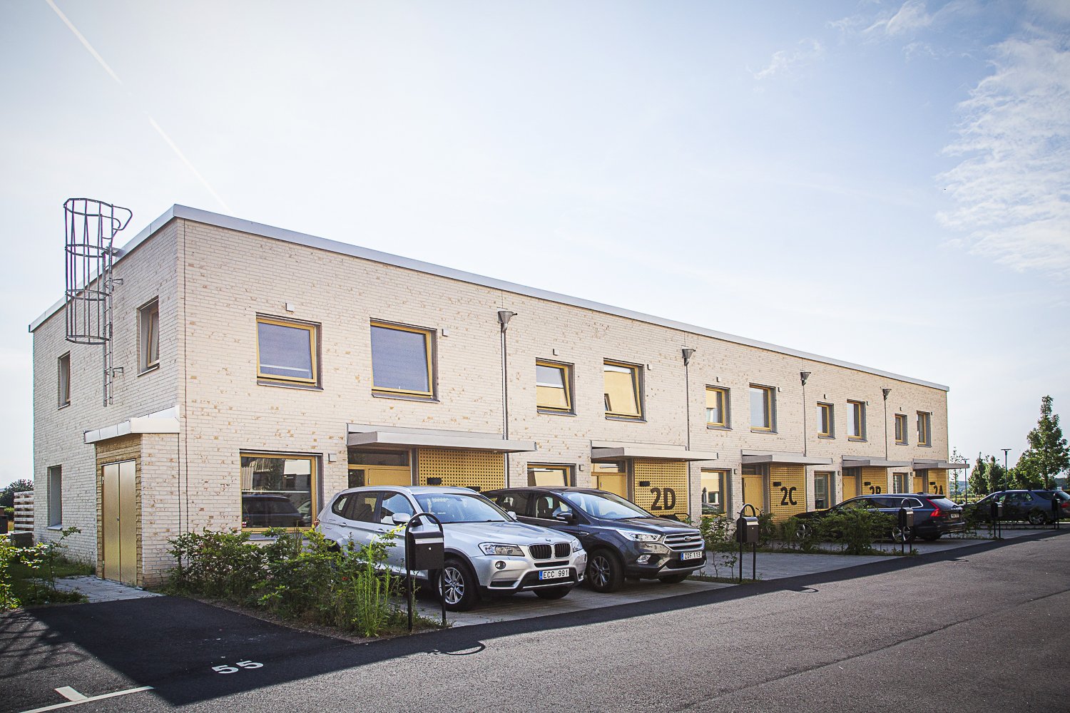 Apartment building in Sweden with bright light-yellow bricks that give a classic and modern look. 58 space-optimized apartments dwell in the outskirts of Uppsala with green recreative areas for inhabitants to enjoy.