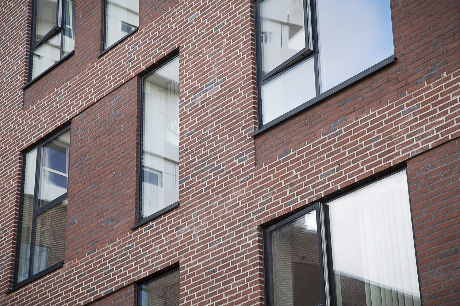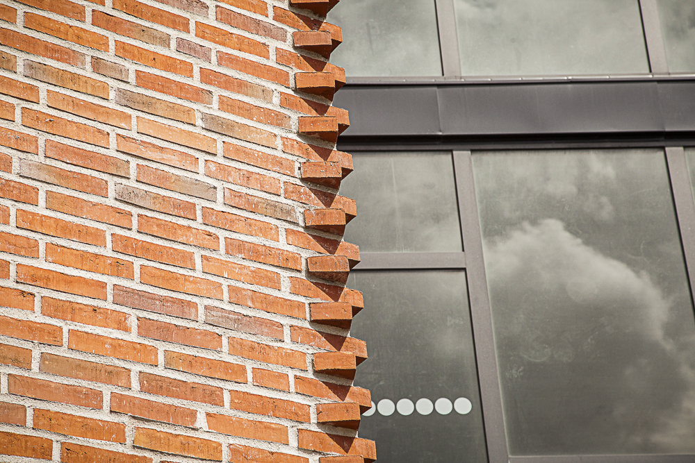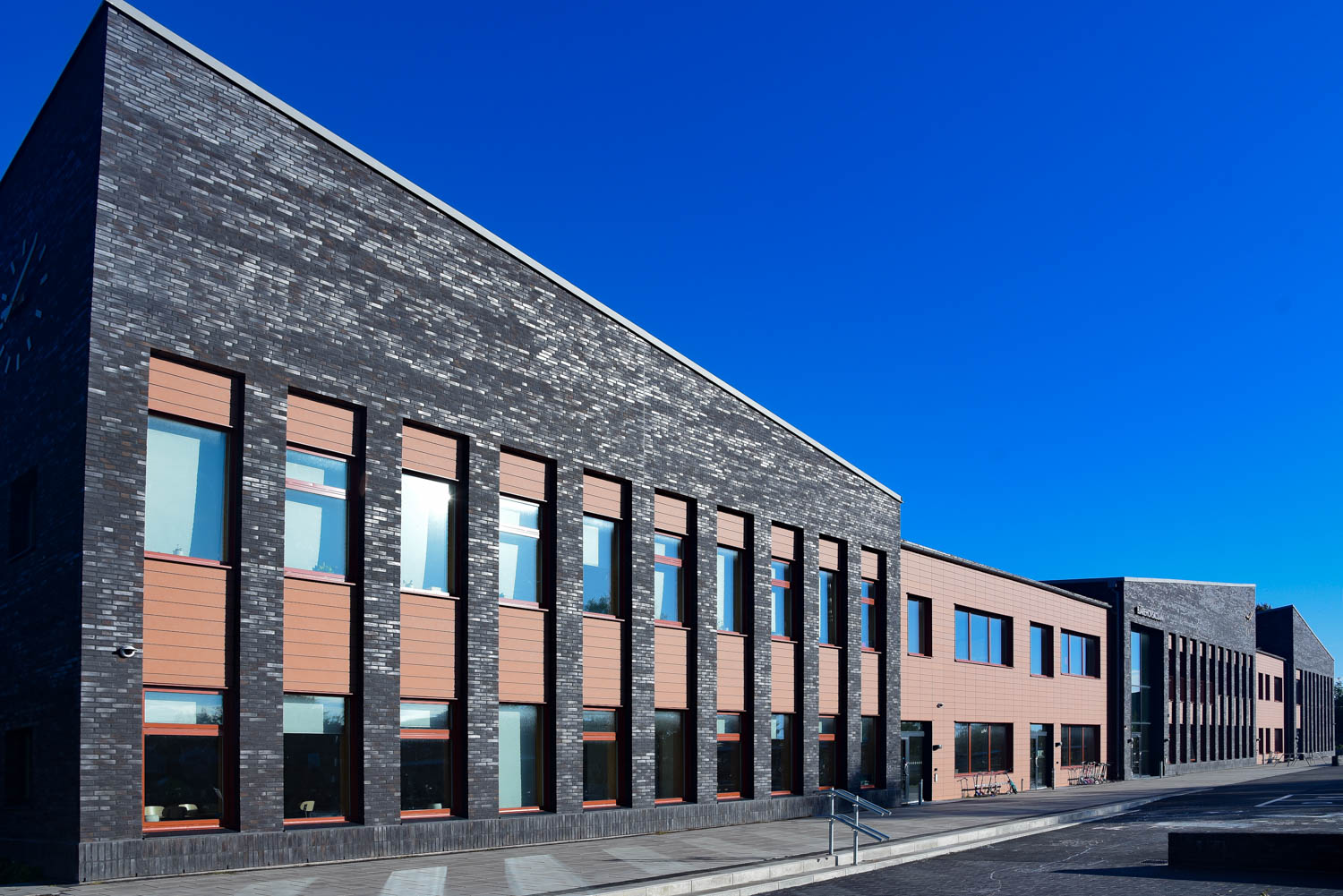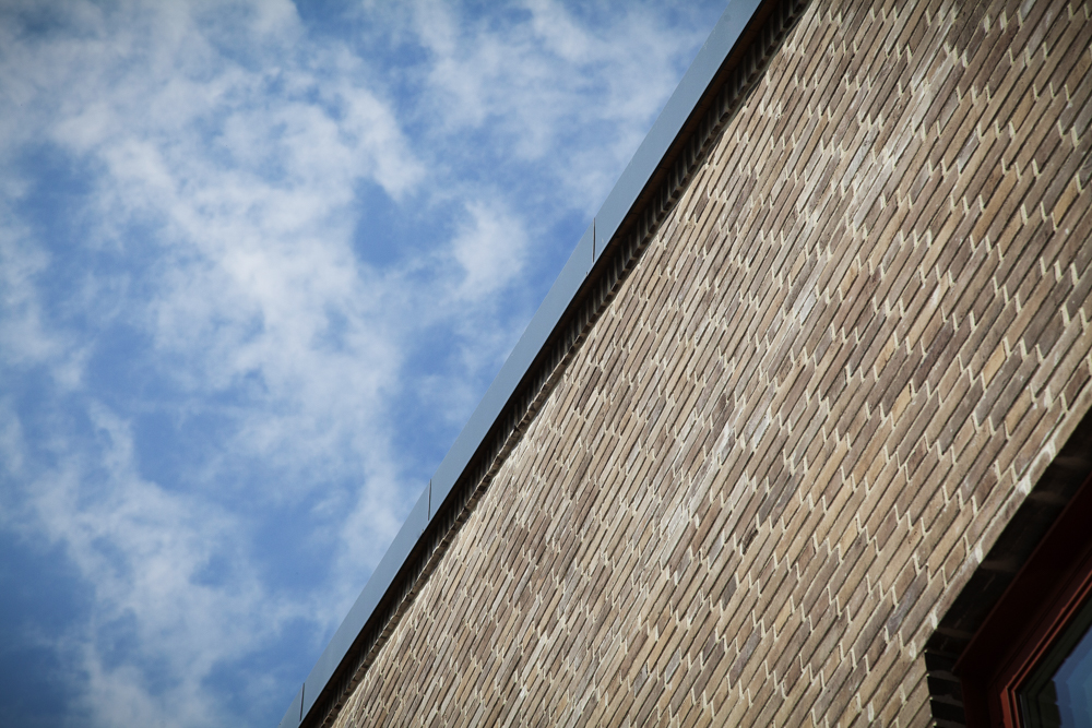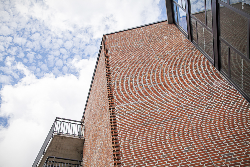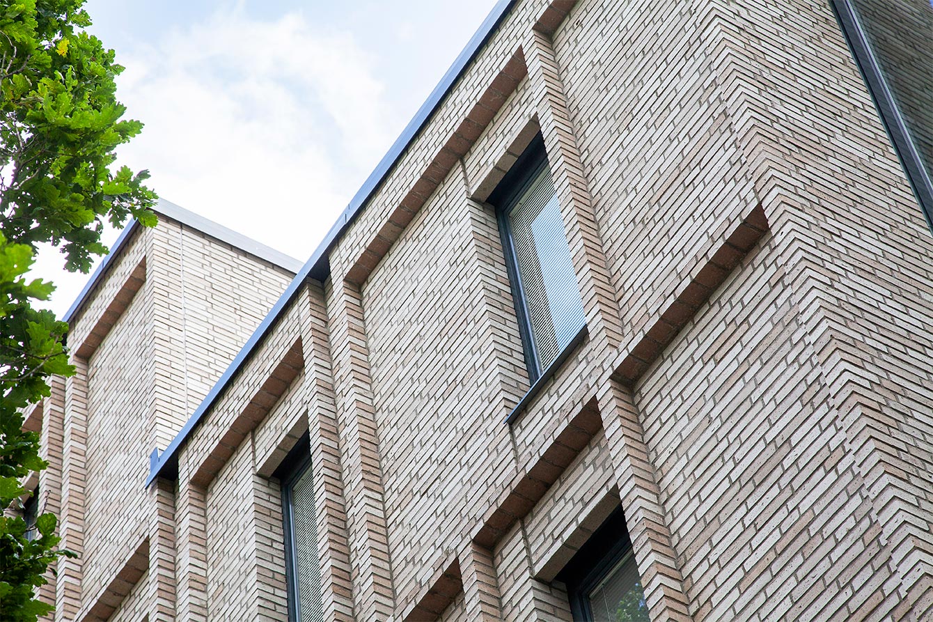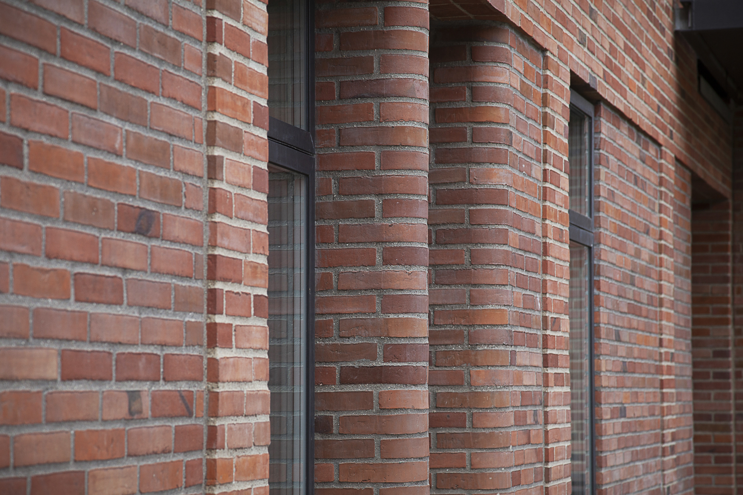 A modern campus building for the students where the special technique to apply the dark grey mortar gives an exciting expression. The glass roof accentuates the modernity.