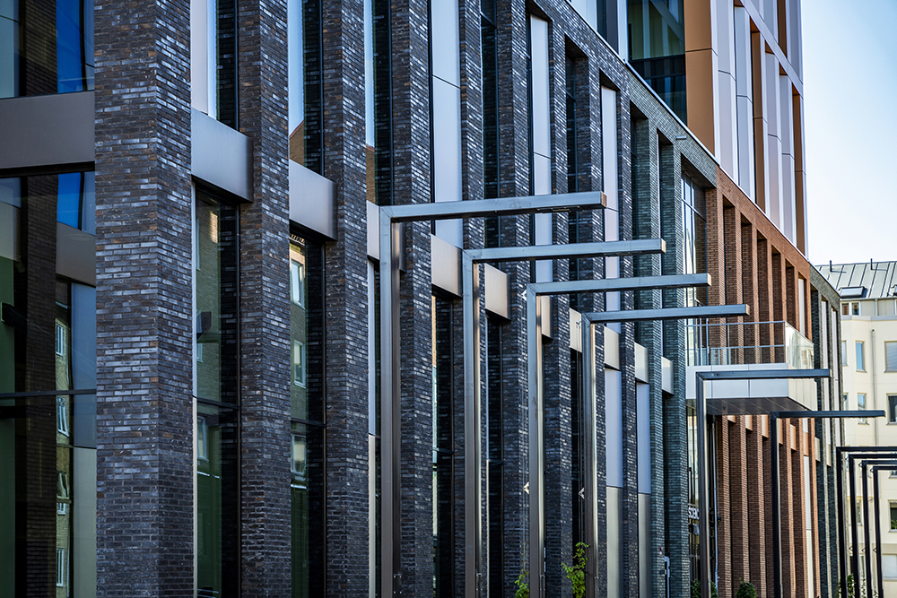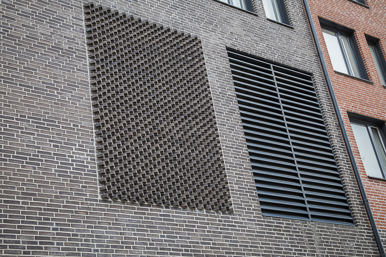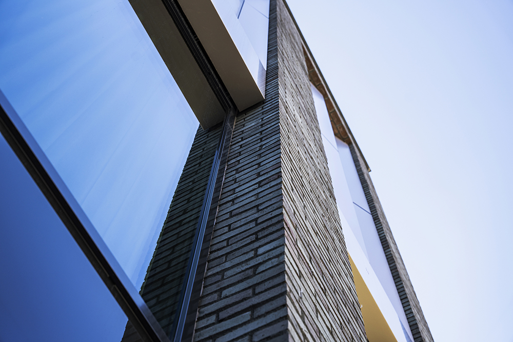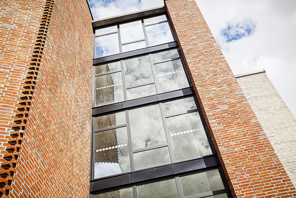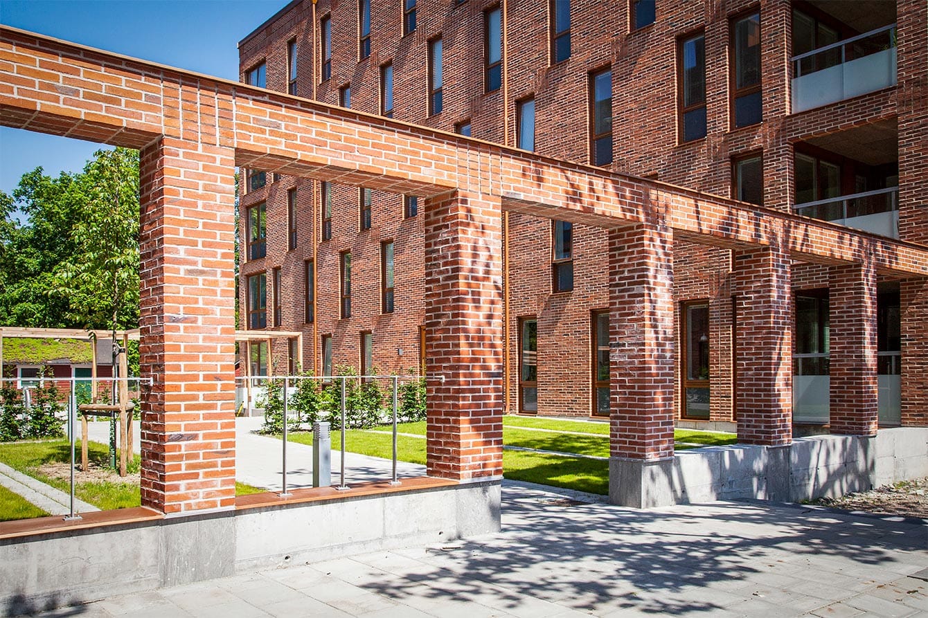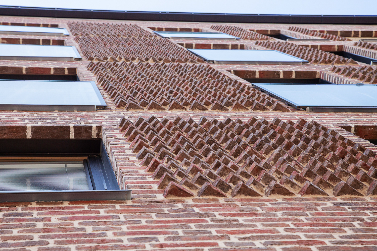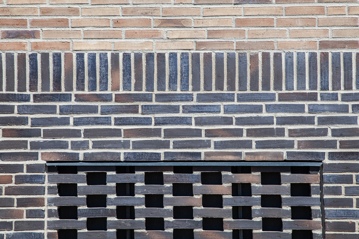 A modern campus building for the students where the special technique to apply the dark grey mortar gives an exciting expression. The glass roof accentuates the modernity.