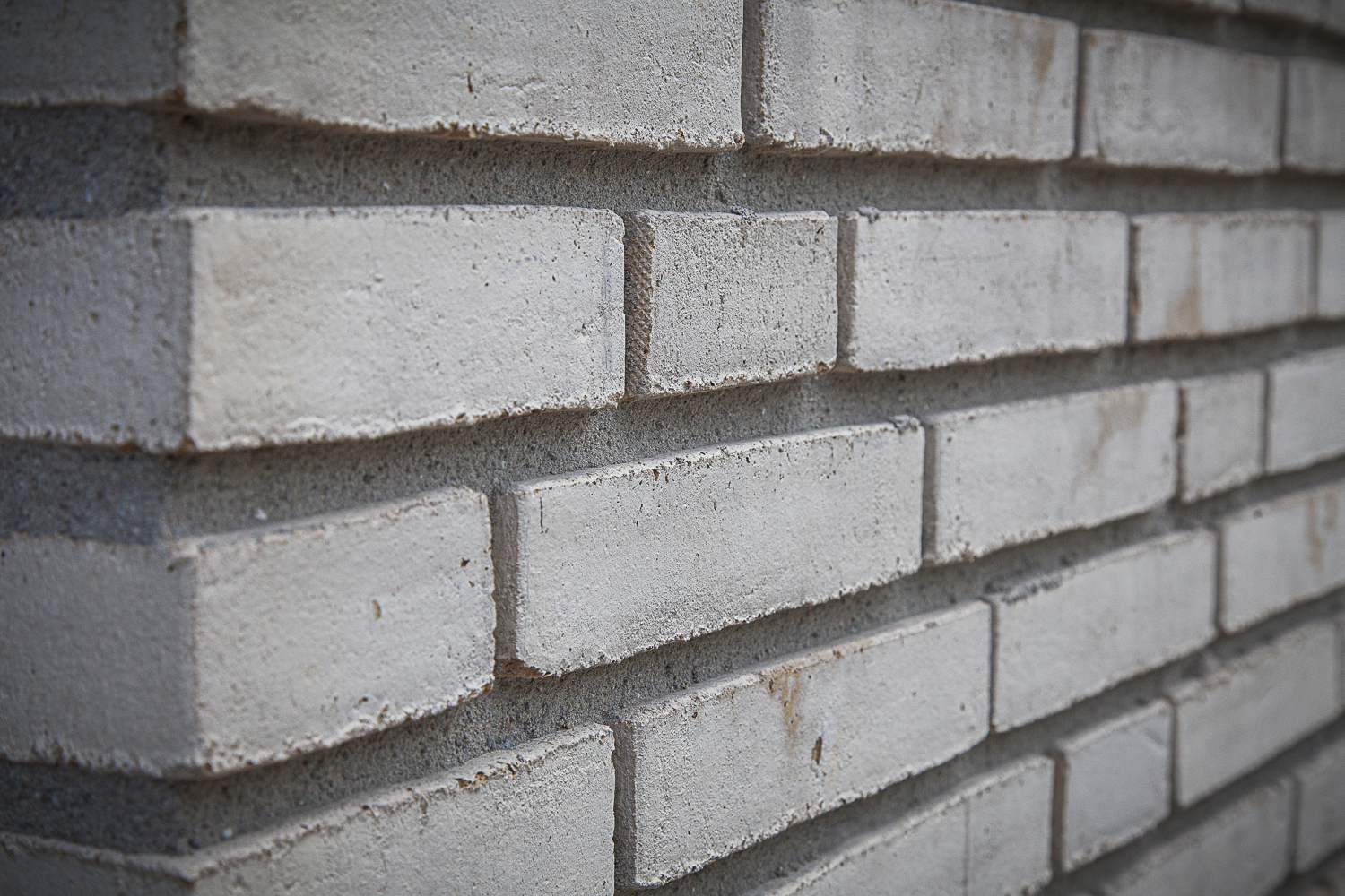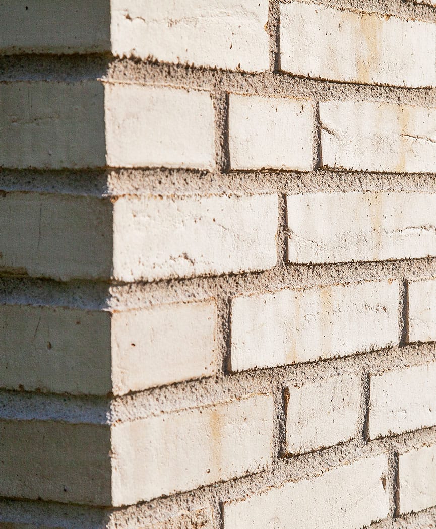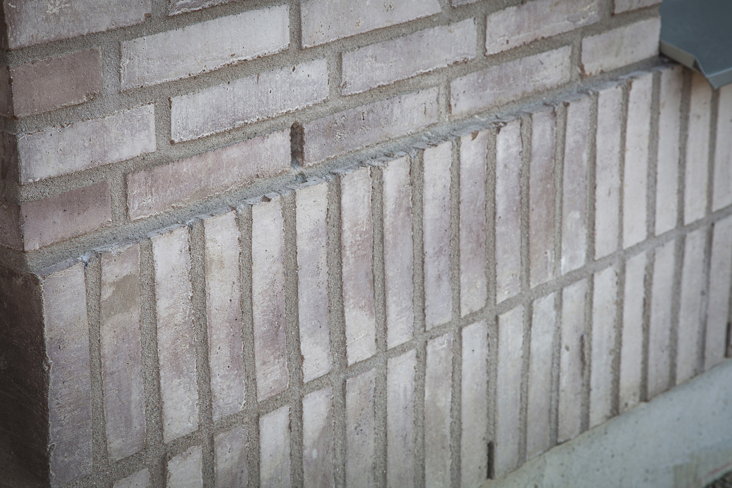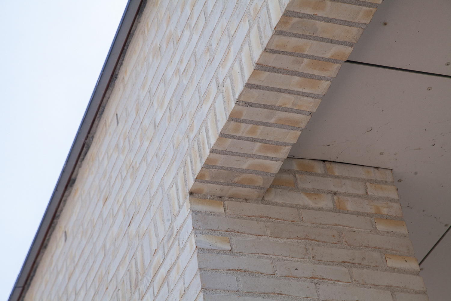Tegelpelarna utgör en jämn rytm genom hela projektet där pelarbredden är dimensionerad efter tegelstenens format (två helstenar + kopp). Halvstensförband används konsekvent för att optimera tegelförbrukningen och minimera spill. Fogar är infärgade för att uppnå ett monokromt utseende.