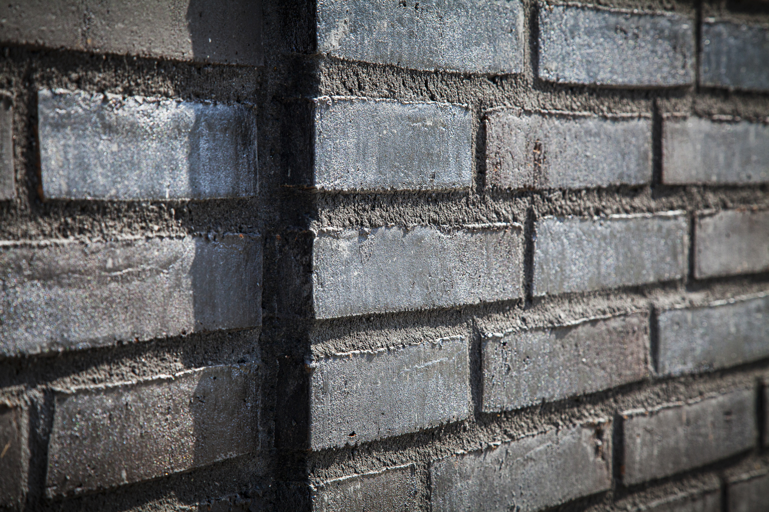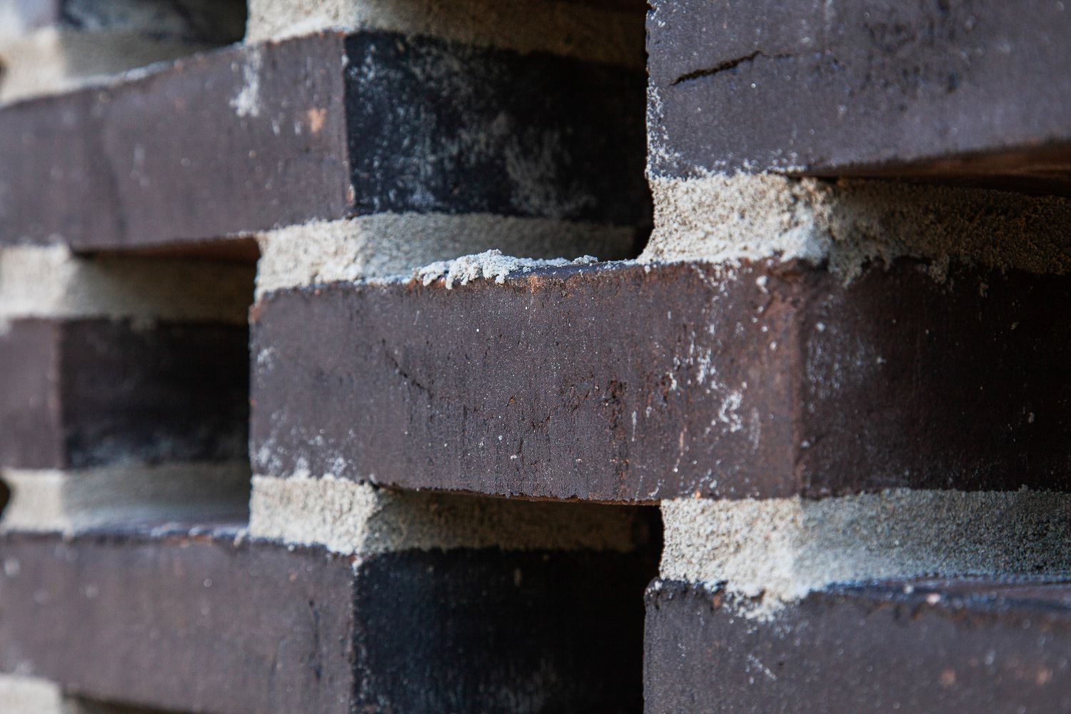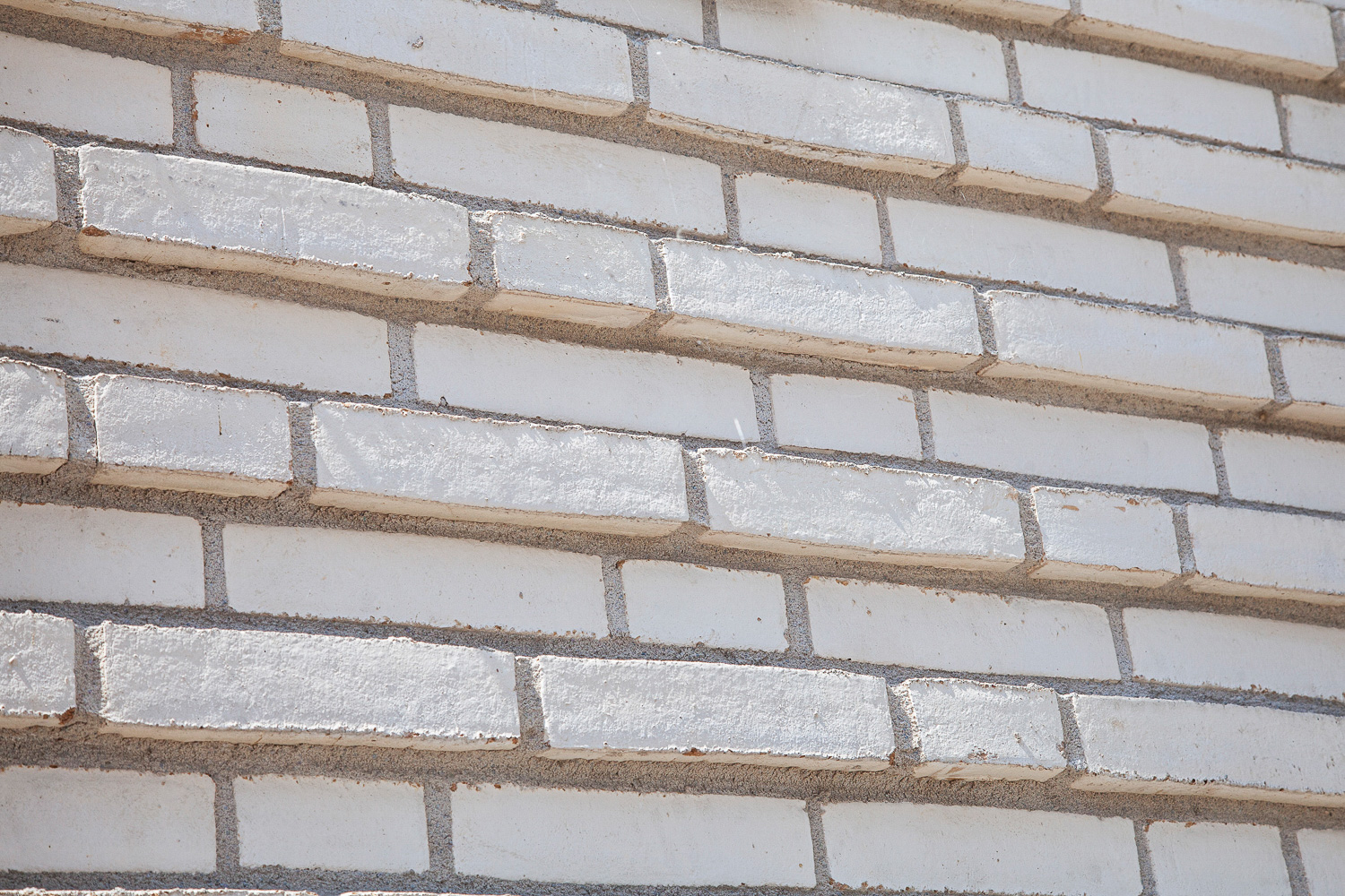 Tegelpelarna utgör en jämn rytm genom hela projektet där pelarbredden är dimensionerad efter tegelstenens format (två helstenar + kopp). Halvstensförband används konsekvent för att optimera tegelförbrukningen och minimera spill. Fogar är infärgade för att uppnå ett monokromt utseende.