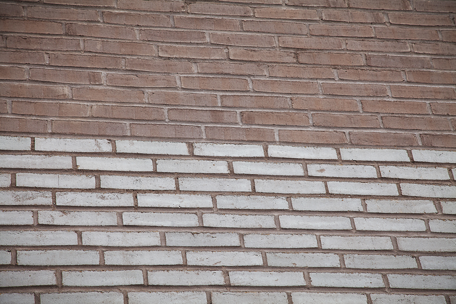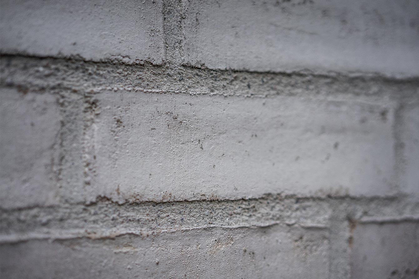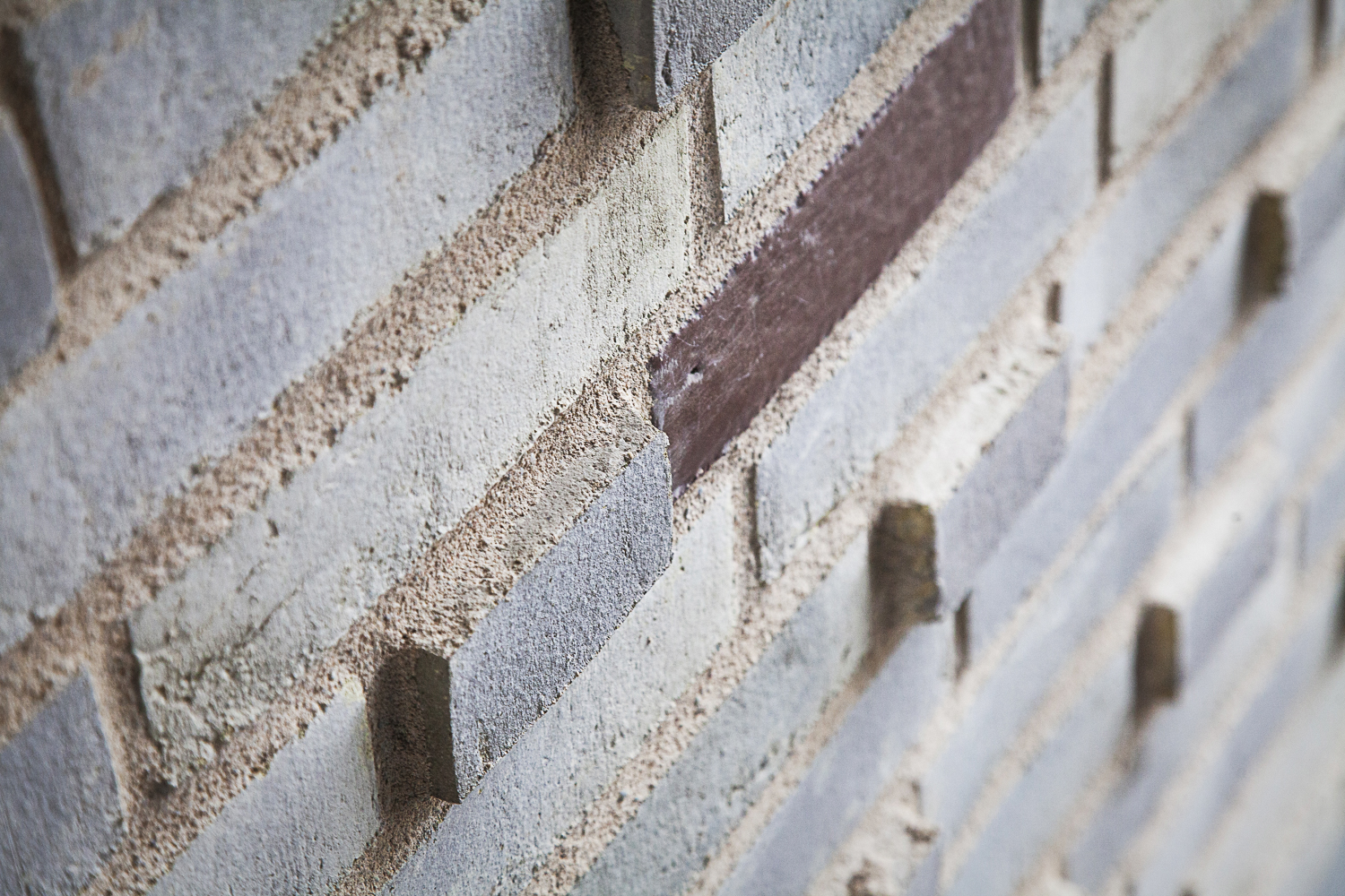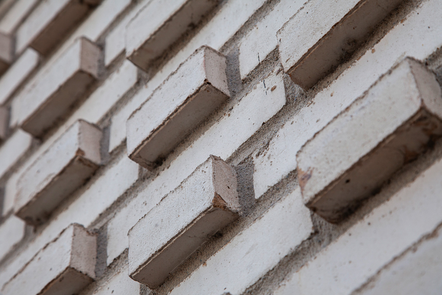 Tegelpelarna utgör en jämn rytm genom hela projektet där pelarbredden är dimensionerad efter tegelstenens format (två helstenar + kopp). Halvstensförband används konsekvent för att optimera tegelförbrukningen och minimera spill. Fogar är infärgade för att uppnå ett monokromt utseende.