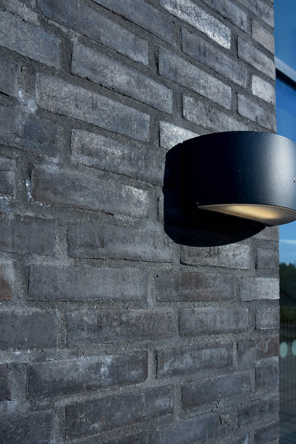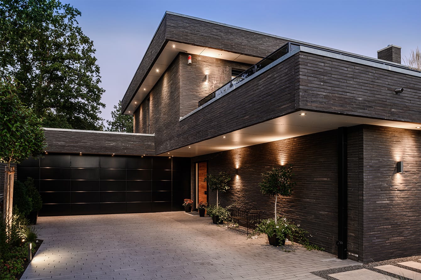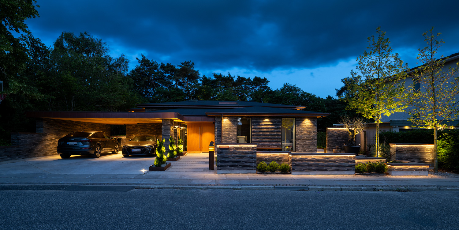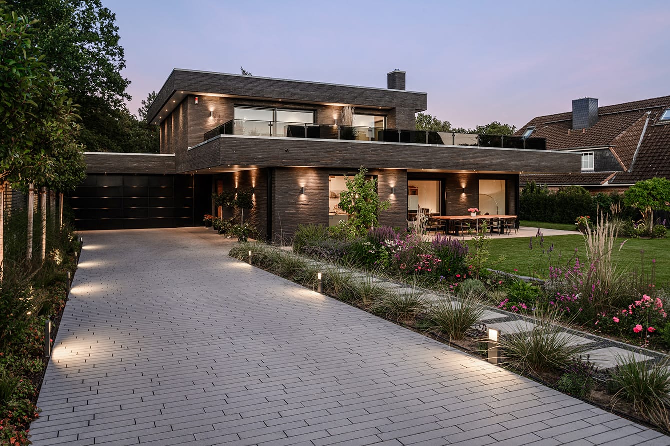 The combination of a broad driveway and parallel pathway elegantly lures visitors in for a closer look. The varying surface of light-bathed black RT 150 Ultima-bricks glooms at night.