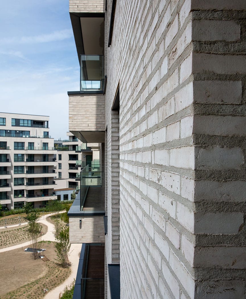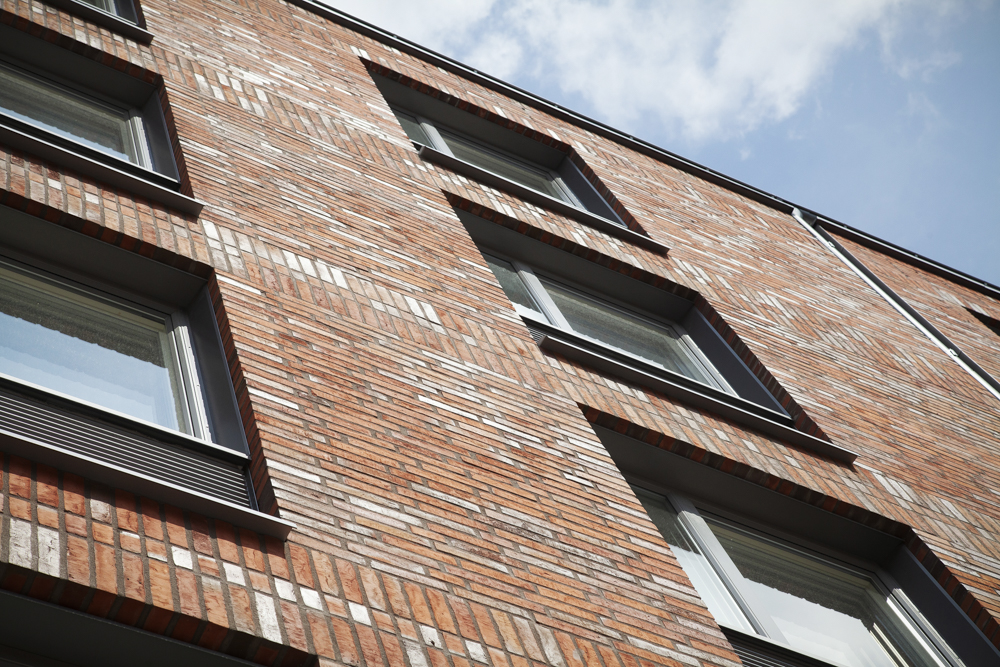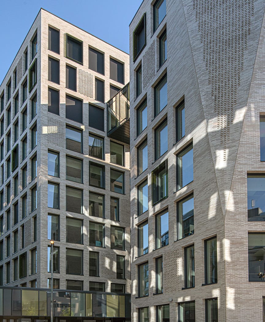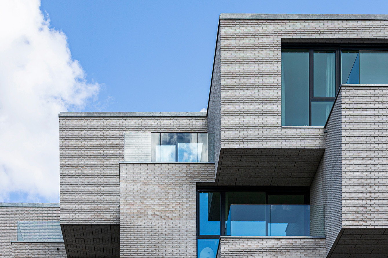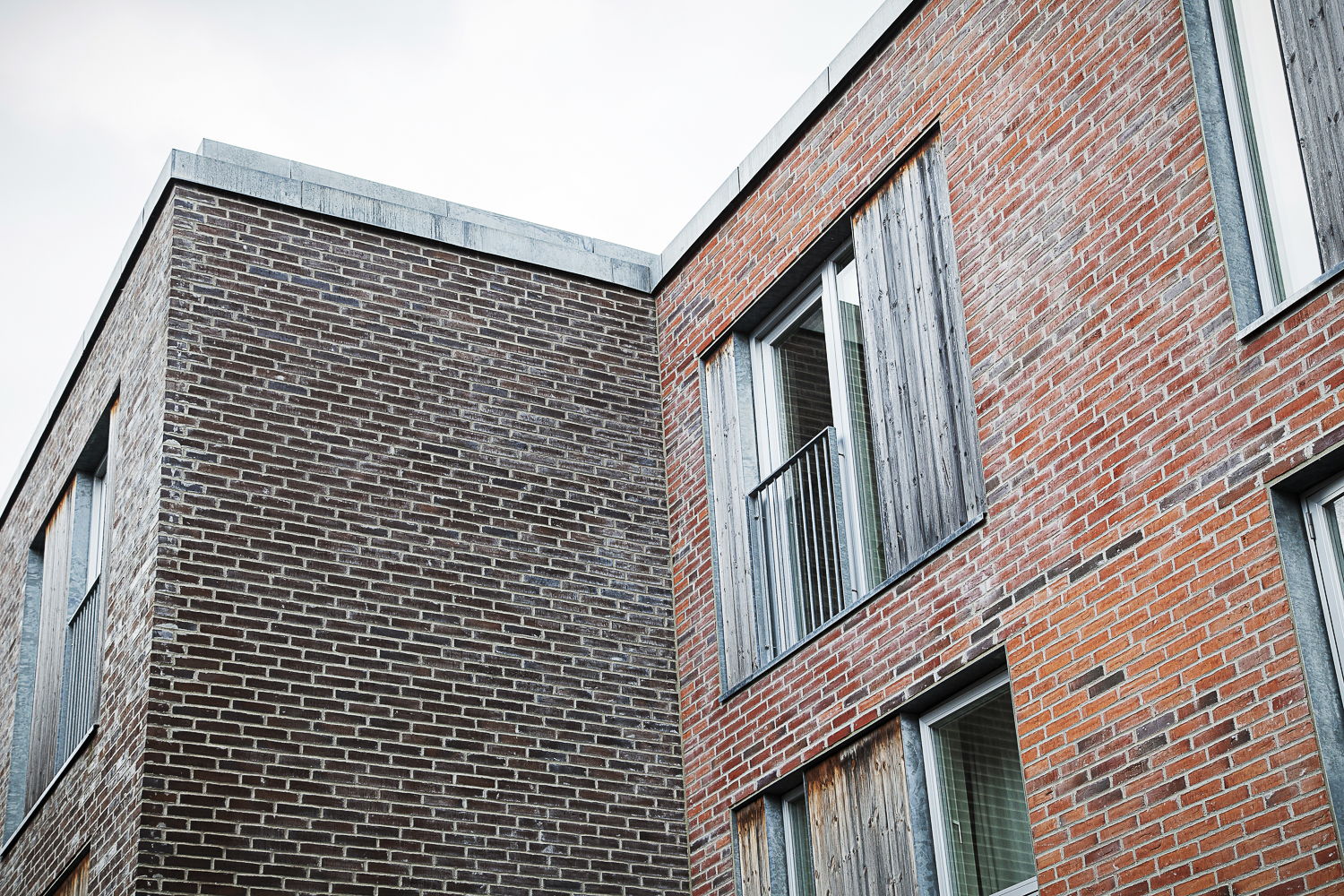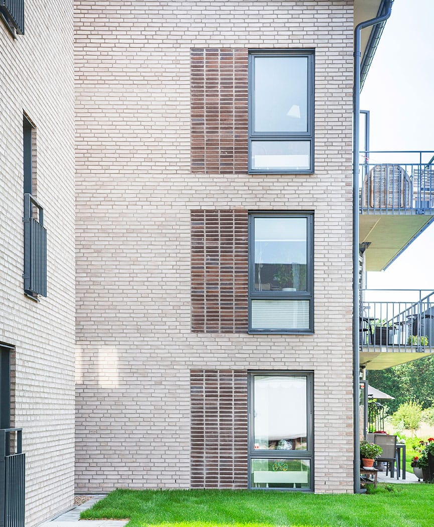 Apartments in irregular blocks combined with great craftmanship masonry and a beautiful brick colour toning in cold and warm sandy colours. Dark window frames and the minimalistic balcony rails frame a beautiful and unpretentious courtyard.