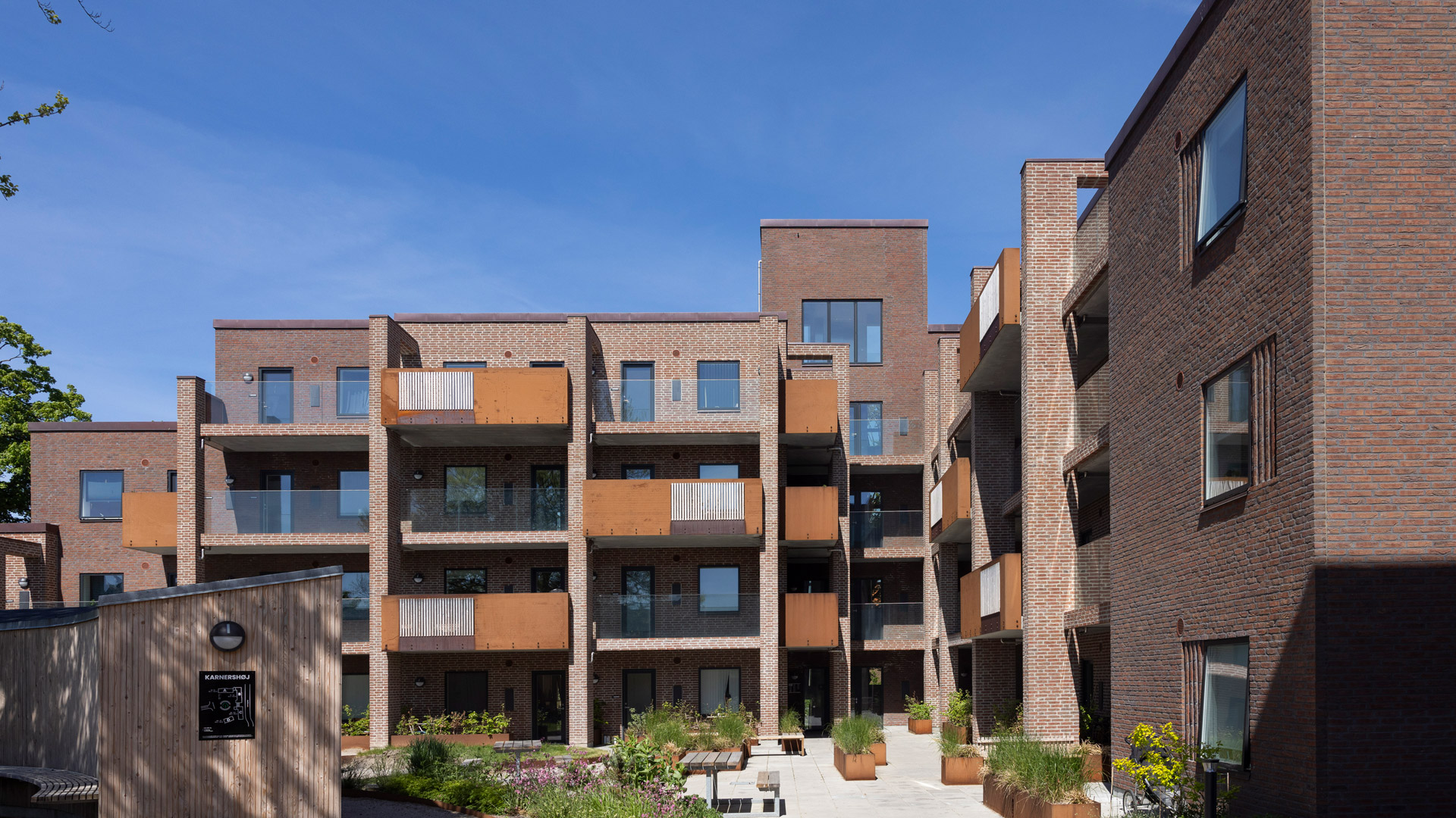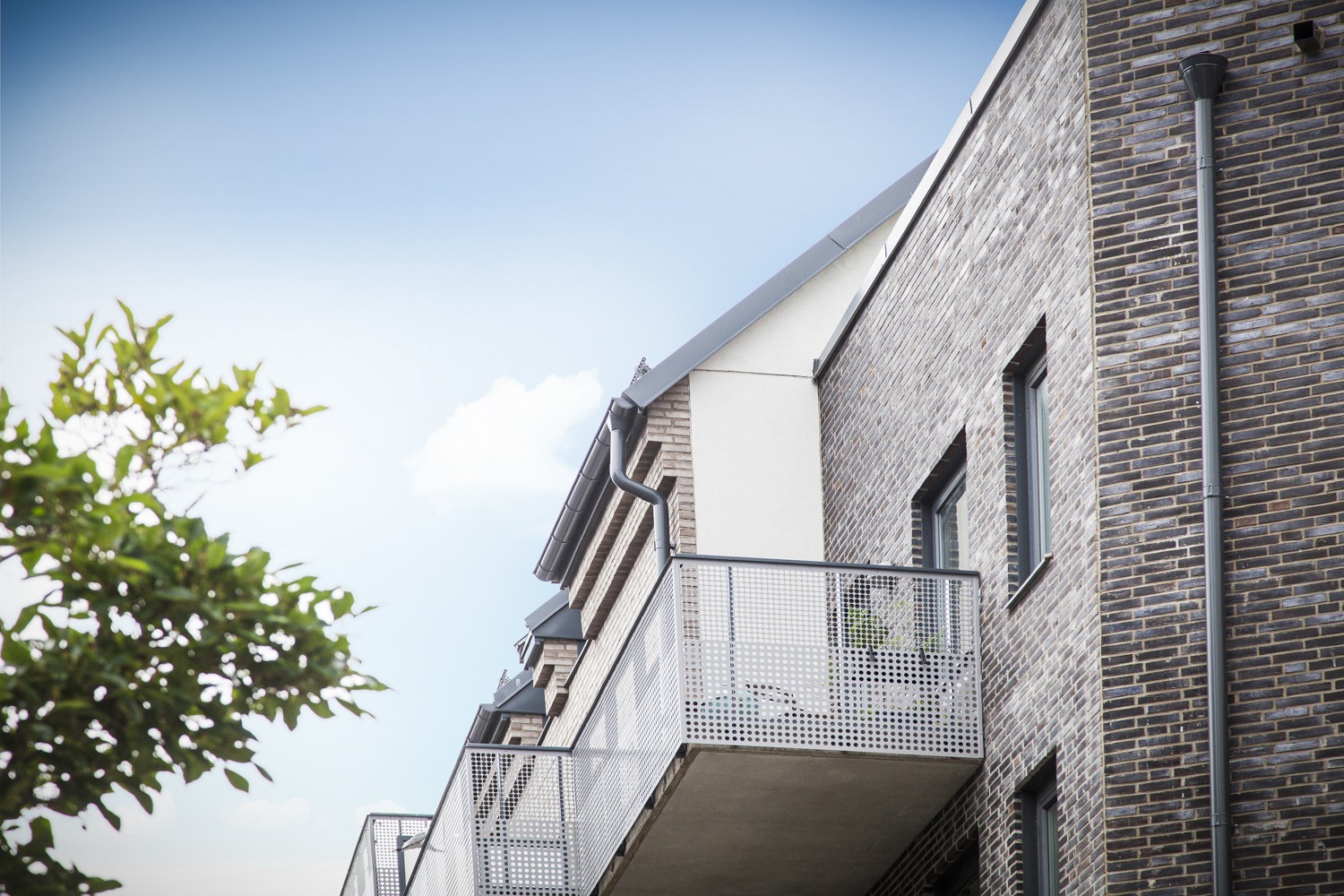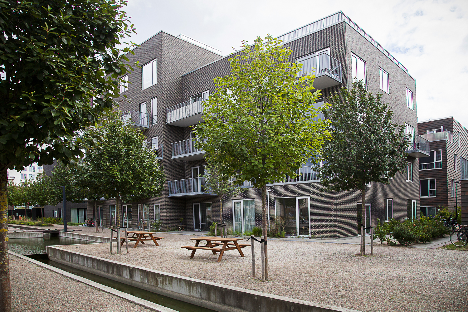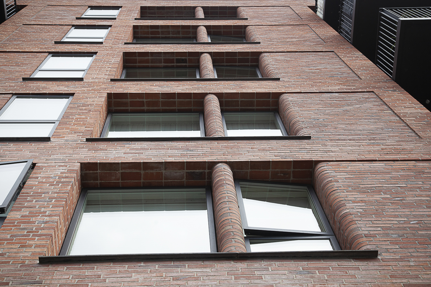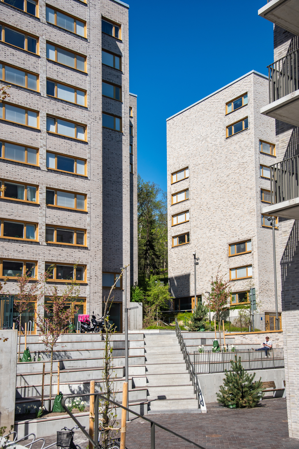 Apartments in irregular blocks combined with great craftmanship masonry and a beautiful brick colour toning in cold and warm sandy colours. Dark window frames and the minimalistic balcony rails frame a beautiful and unpretentious courtyard.
