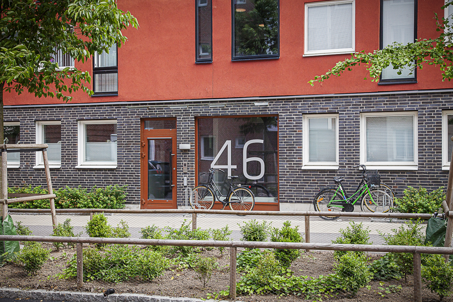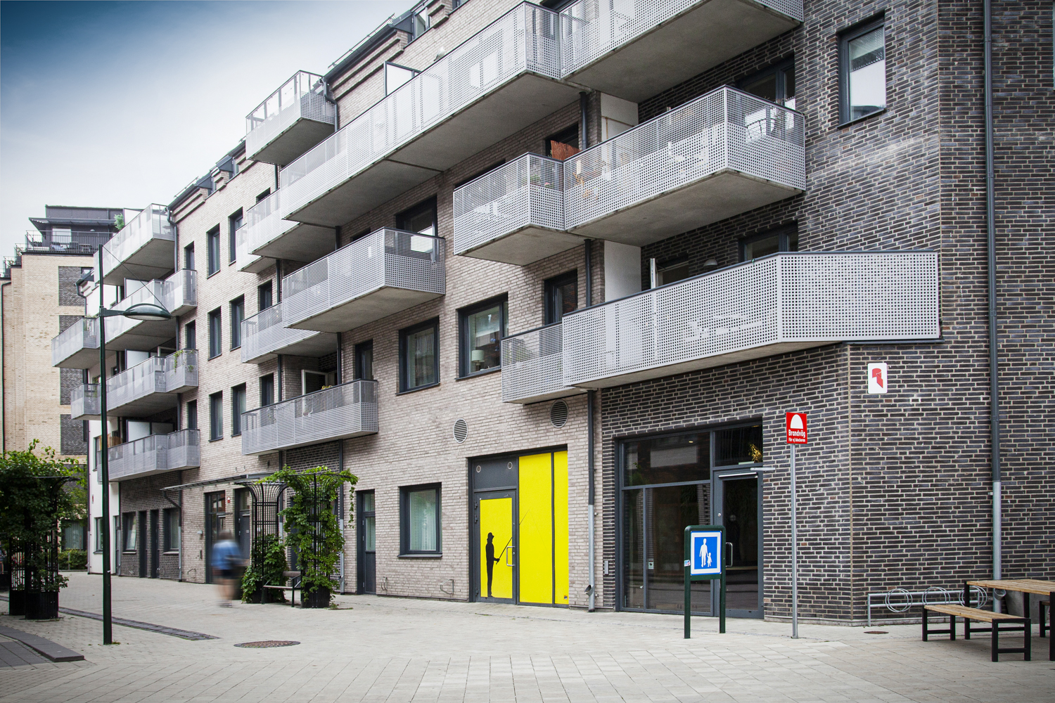 Runt entréerna till de nya bostadshusen möts besökarna av mönstermurningar och mönsterlagd marksten, något som skapar en inbjudande atmosfär och en känsla av välkomnande och det lilla extra för de boende.