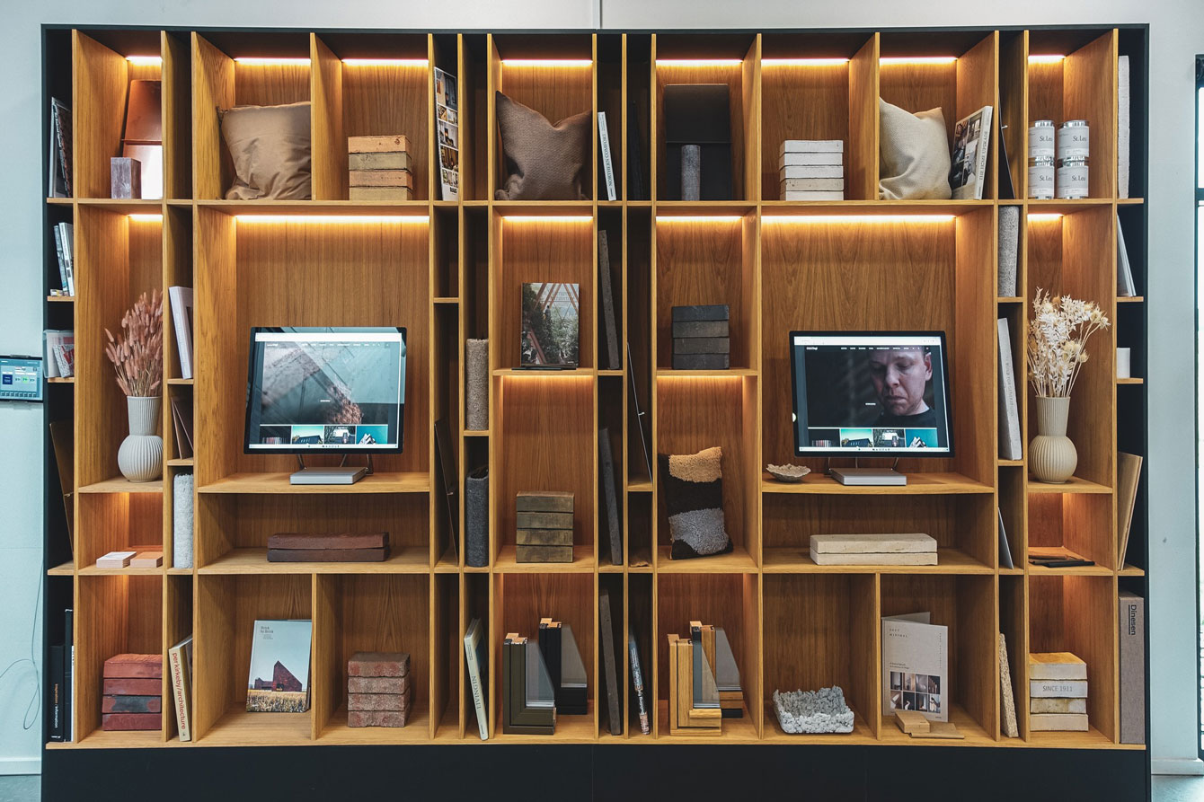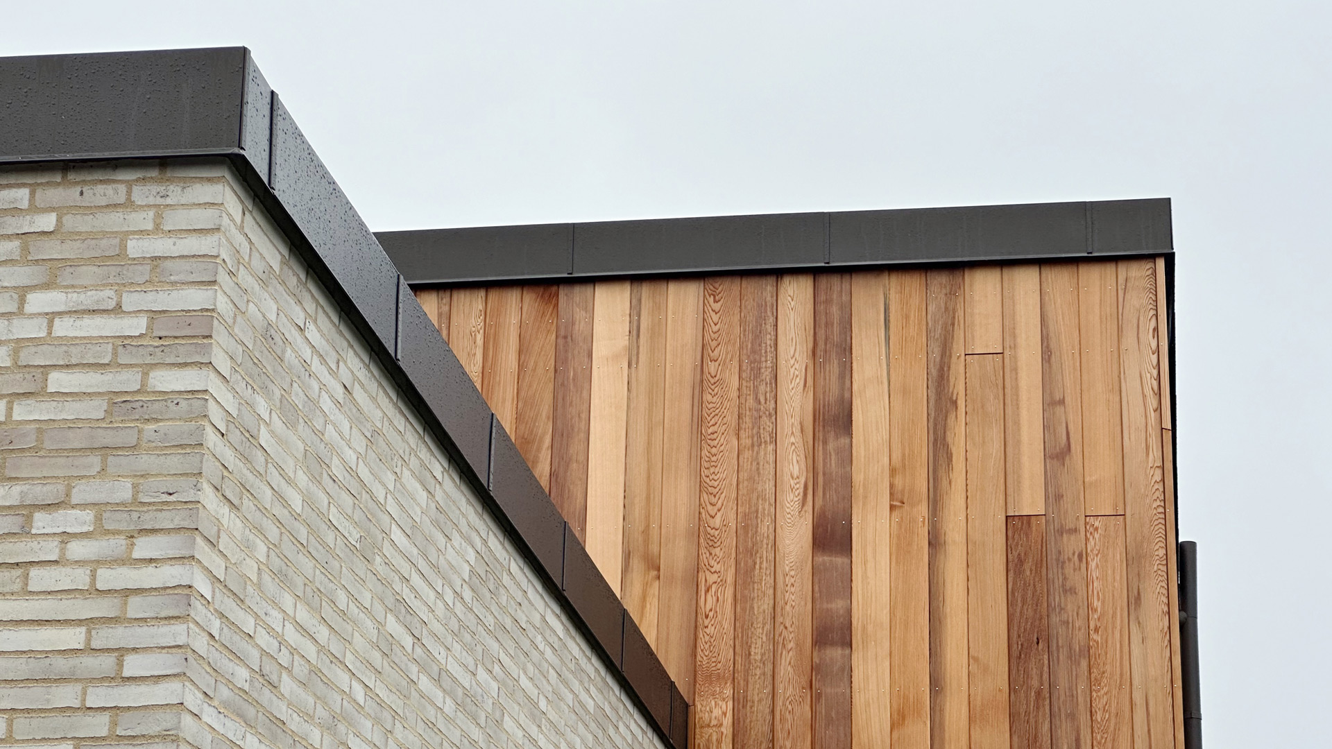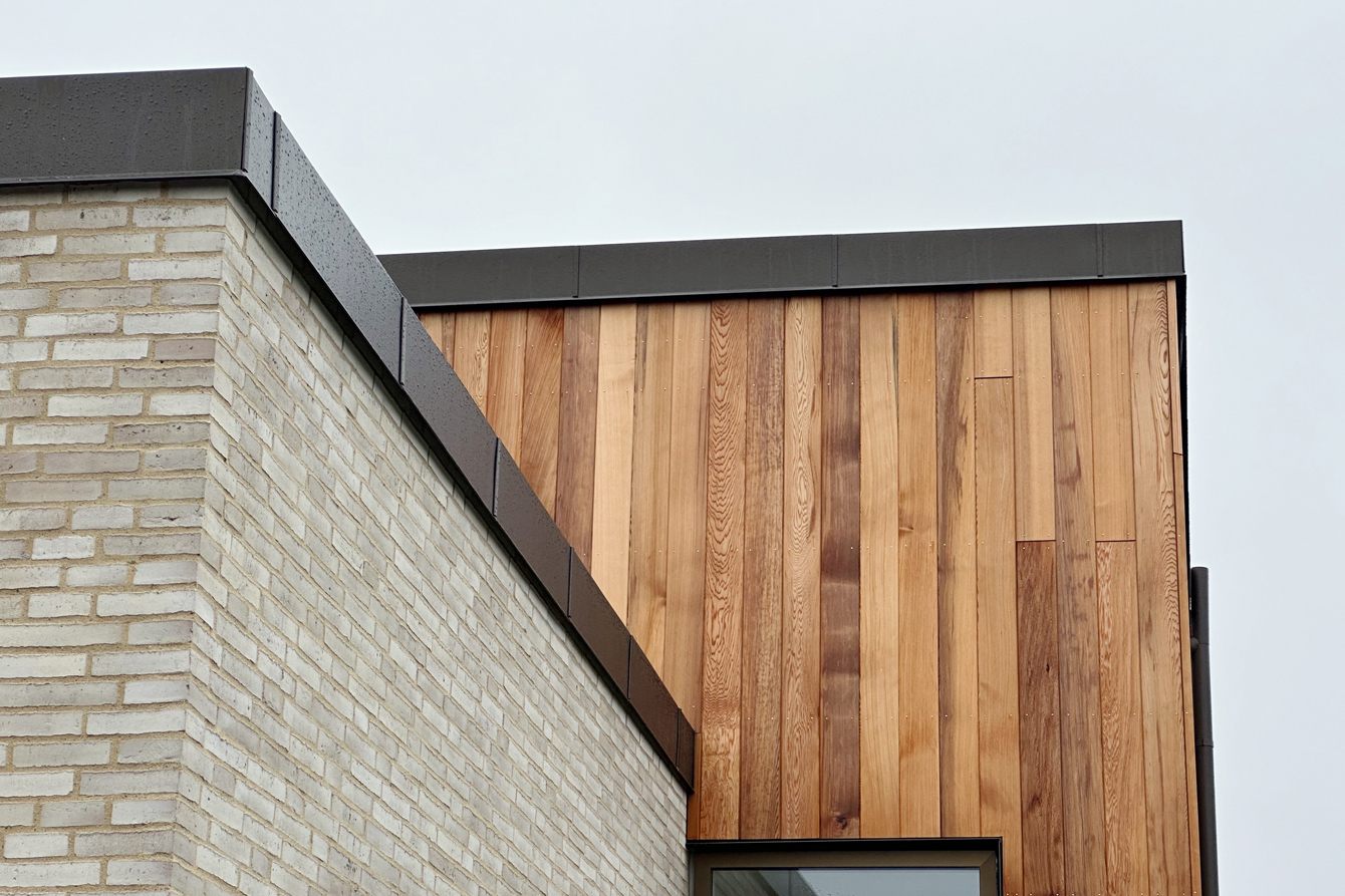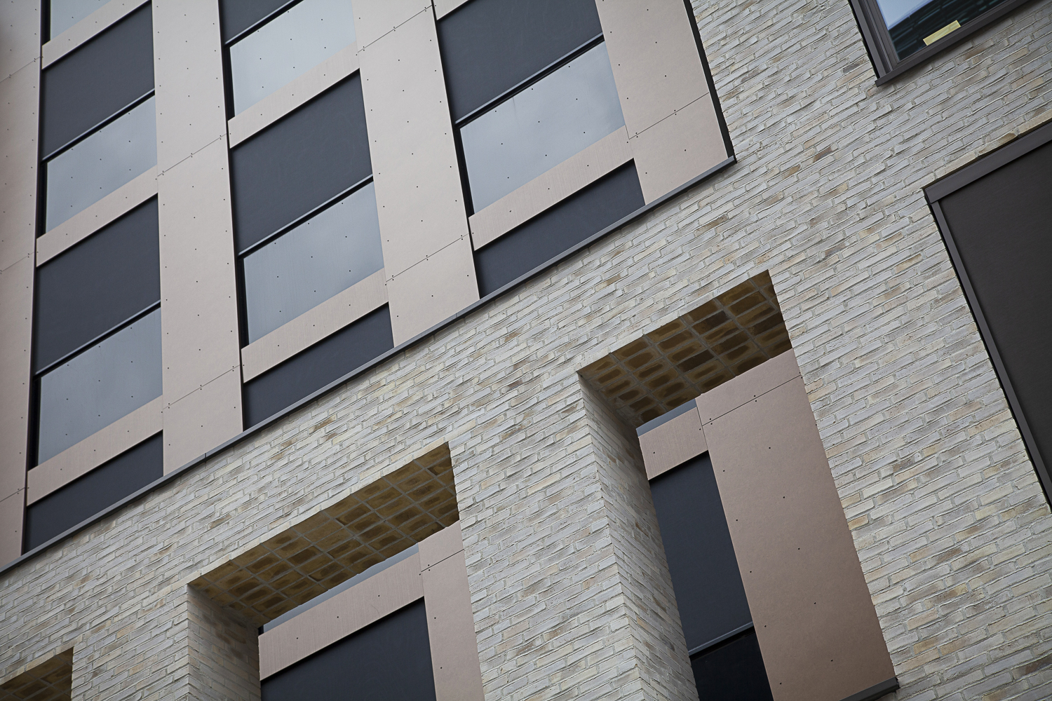 Materialerne spiller en nøglerolle; lyse mursten af typen Ultima RT 154 skaber et levende spil mellem lys og skygge, mens øverste etages patinerede kobberfacade tilføjer karakter og dybde. Træelementer supplerer det overordnede look og bringer varme til den minimalistiske æstetik.