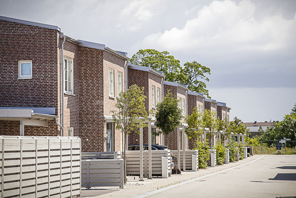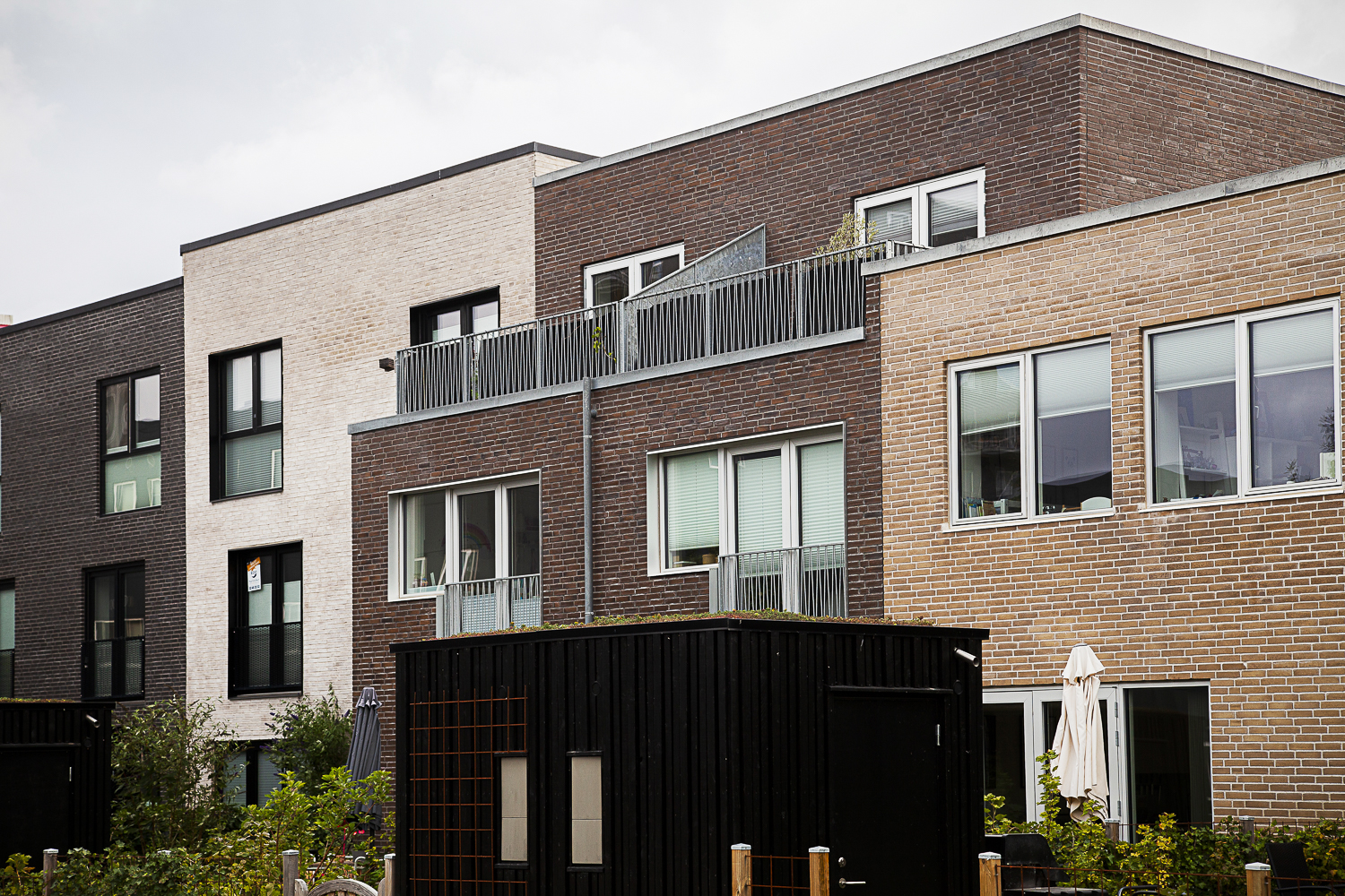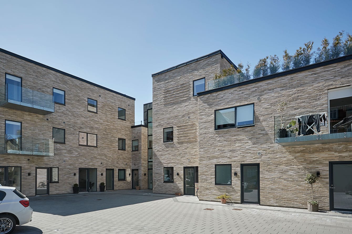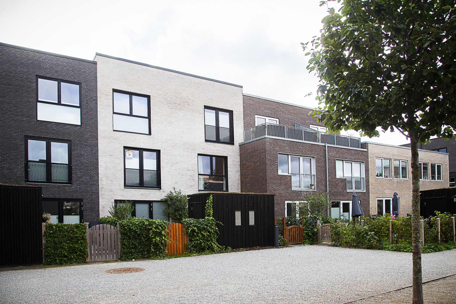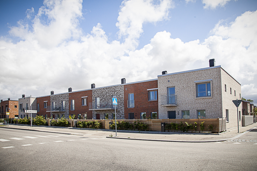 The project on the old skating ridge in Aalborg is located on the border between the old residential quarter with masonry villas from the 1920s along Bernstorffsgade and the Øgade district's 4-5-story long-houses from 1940-50s. The houses facing Bernstorffsgade are laid out as separate villas with their own carport, roof terrace and outdoor living spaces. In selected locations, relief masonry, along with balconies and window sections provide a facade variety and a human scale.