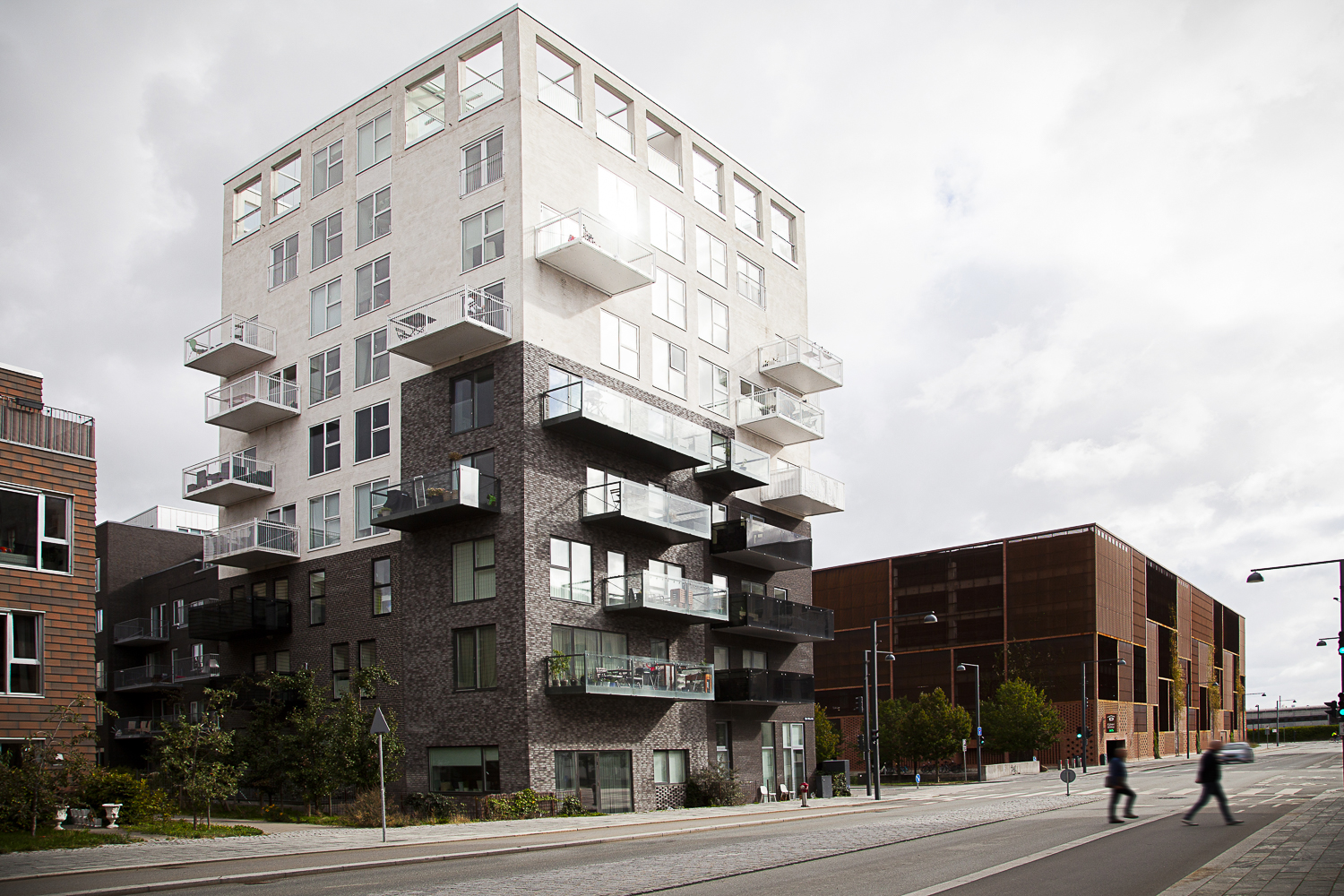 97 owner-occupied flats in Harbour Park, Copenhagen, Denmark. The architecture of the block has classical roots. Owing to its well-defined shape, the block has a recreational courtyard area offering optimum conditions for light and shelter from the wind. The large scale of the building is broken down into smaller elements by means of a variety of façade materials and changes in elevation from 4 to 6 stories.