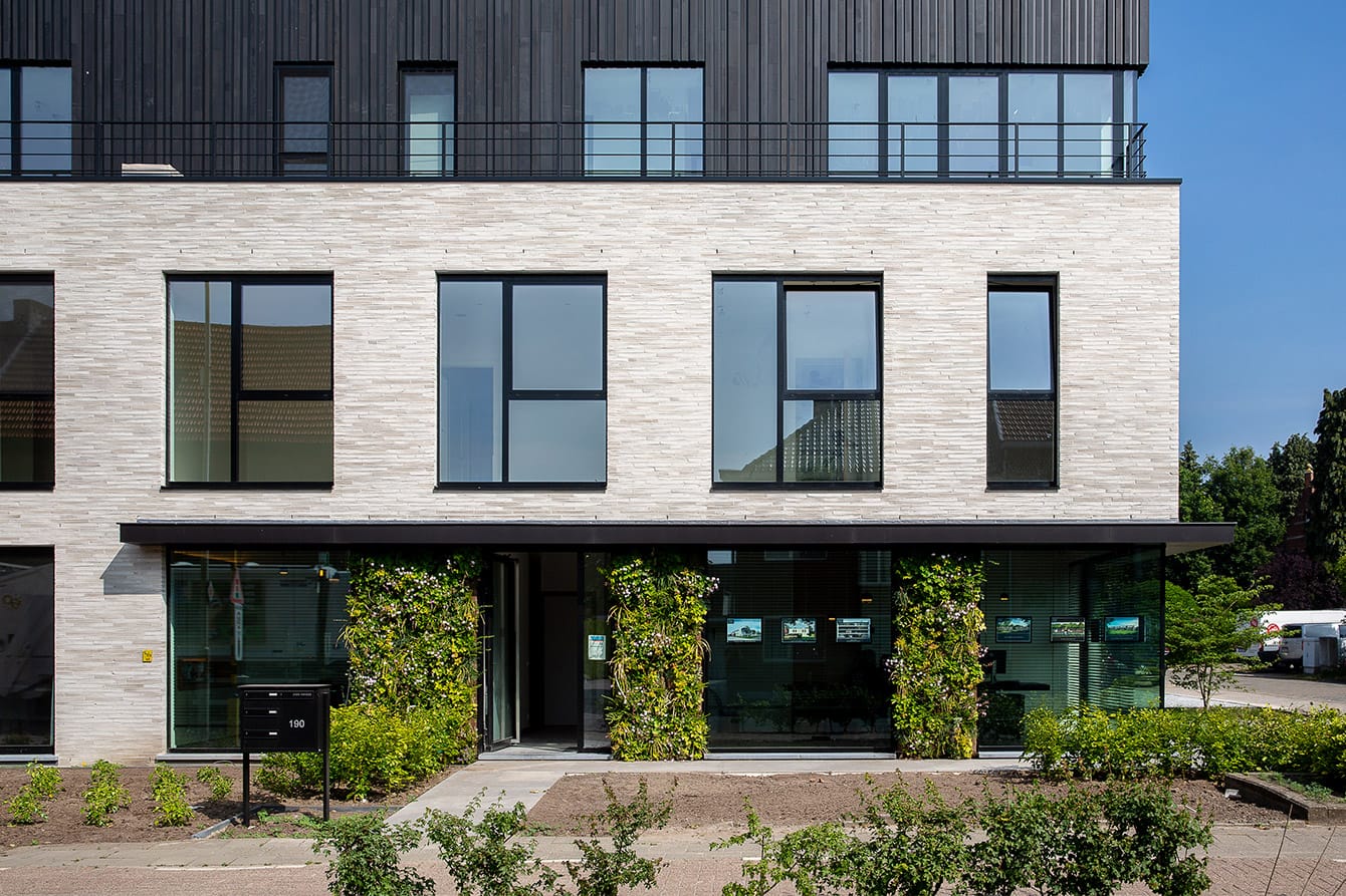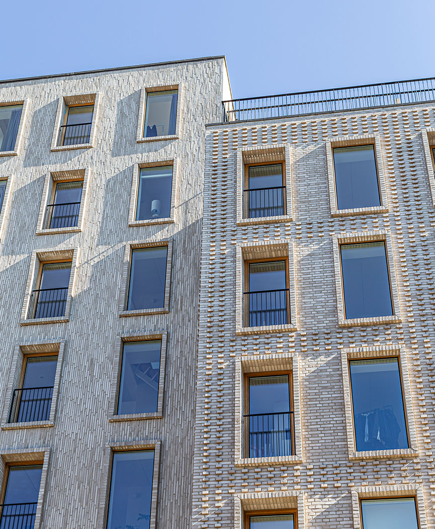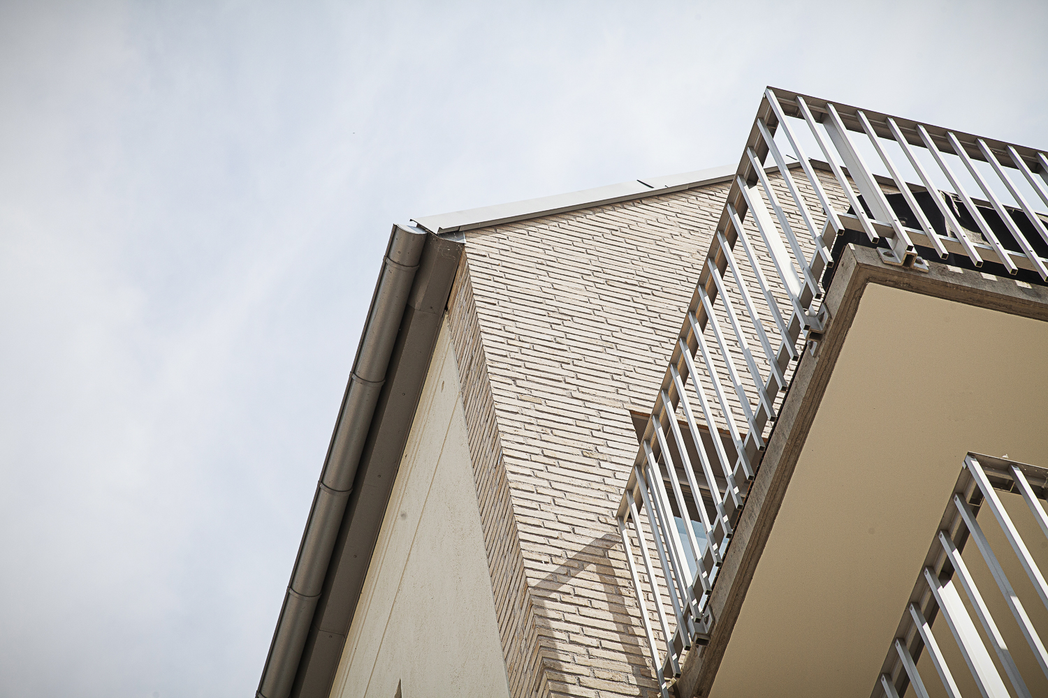 Exclusive apartment building with generous balconies overlooking a collective courtyard. Prima Lucca-bricks give this facade a fresh and modern look with shades of off-white and light-tinted yellow.