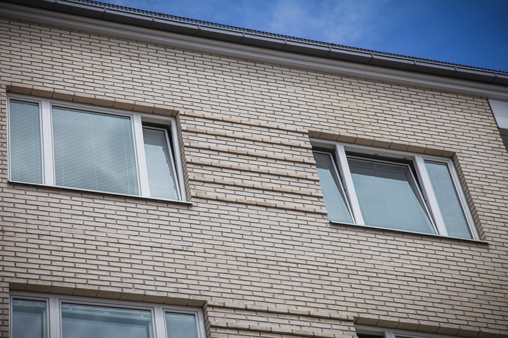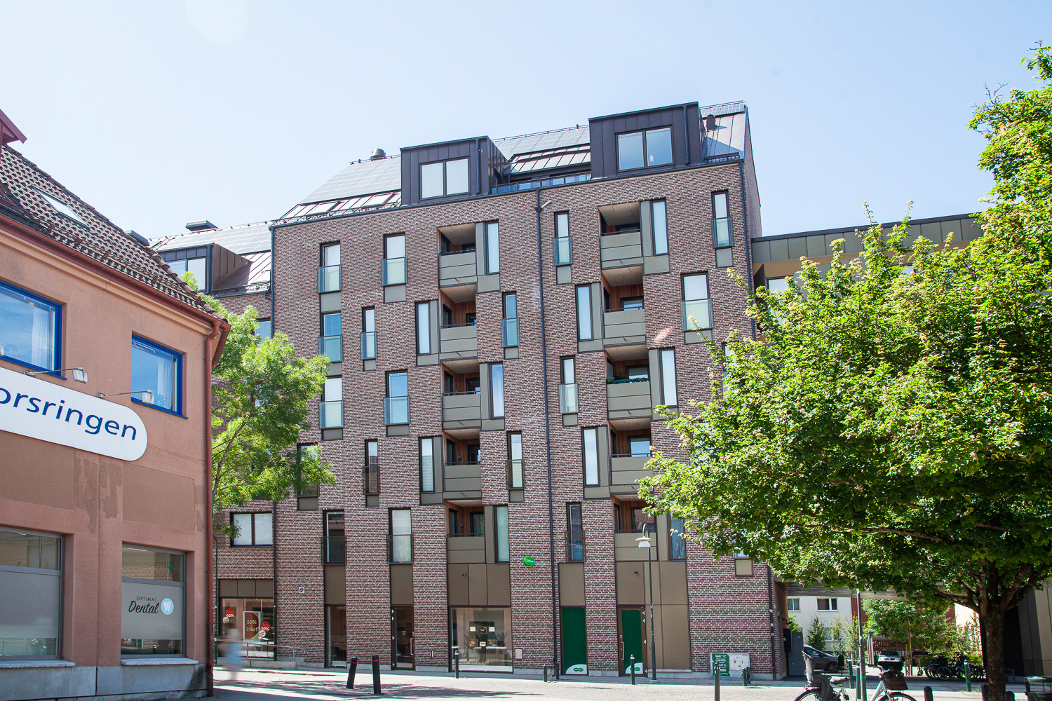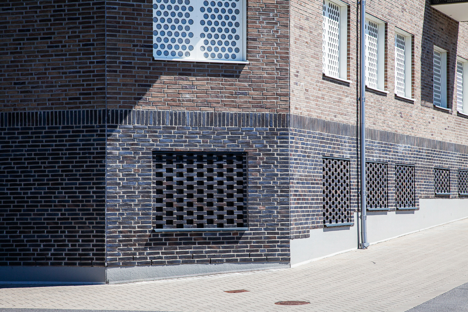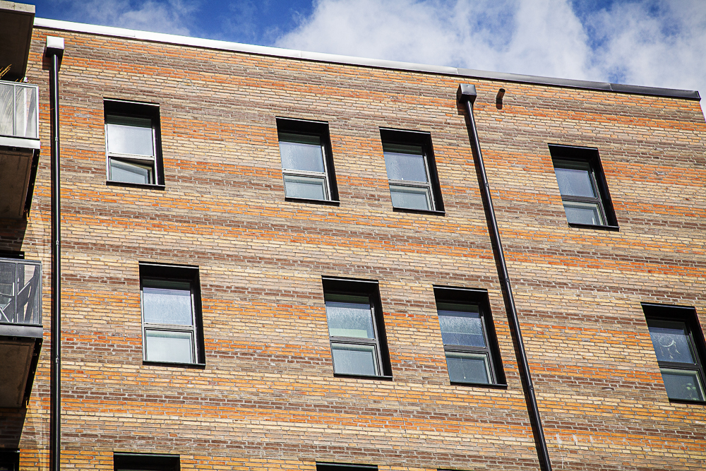 Kvarteret pryds av en generös tegelfasad som lockar betraktarens öga. Tre olika tegelfärger bryter av och delar in fasaden, vilket ger en varierad visuell upplevelse.