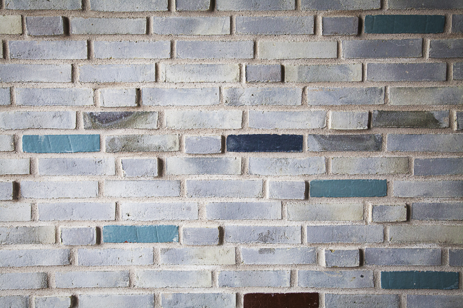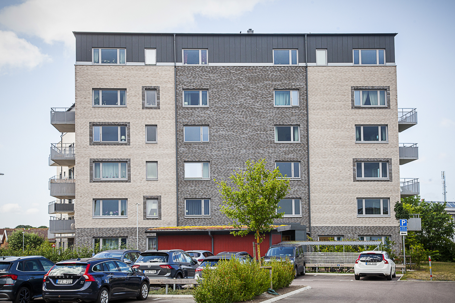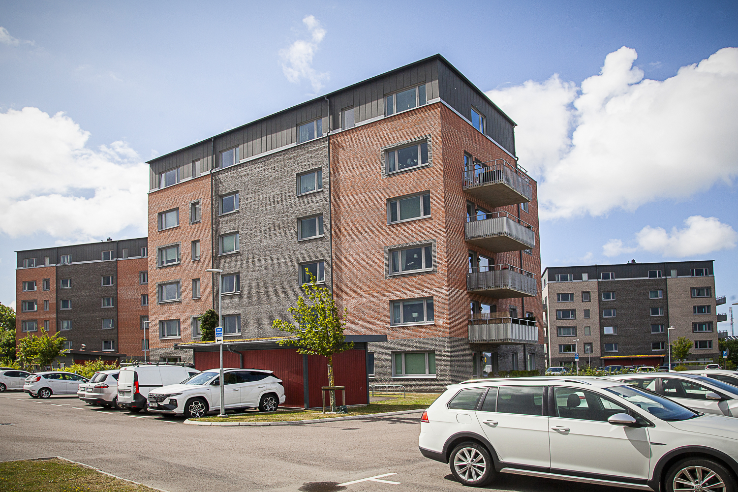 Kvarteret pryds av en generös tegelfasad som lockar betraktarens öga. Tre olika tegelfärger bryter av och delar in fasaden, vilket ger en varierad visuell upplevelse.