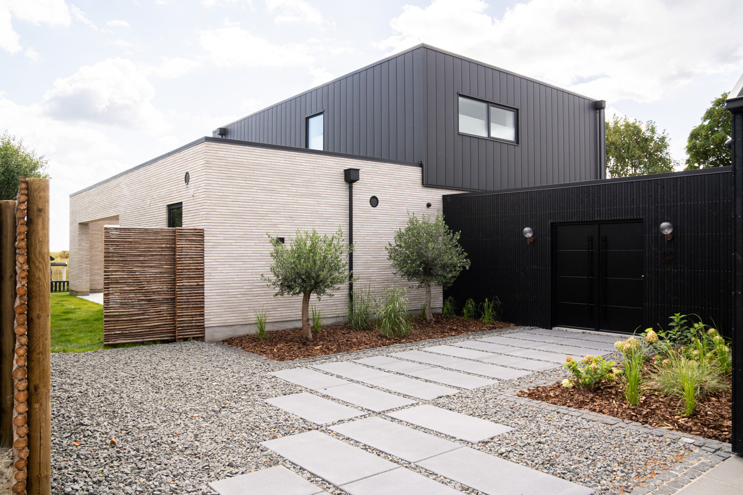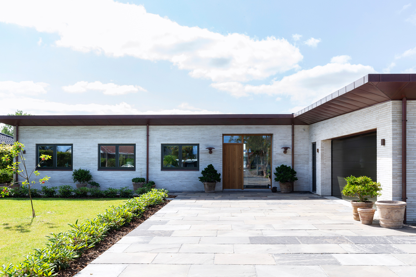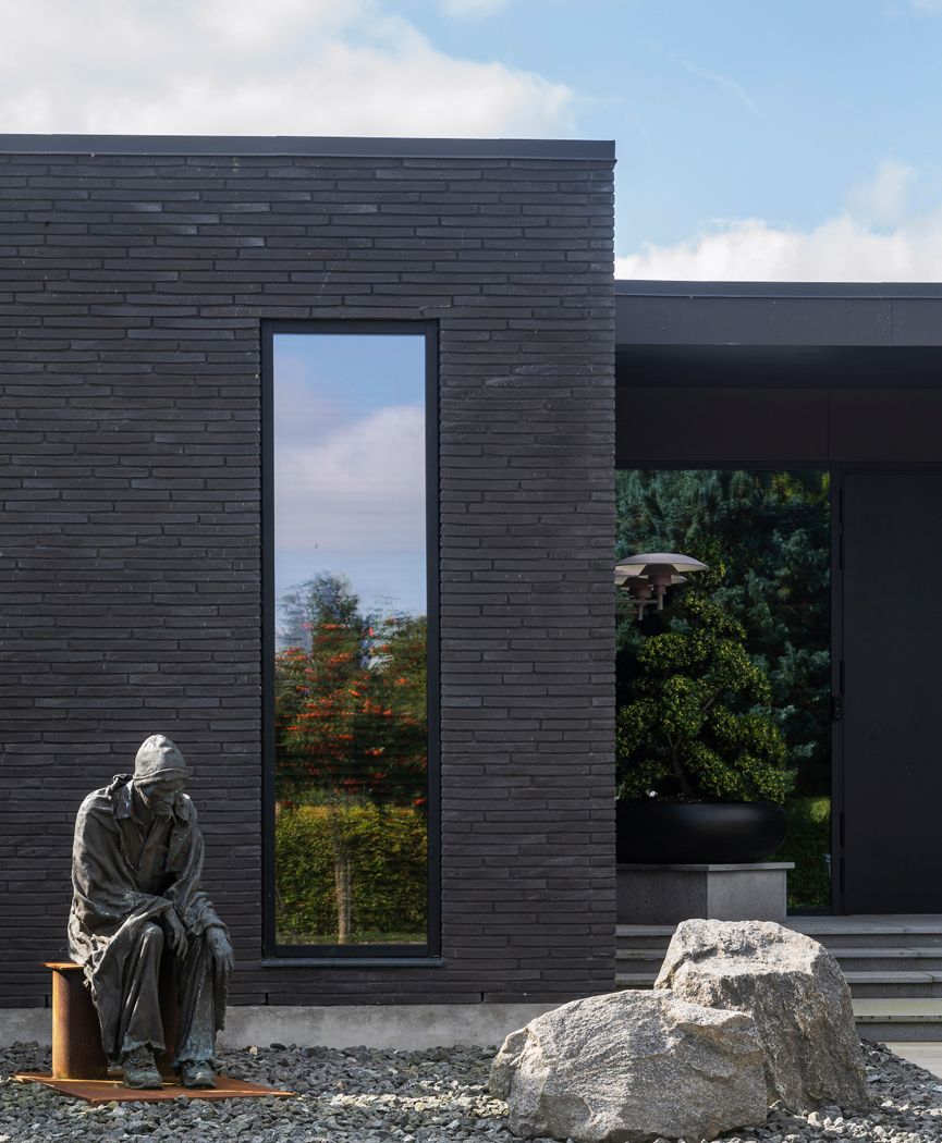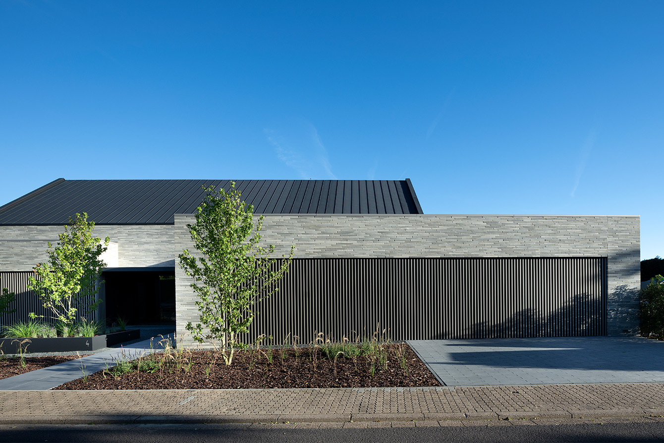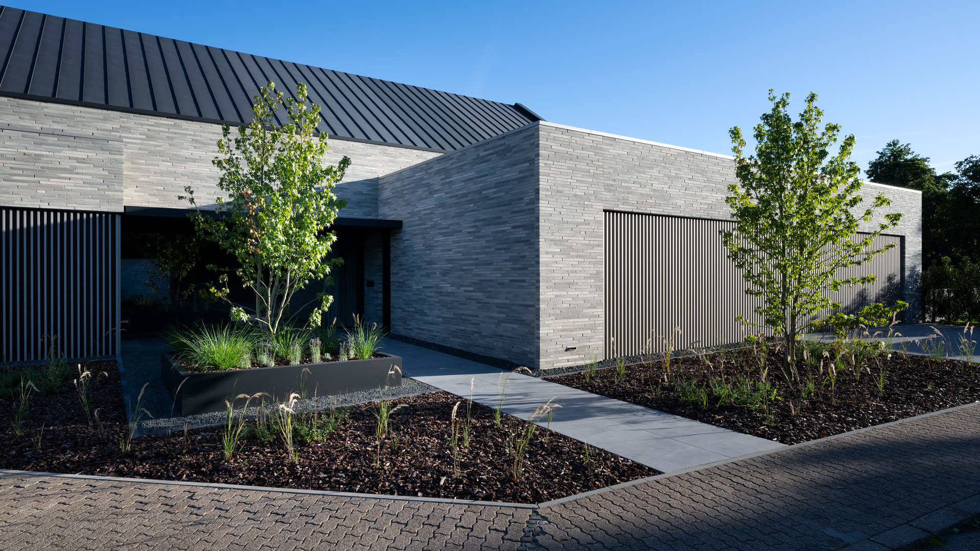 This contemporary gem is tight in every detail. Defining straight lines unfold across the project from leading elements such as the horizontal bond of extra-long format bricks and the position of large window sections. It is even present in the choice of ornamental grasses in front of the house.