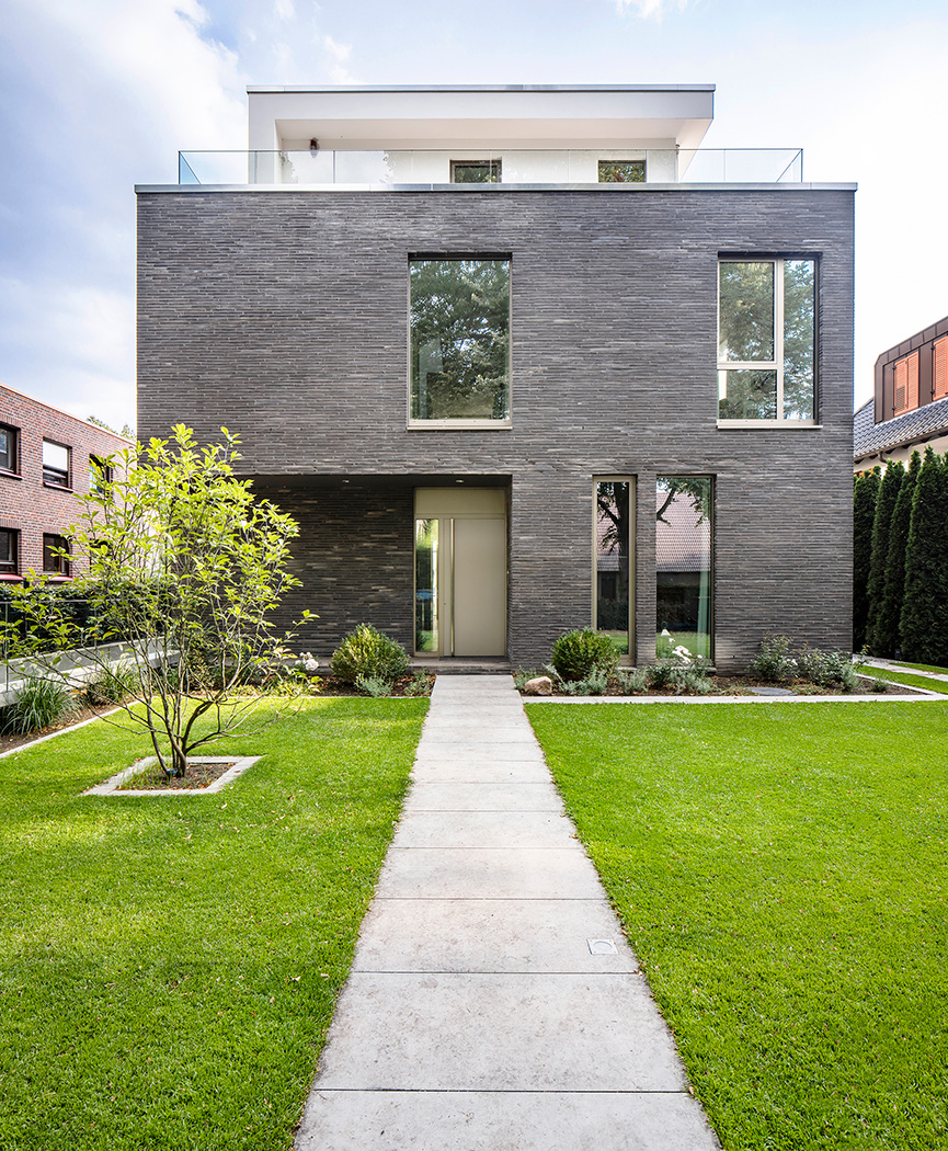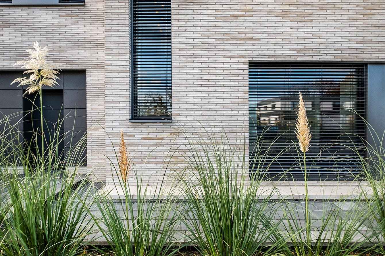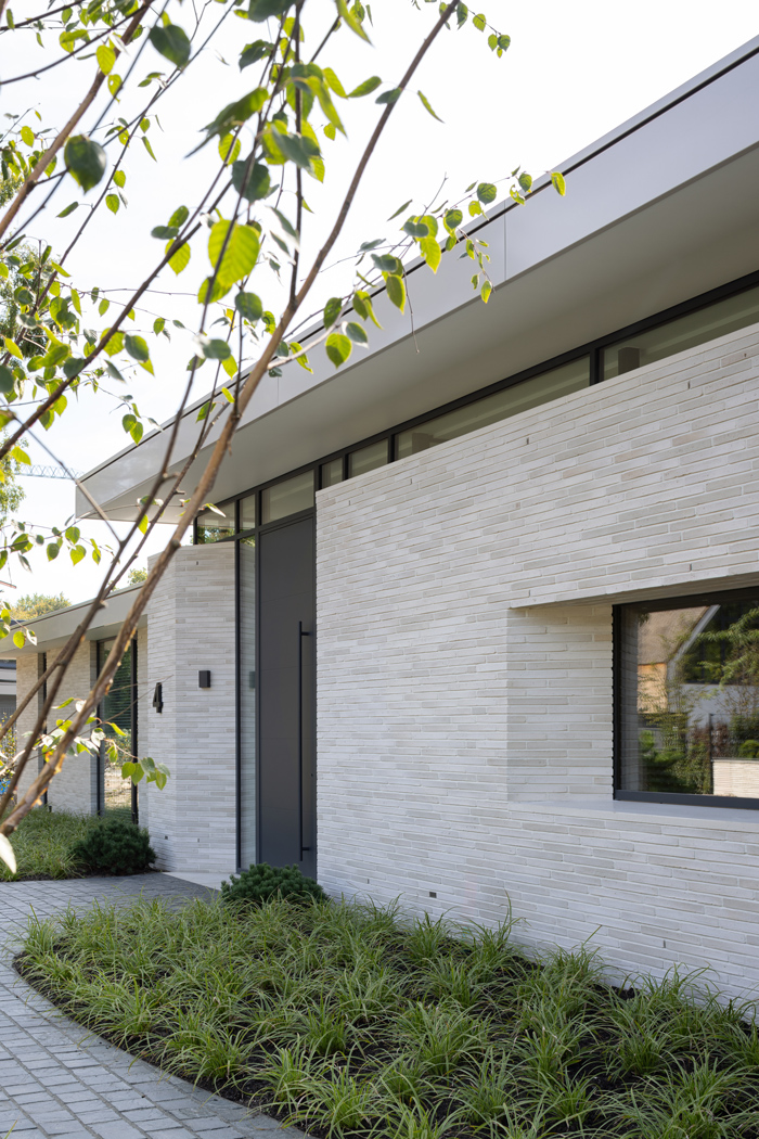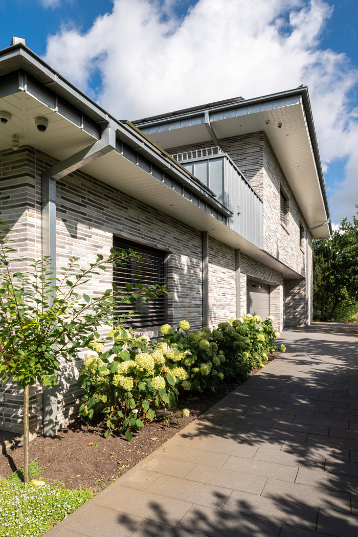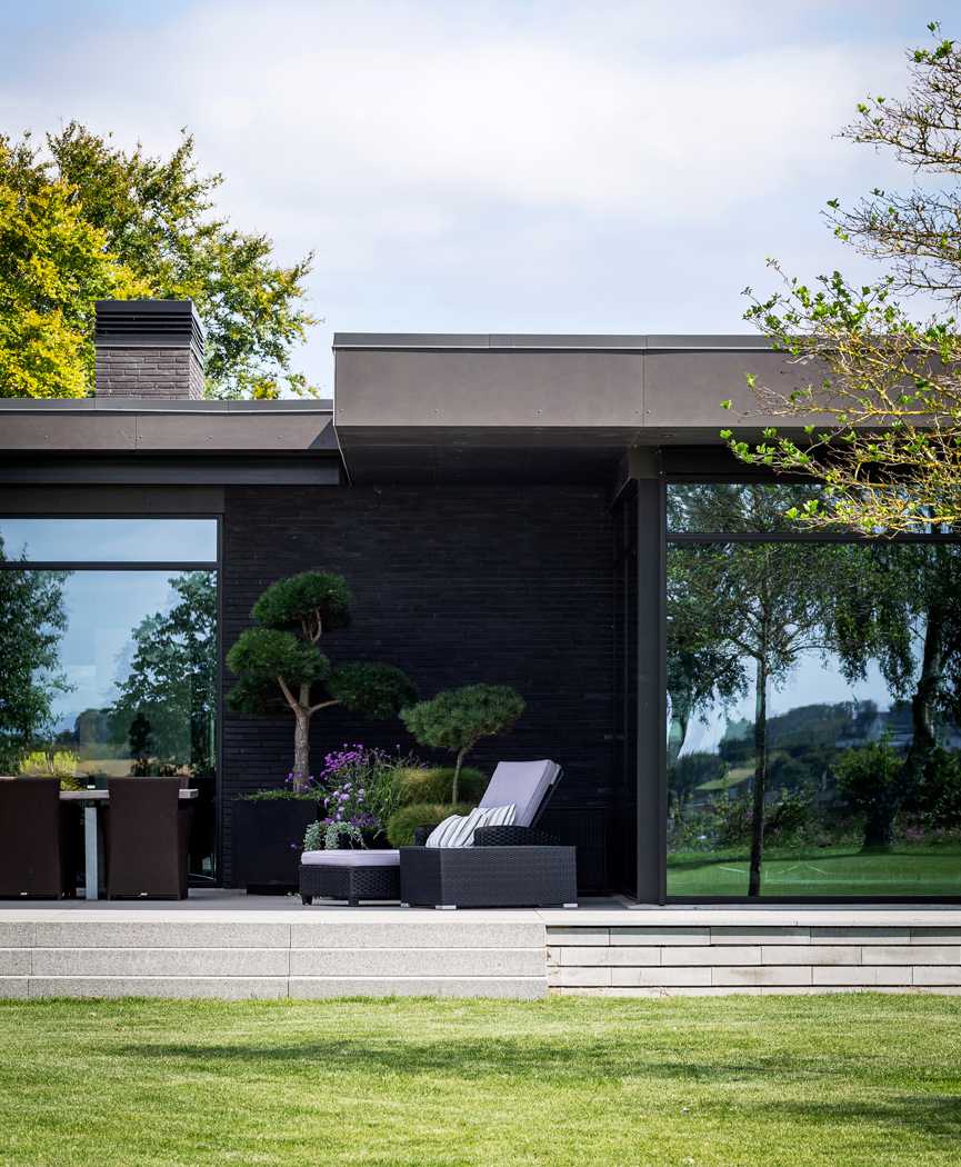 This contemporary gem is tight in every detail. Defining straight lines unfold across the project from leading elements such as the horizontal bond of extra-long format bricks and the position of large window sections. It is even present in the choice of ornamental grasses in front of the house.