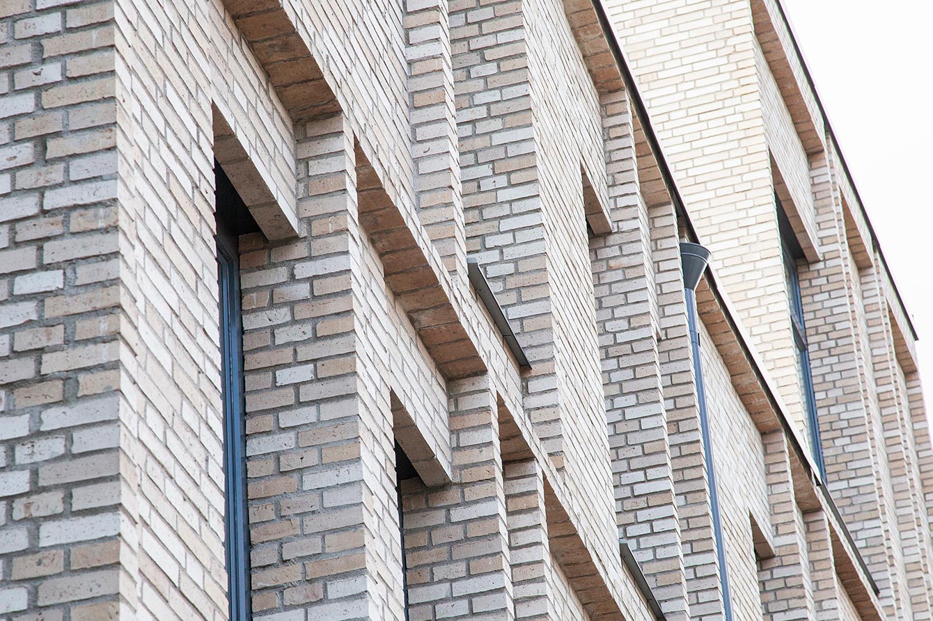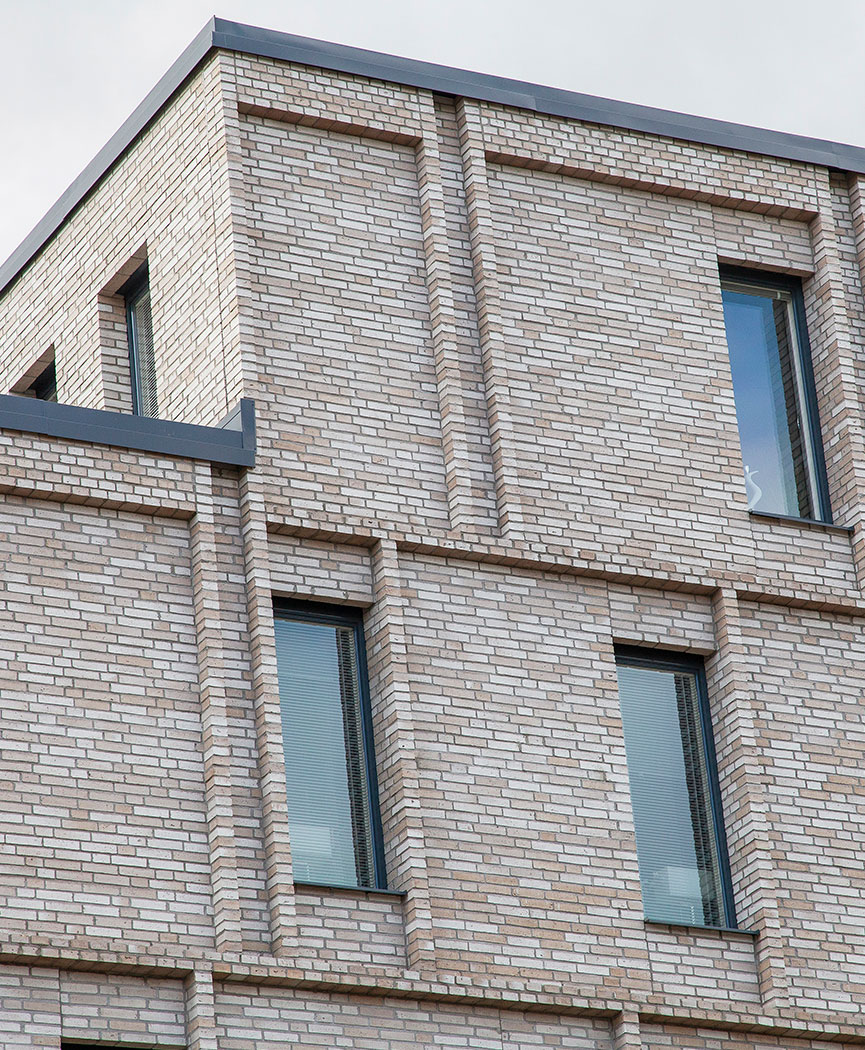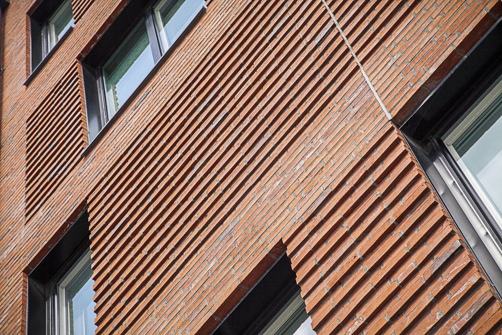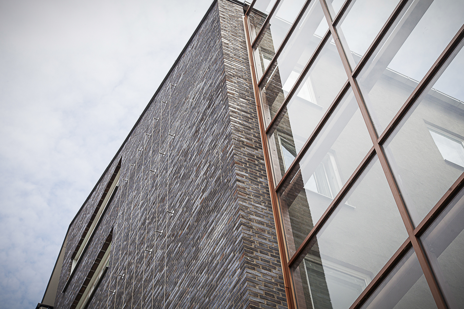 Förutsättningarna för projektet var en väldigt långsmal och utmanande tomt. Av den anledningen har byggnaden delats upp i fem huvudvolymer. Tre helt i tegel och två mellanliggande volymer i skärmtegel. Skärmteglet är återkommande i tegelvolymernas fönsterband.